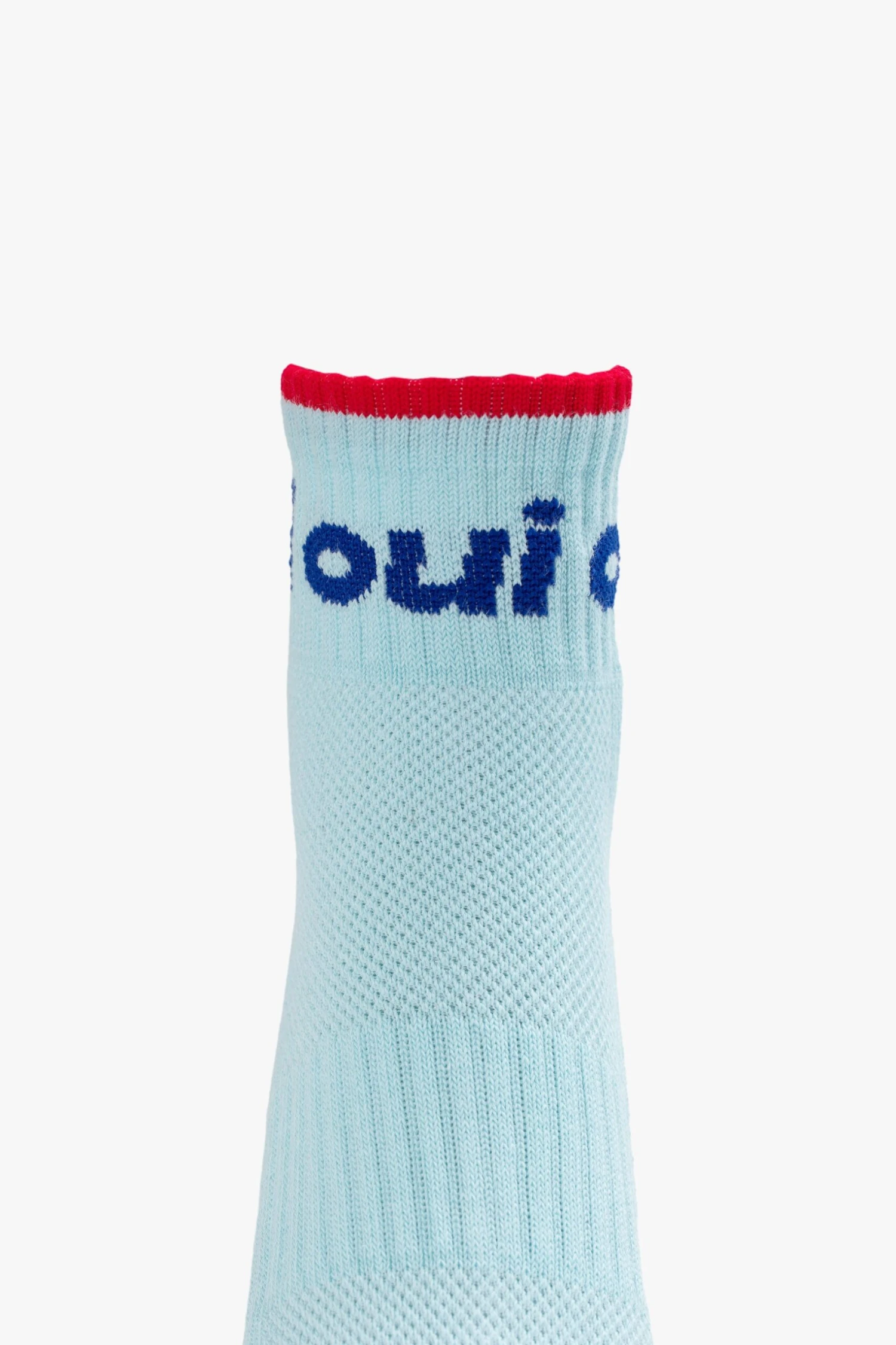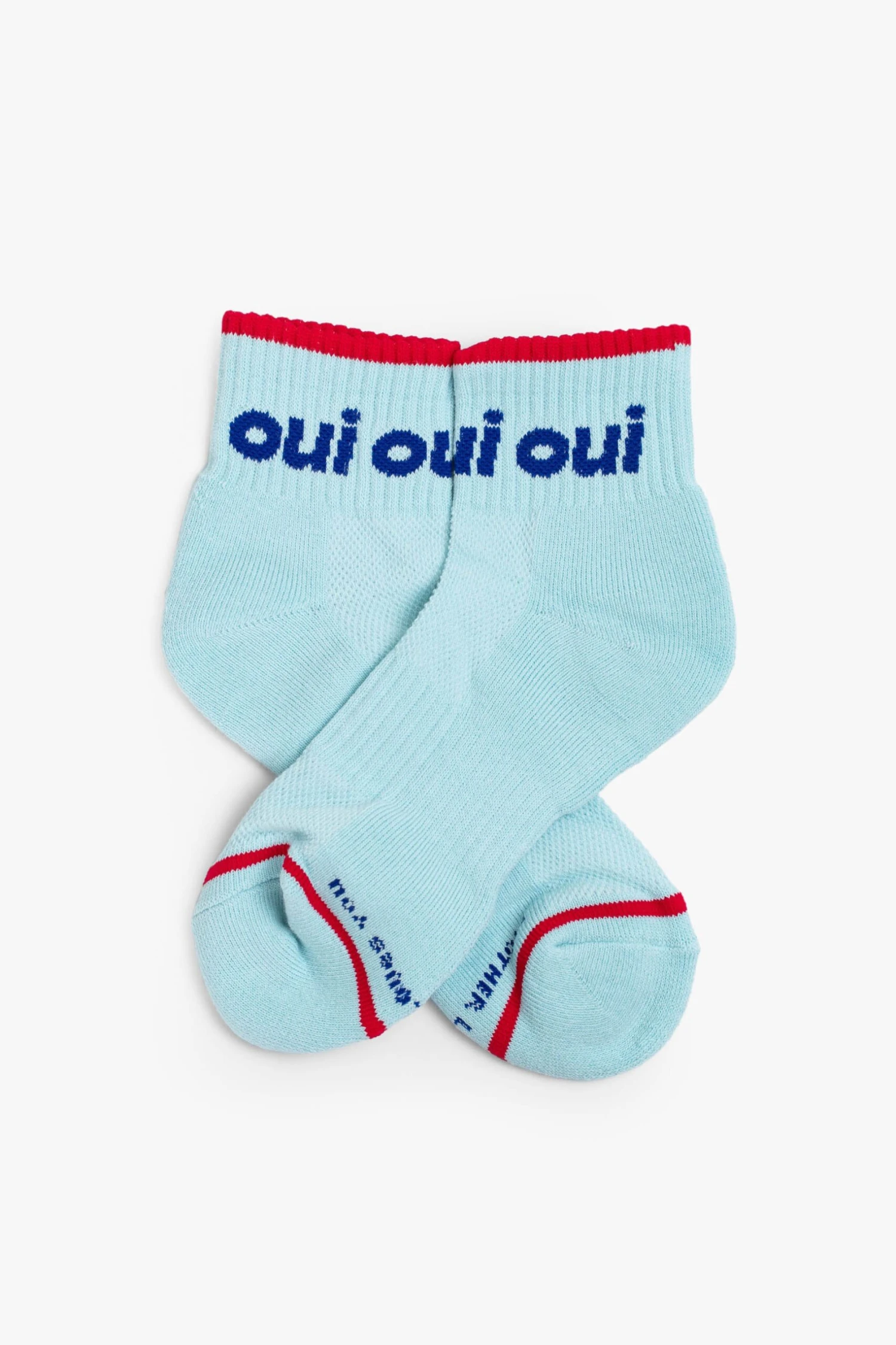Yes, please. Ankle-length tube socks with a classic expression in French. Shown here in light blue with navy text and red details. Speaking MOTHER’s language.