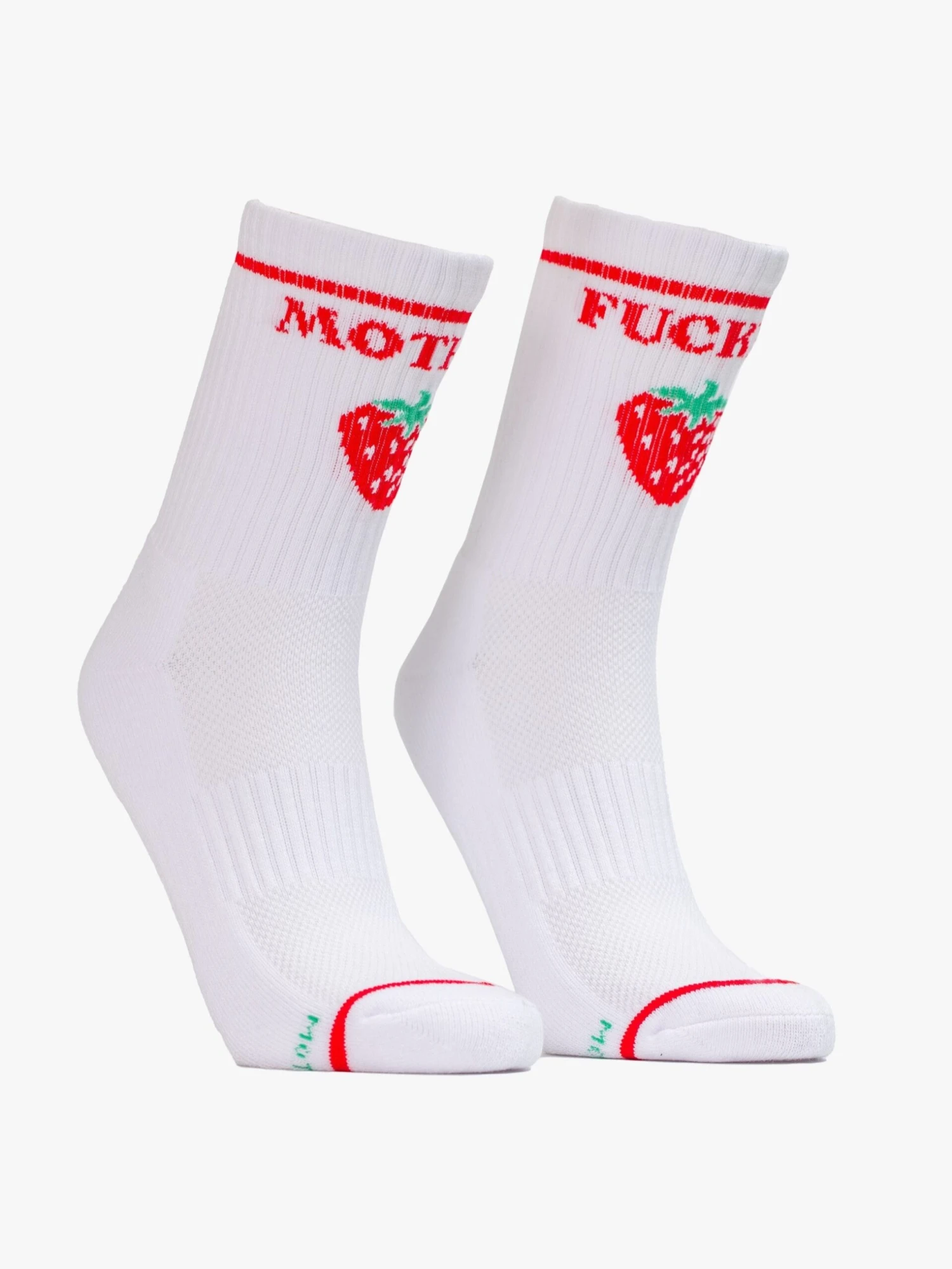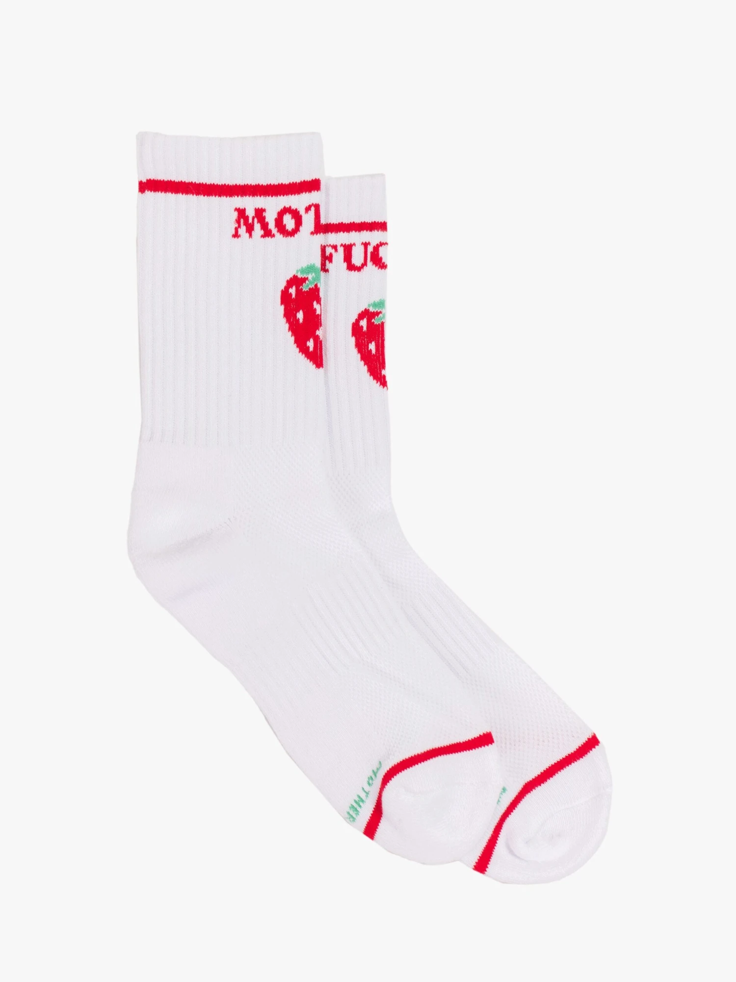 Ripe for the picking. Classic tube socks with a subtle message from MOTHER. Shown here in white with red lettering and a strawberry graphic on the front. Sweet.