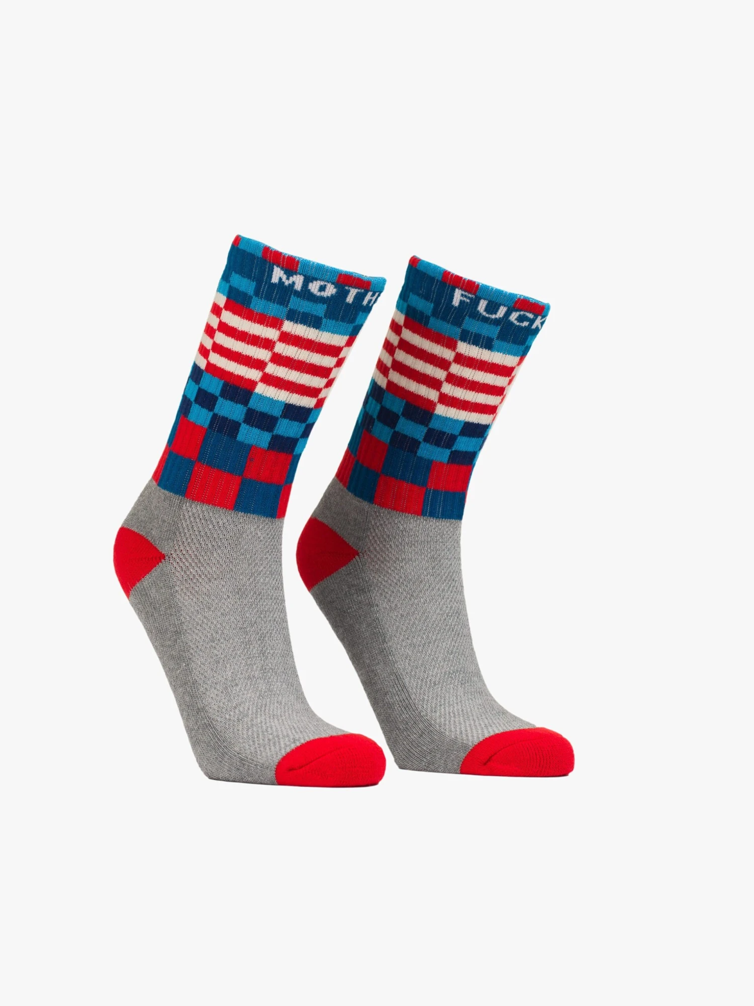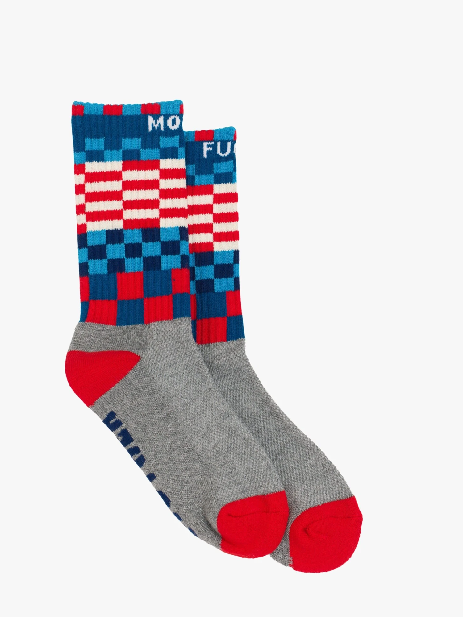 Checking in. Classic tube socks with a subtle message from MOTHER. Shown here in grey with text and checker-print details in shade of blue, white and red.