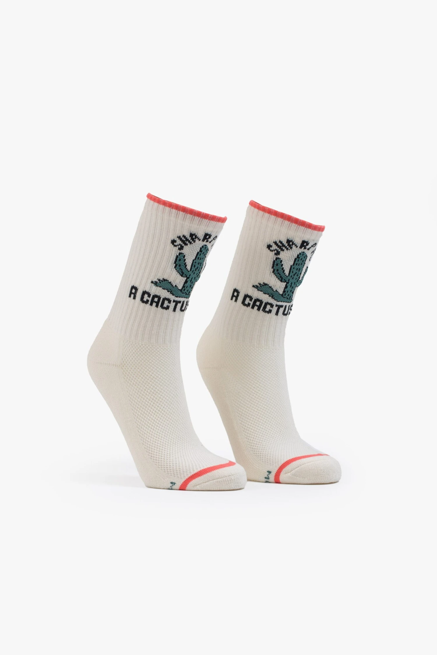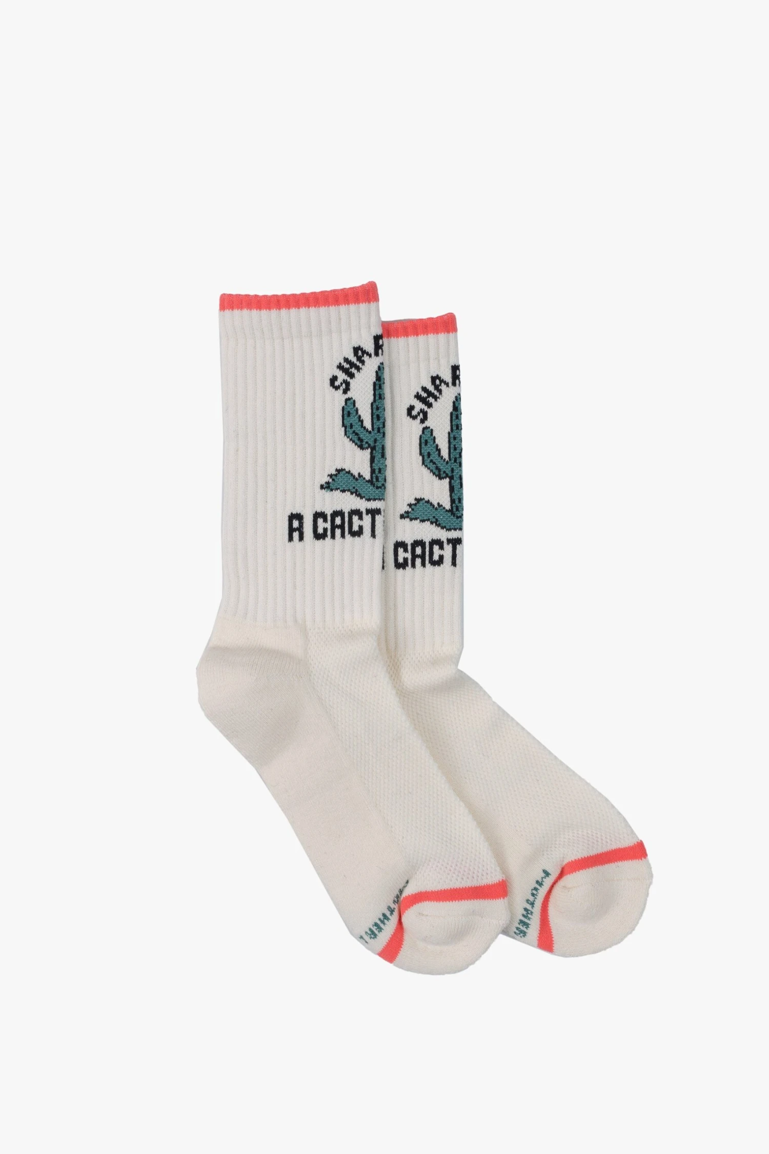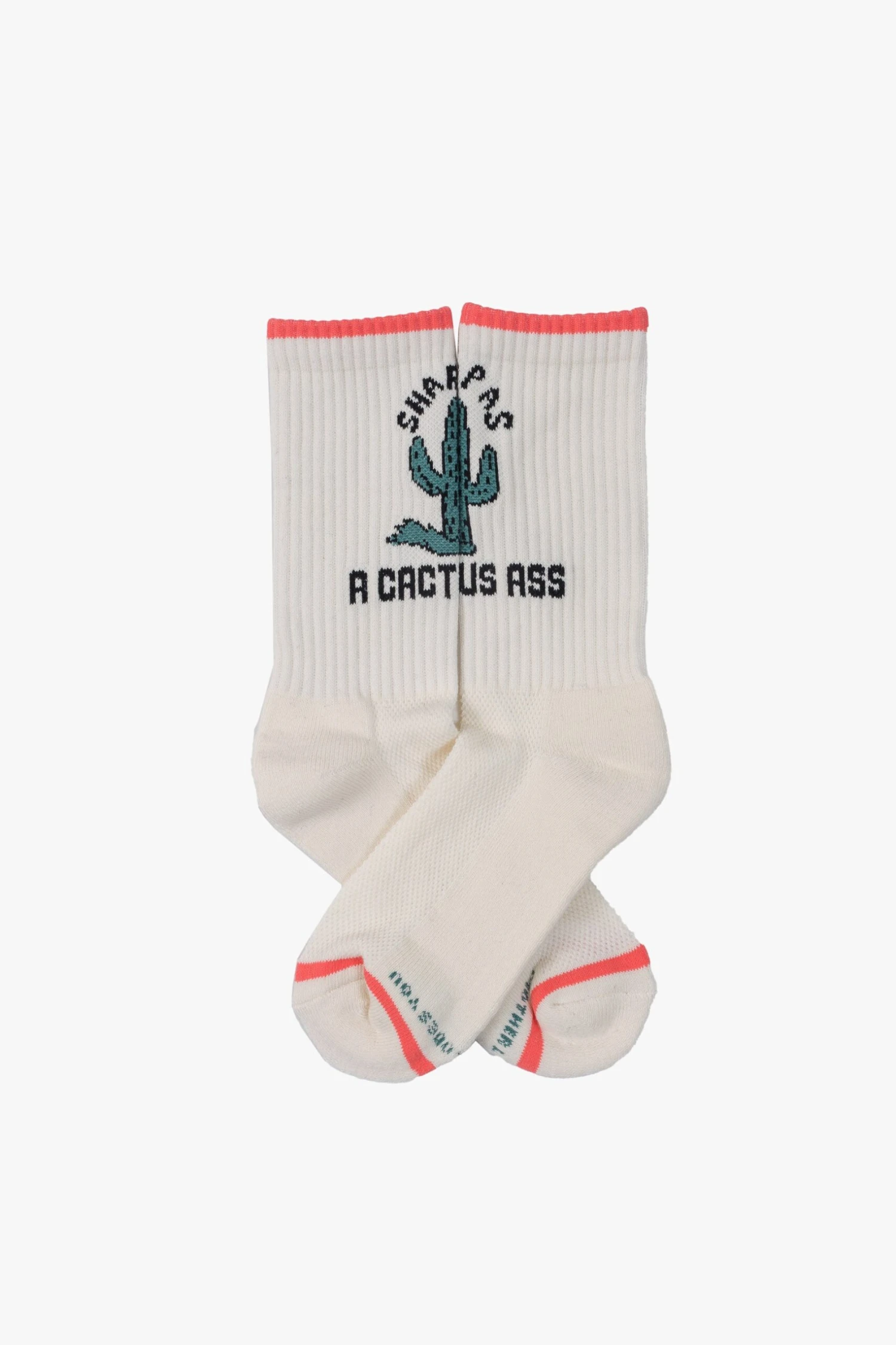Looking sharp. Classic tube socks with a subtle message from MOTHER. Shown here in white with black lettering, peach trim and a green cactus graphic on the front.