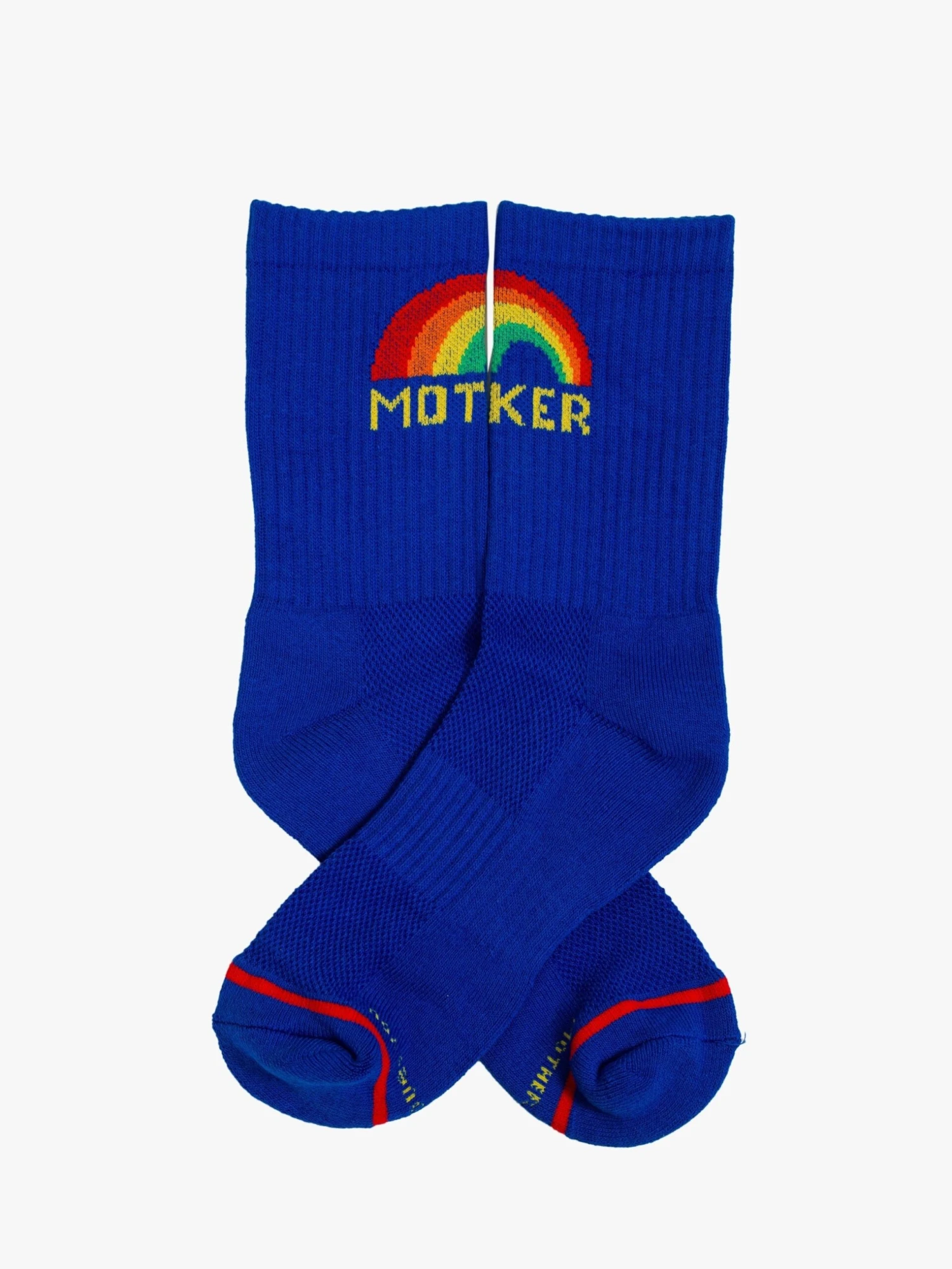 Over the rainbow. Classic tube socks with a bold message from MOTHER. Shown here in blue with a rainbow graphic and yellow lettering.