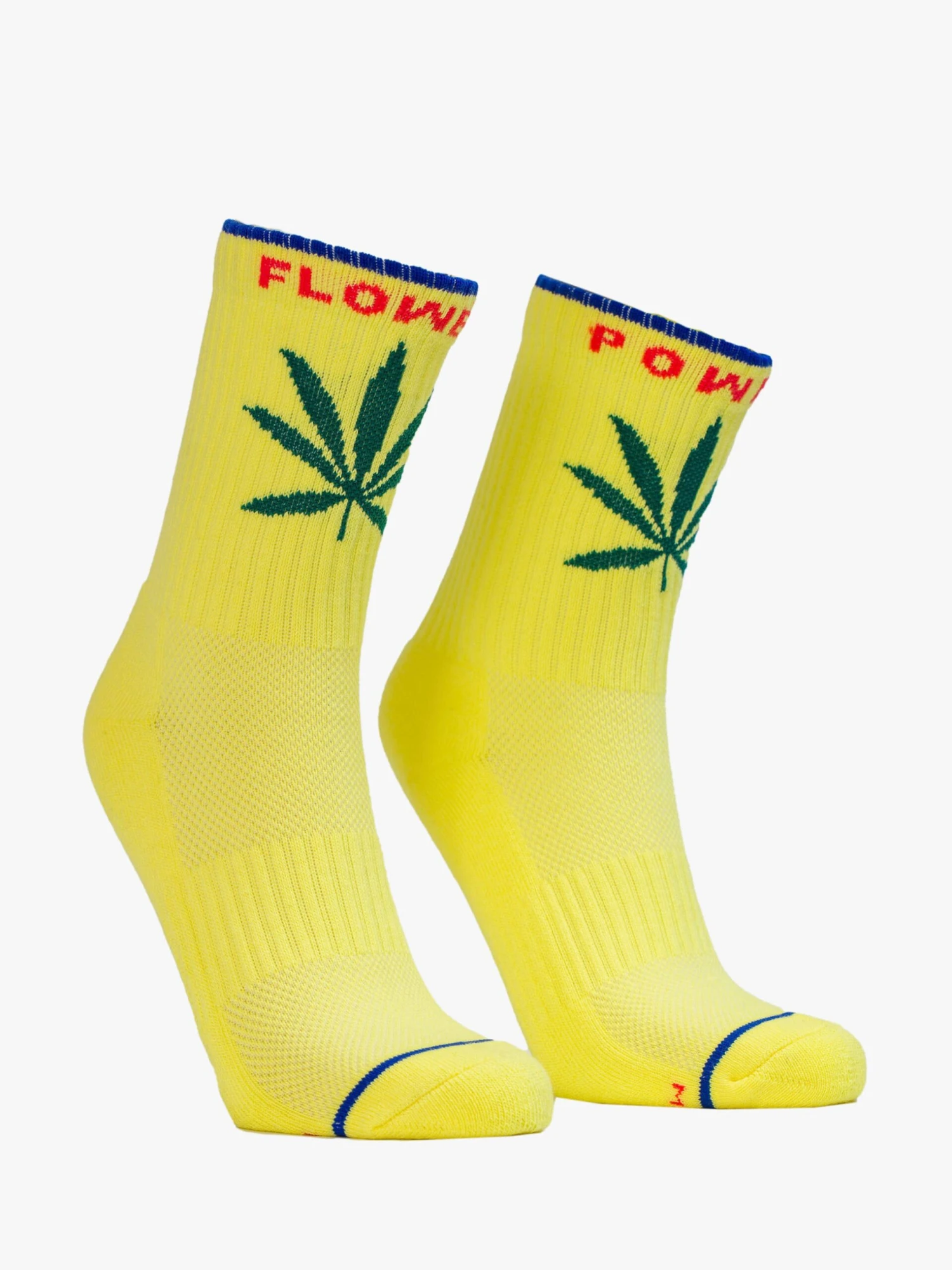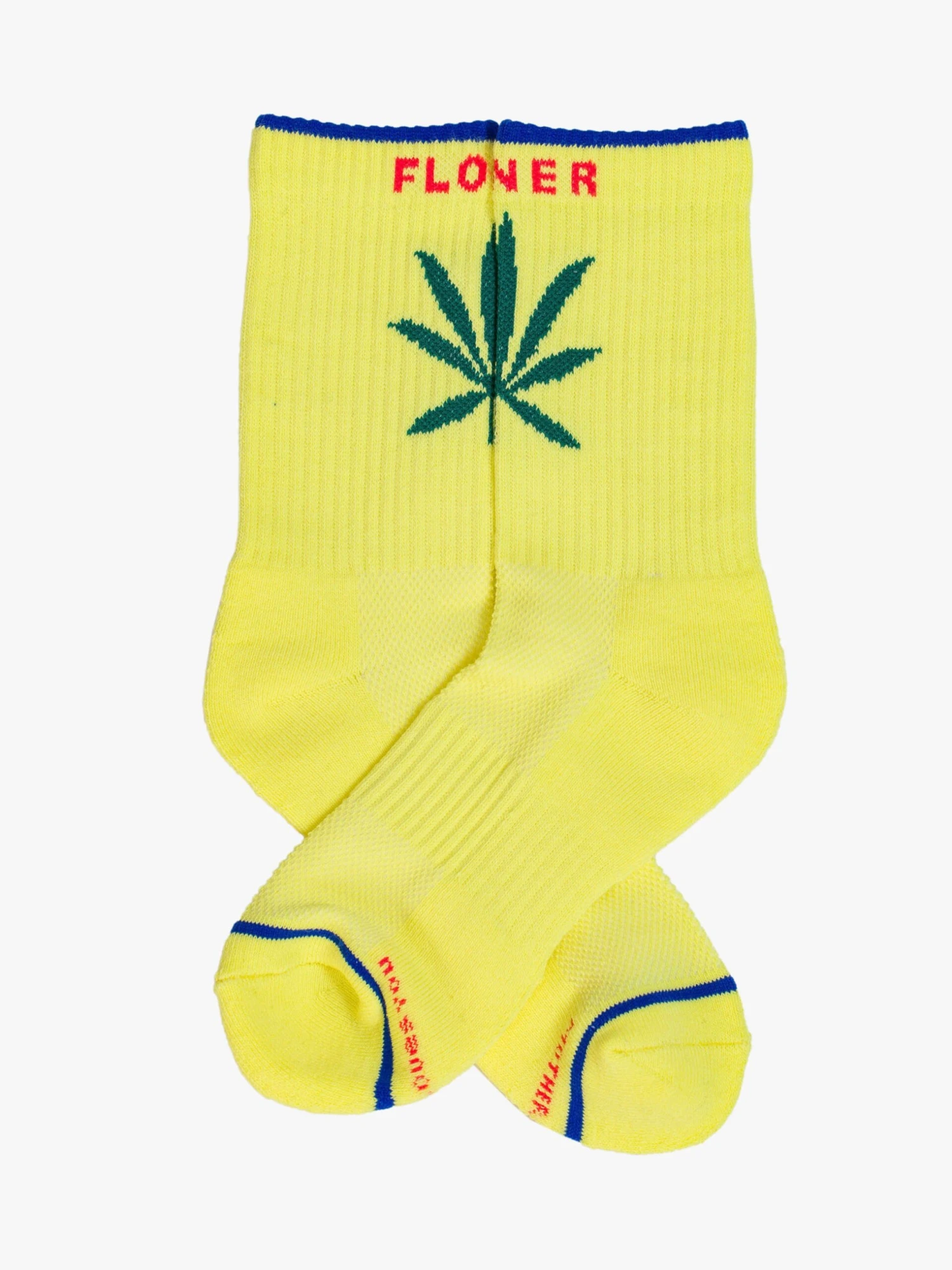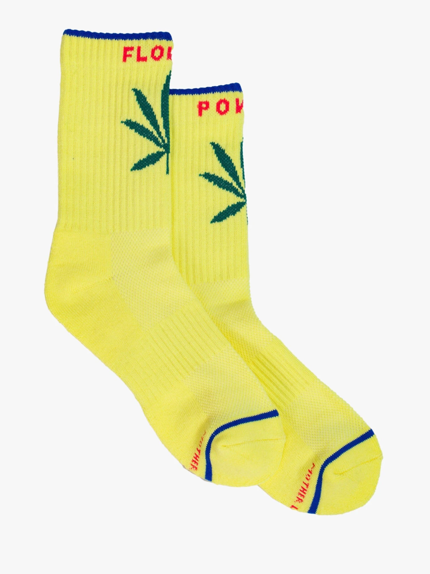 Best buds. Classic tube socks with a subtle cosign from MOTHER. Shown here in yellow with hot pink lettering and a weed leaf graphic on the front.