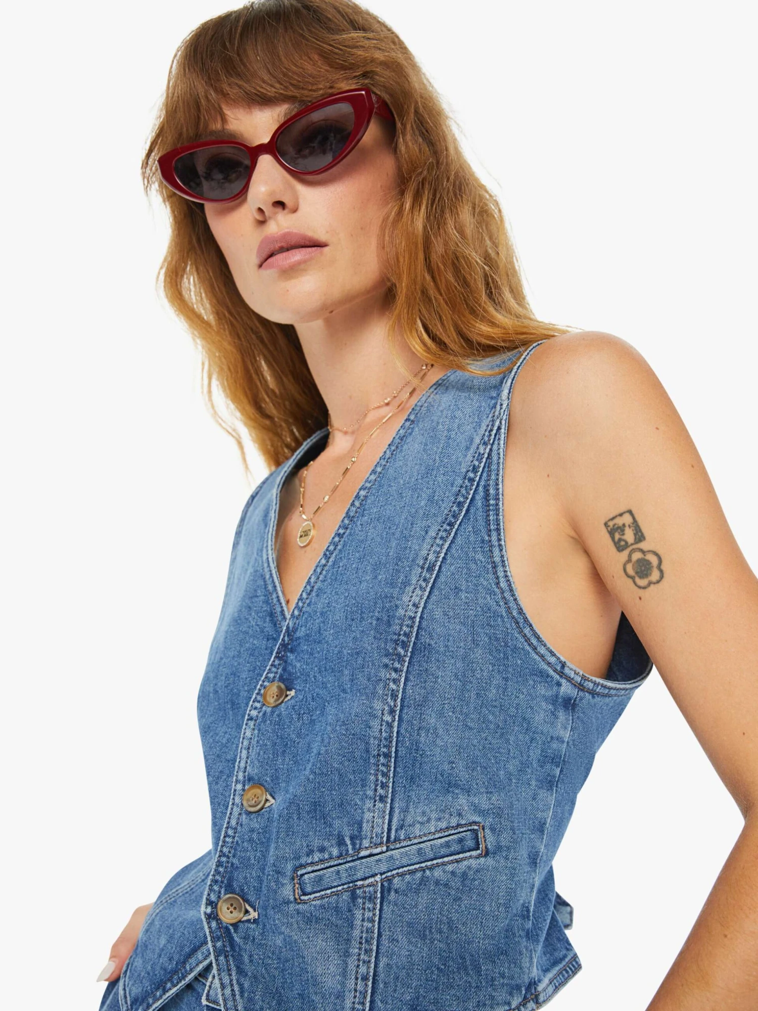 You, me, oui. A denim vest from the Clare V. x MOTHER capsule collection, a celebration of the brands’ shared love for Los Angeles that marries a rebellious California spirit with a French-leaning indie vibe. The Belle vest is designed with a deep V-neck, three-button closure, slit pockets and an adjustable tab in the back. Made from semi-rigid SUPERIOR denim, Playing In Paris is a vintage-blue wash with subtle fading for a lived-in look. With love from L.A.
