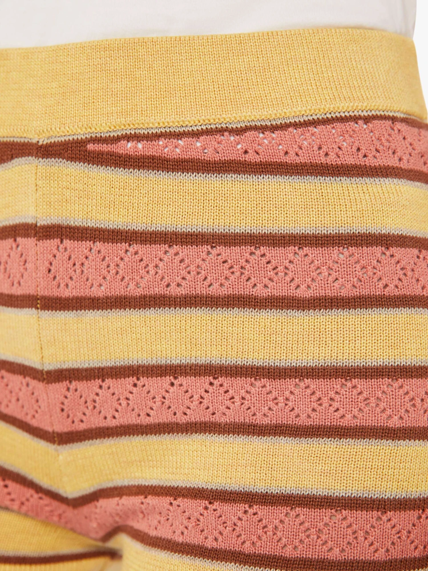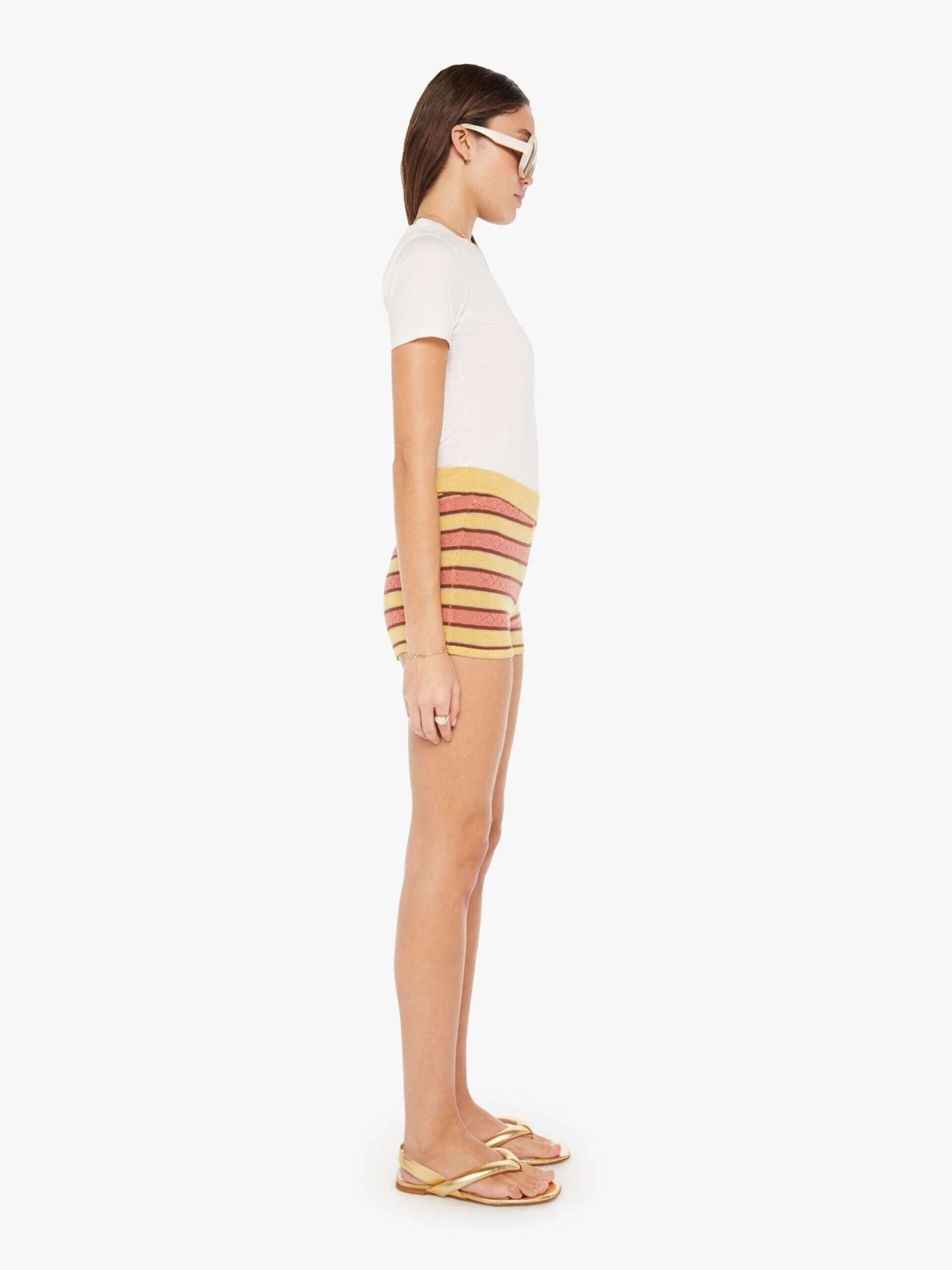 Read between the lines. High waisted bootie shorts with an elastic waistband and a super-short inseam. The shorts are knit from a cotton blend in mustard yellow, salmon pink and maroon stripes and features delicate eyelet details. Pair it with the Hot Under The Collar Top for a matching set.