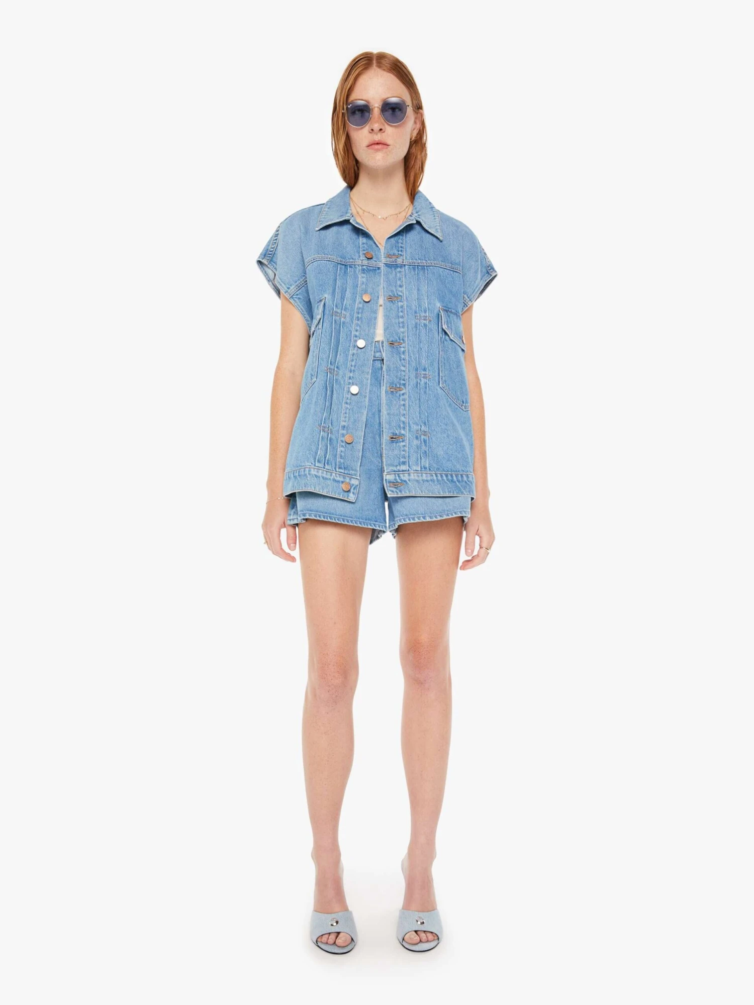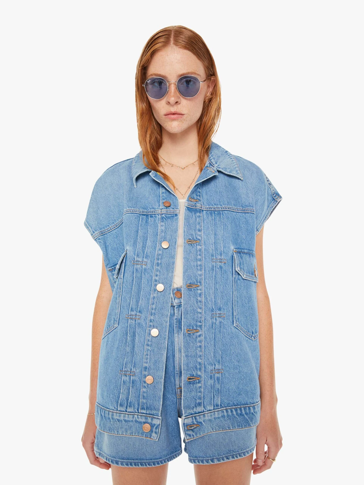 A denim vest from SNACKS!, a collection of unconstrained silhouettes leaning into exaggerated shapes and extreme proportions. Experimental and non-era specific. For everyone, or not. The oversized denim vest features large patch pockets, wide cut-off sleeves and a boxy fit. Made from a recycled cotton blend, All You Can Eat is a light-blue wash with a pretzel-detailed button and candy-inspired interior rivets. Would you like a treat?