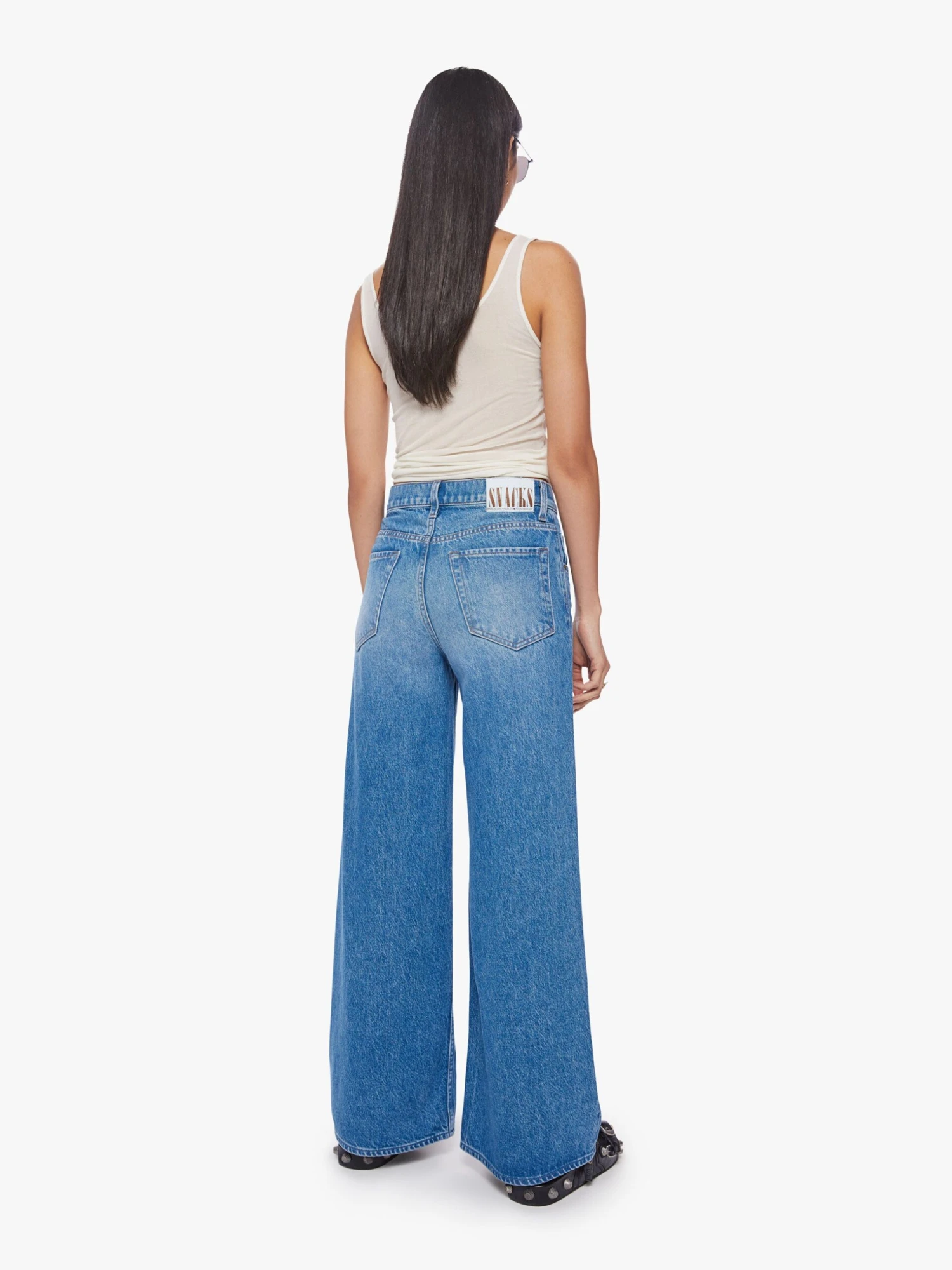 A wide-leg jean from SNACKS!, a collection of unconstrained silhouettes leaning into exaggerated shapes and extreme proportions. Experimental and non-era specific. For everyone, or not. The mid-rise jeans are designed with a button fly, slouchy, loose fit and a 30-inch inseam. Made from a recycled cotton blend, Dine N’ Dash is a mid-blue wash with a pretzel-detailed button and candy-inspired interior rivets. Would you like a treat?