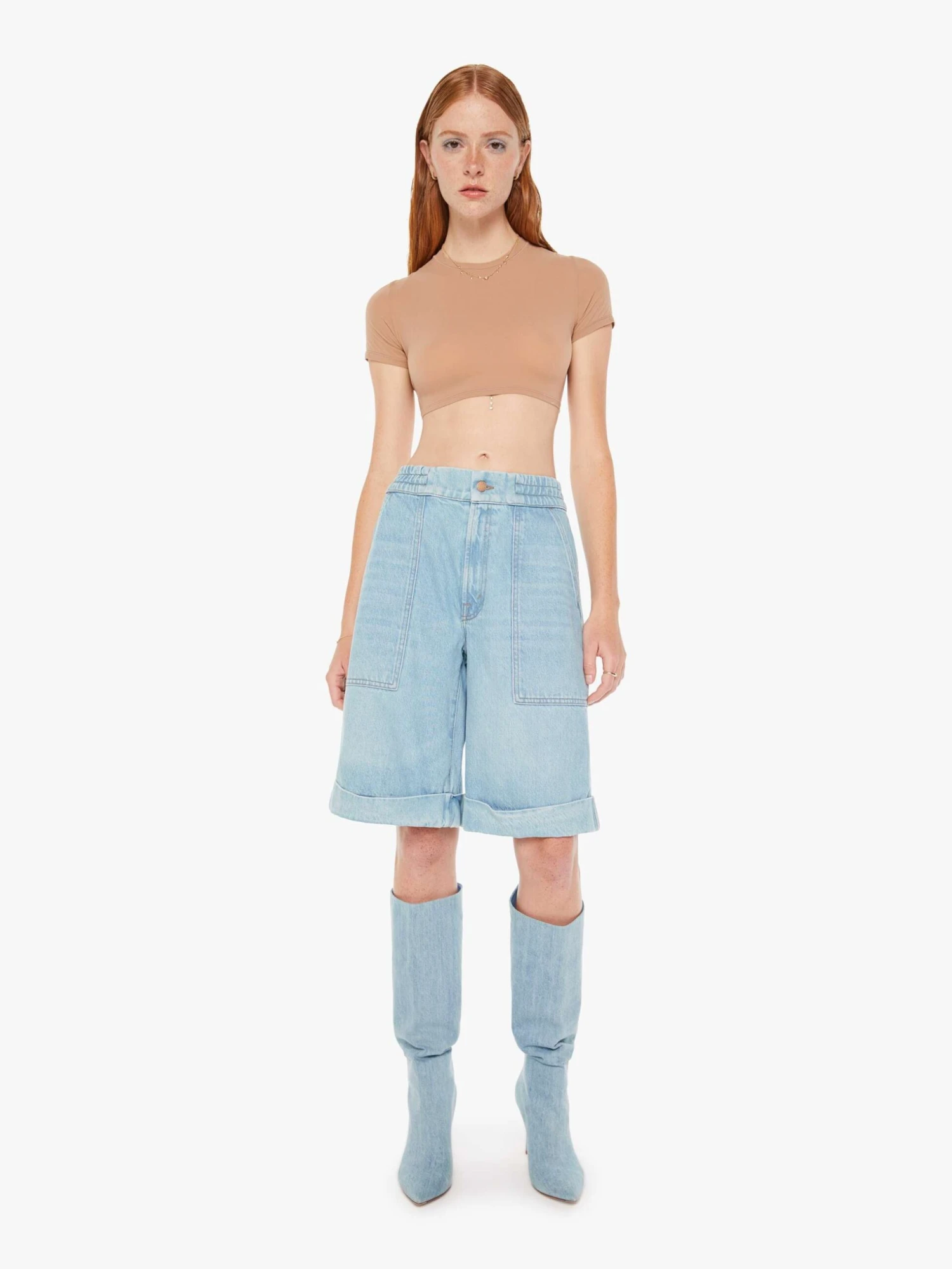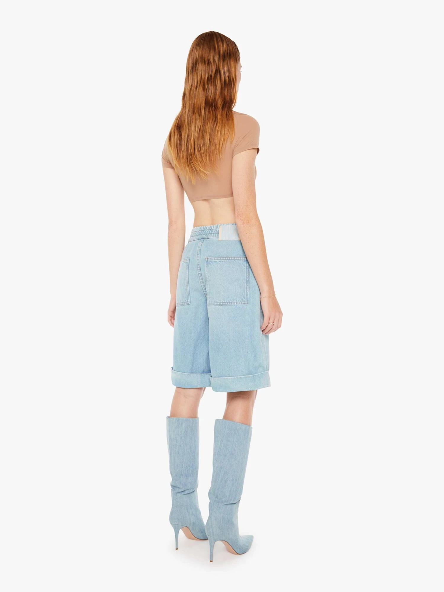 Oversized denim shorts from SNACKS!, a collection of unconstrained silhouettes leaning into exaggerated shapes and extreme proportions. Experimental and non-era specific. For everyone, or not. The high-waisted shorts are designed with loose, wide legs, an elastic waistband, patch pockets and a 10-inch inseam with a folded hem. Made from a recycled cotton blend, Sweet And Sour is a light blue wash with a pretzel-detailed button and candy-inspired interior rivets. Would you like a treat?