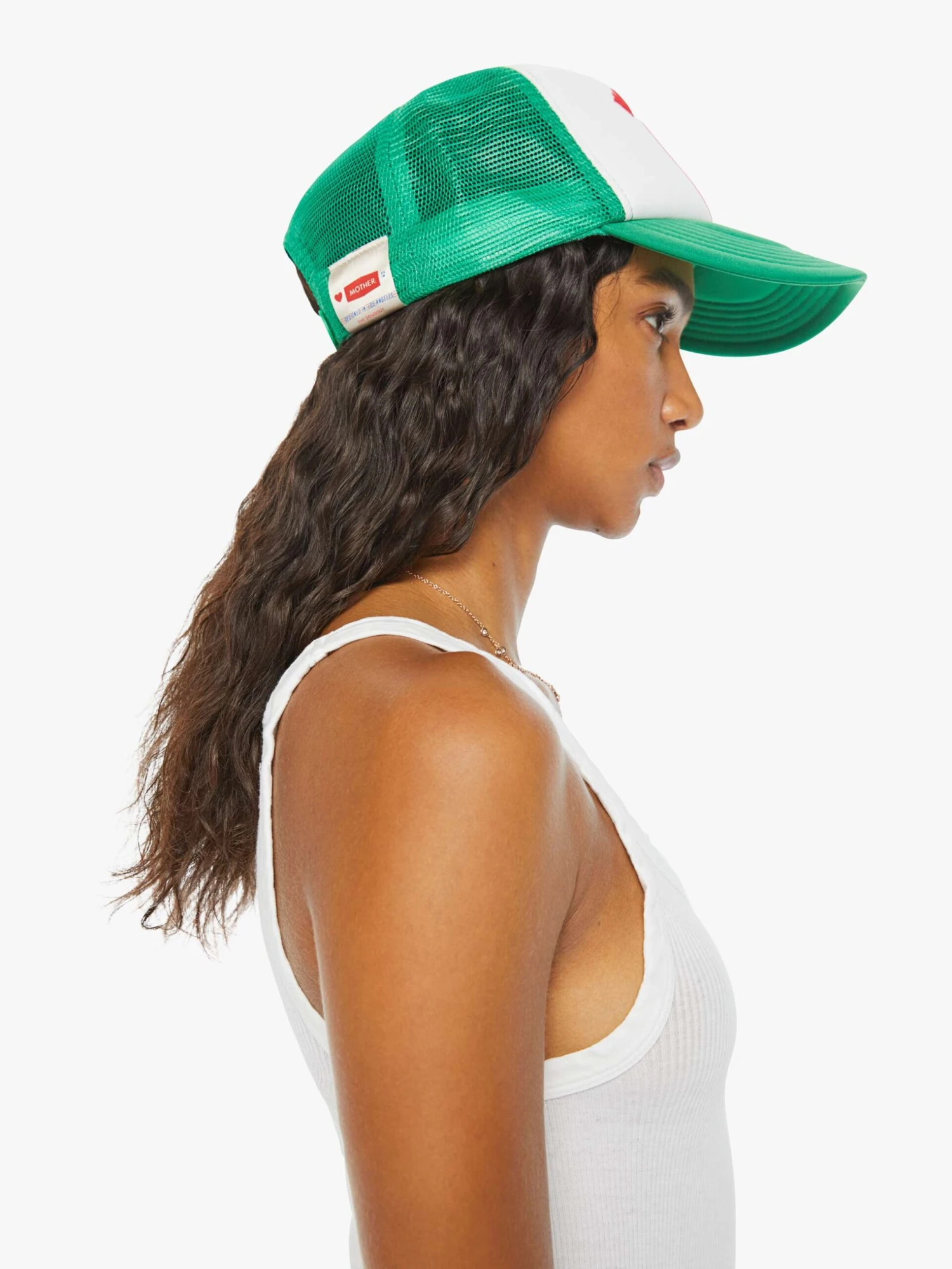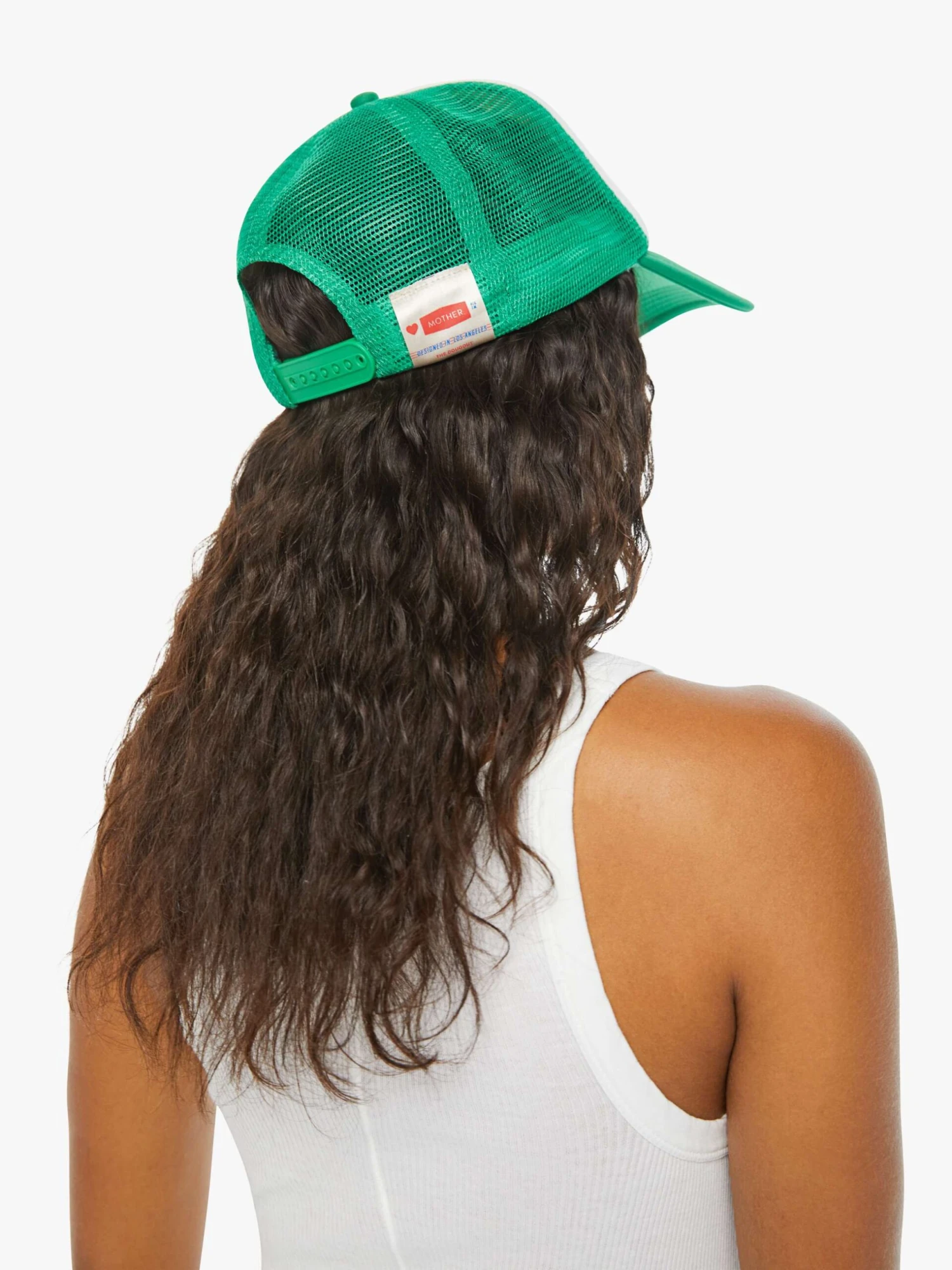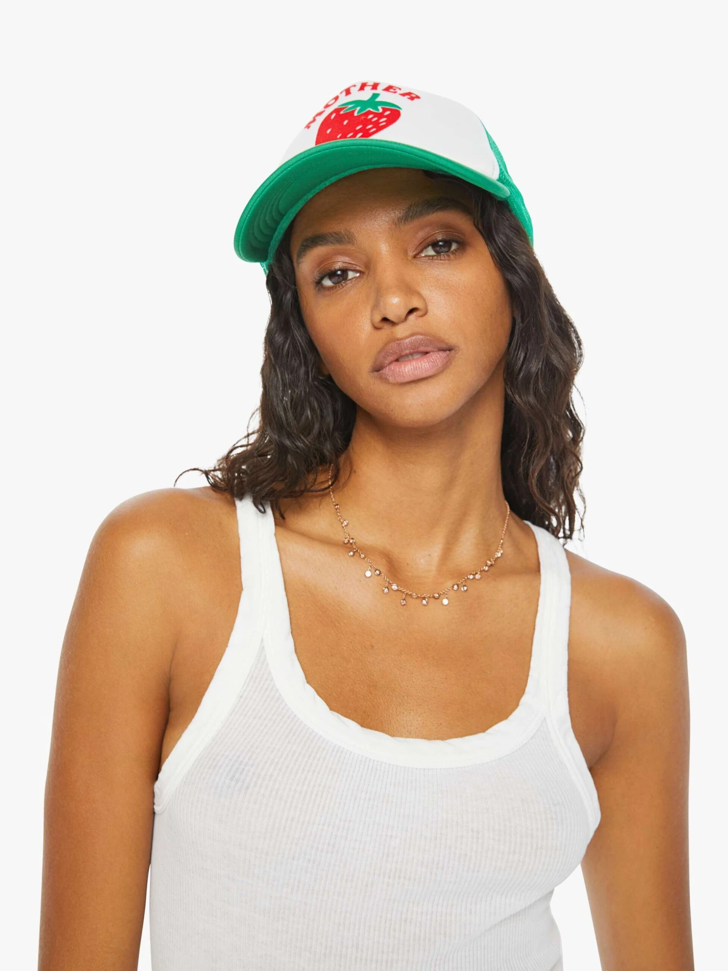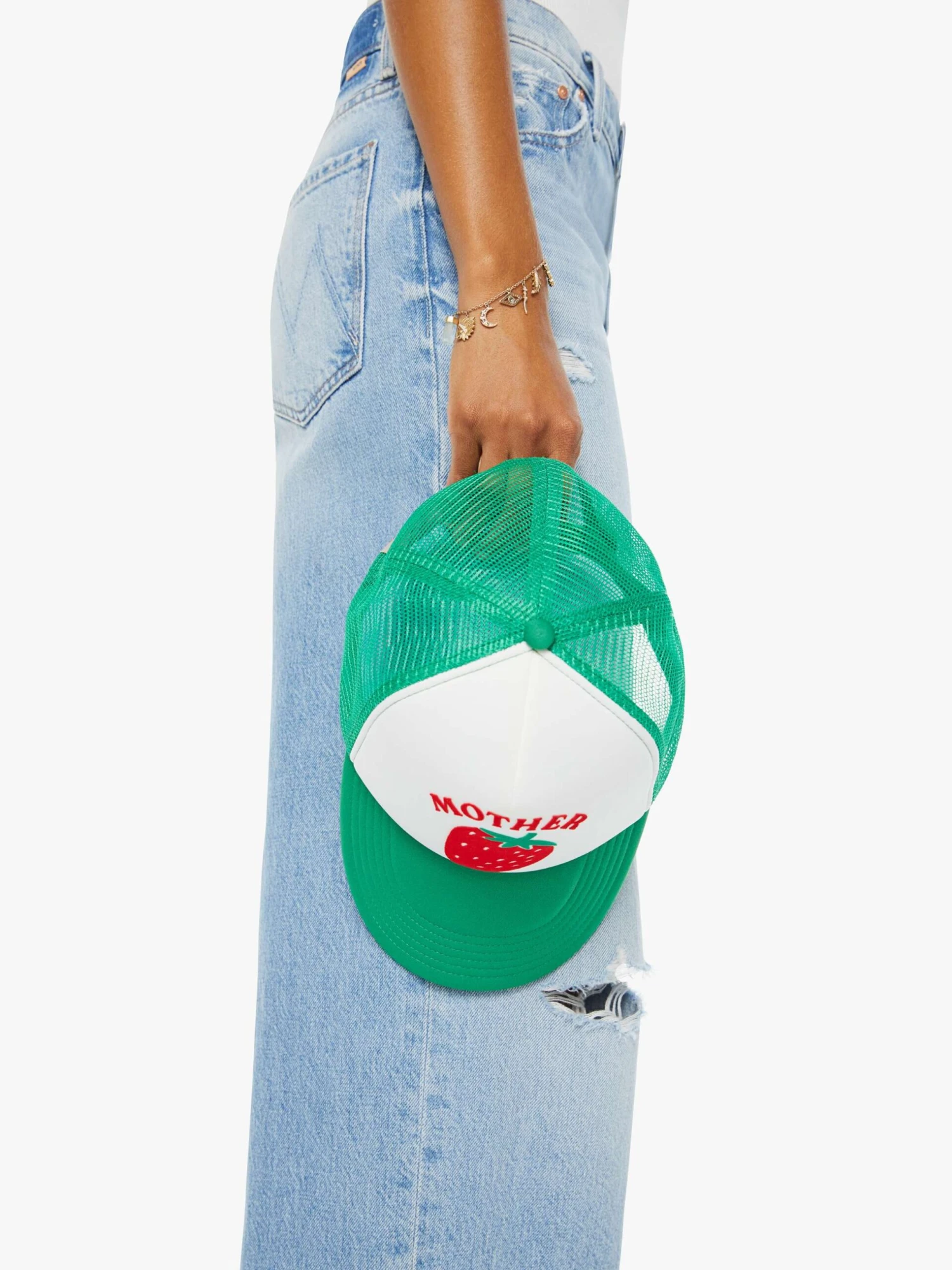 Ripe for the picking. This vintage-inspired trucker hat is designed in white and green with a strawberry graphic on the front. Sweet.