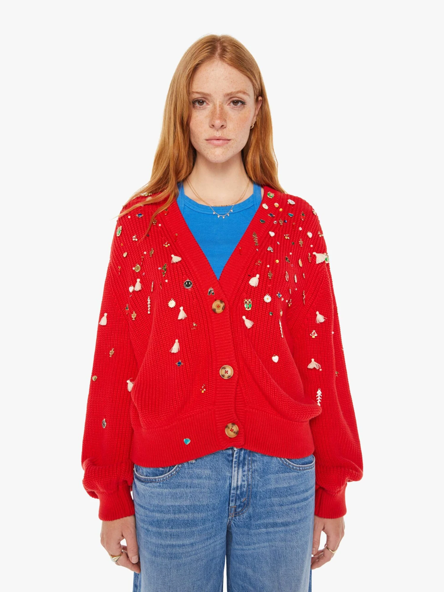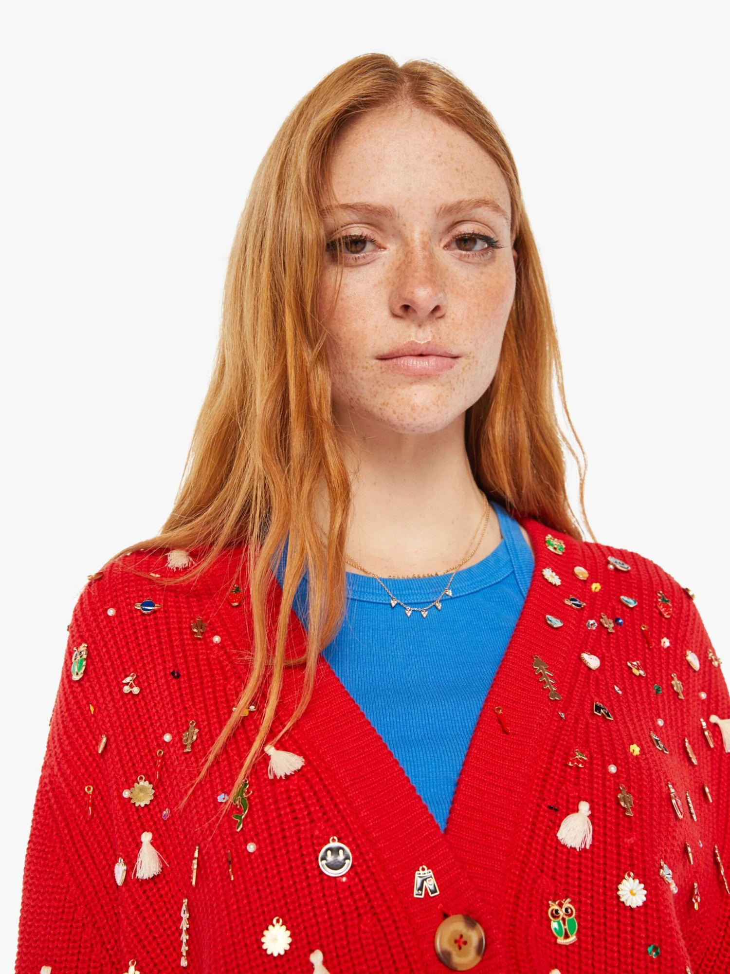 Charmed. A V-neck cardigan with long balloon sleeves, drop shoulders and ribbed hems. Made from 100% cotton in red, the cardigan is designed with colorful charms, beads and tassels throughout.