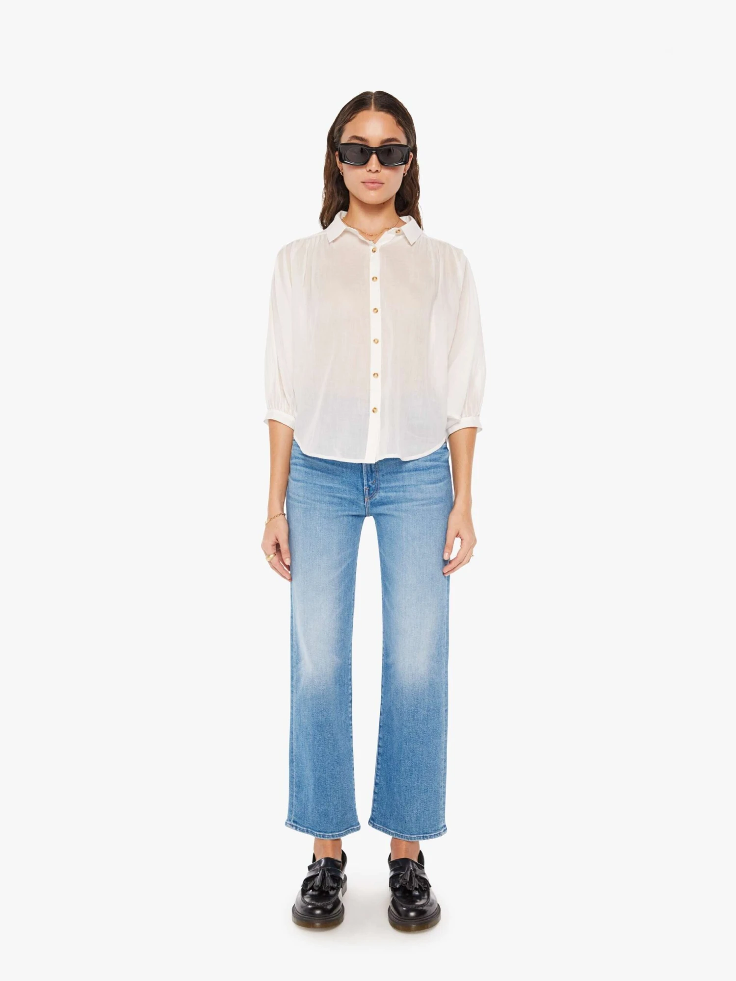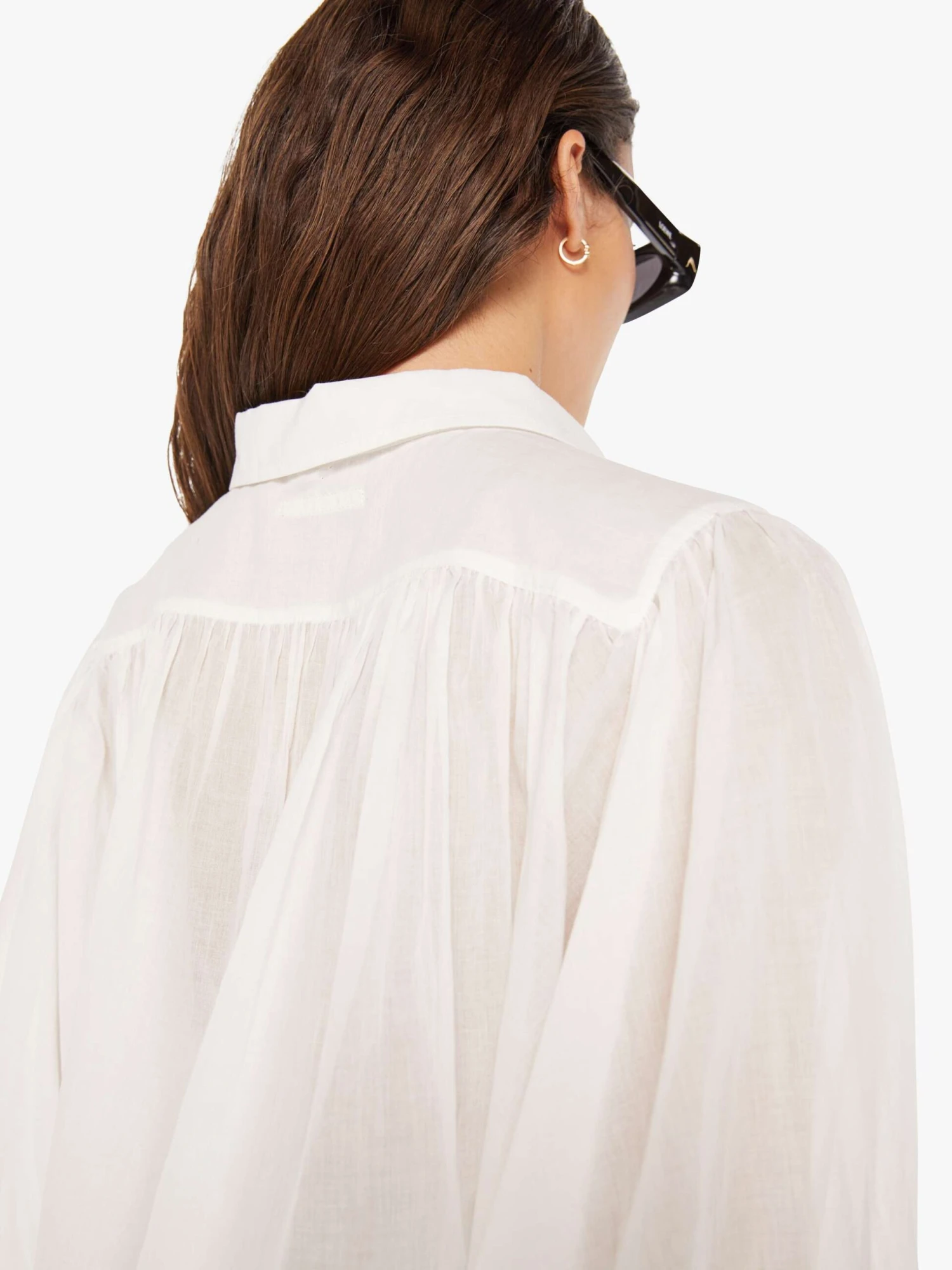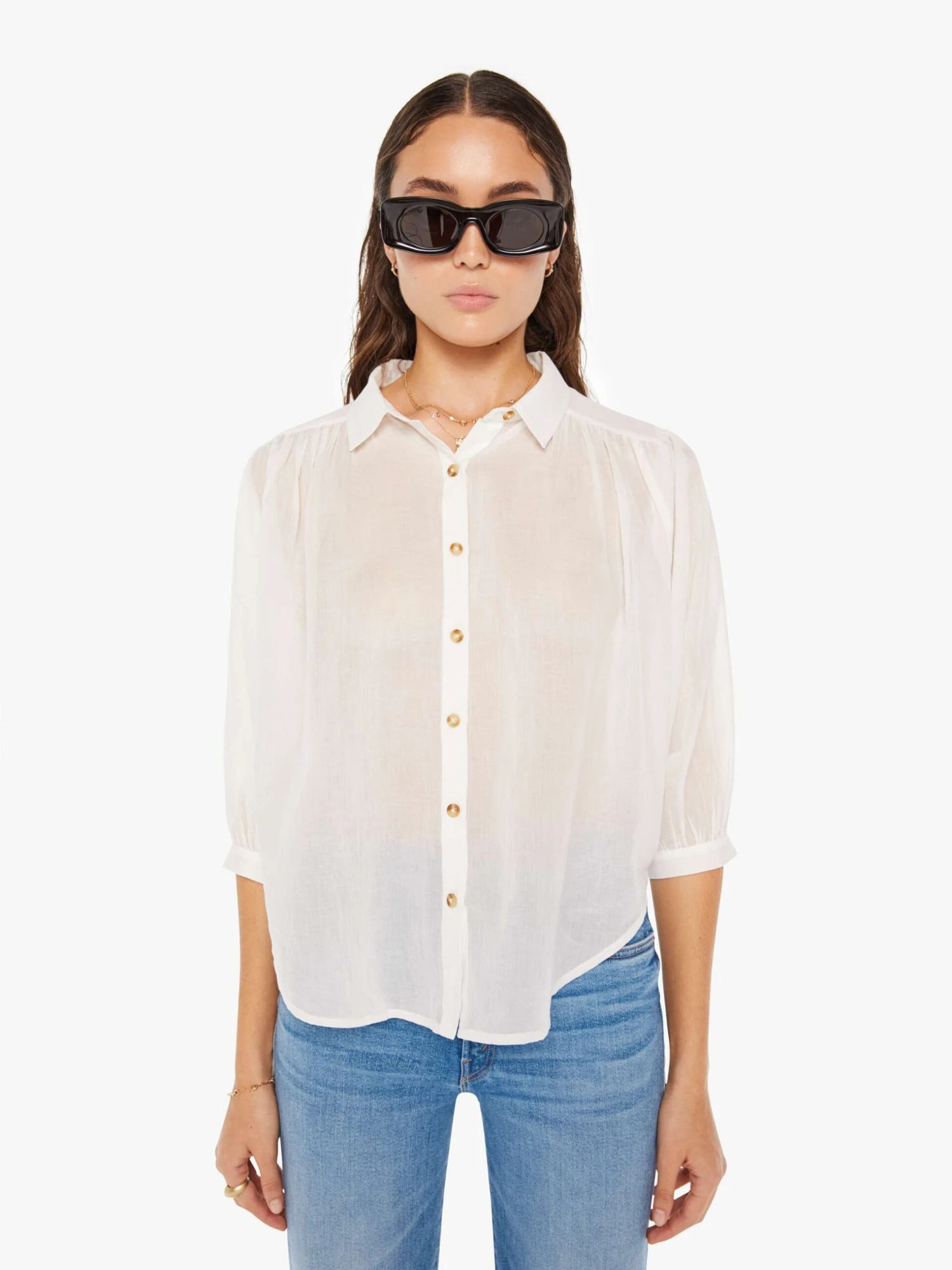 Blank slate. A lightweight collared blouse with 3/4-length balloon sleeves, a curved hem and ruffles throughout for a flowy fit. Made from semi-sheer 100% cotton in white, the top features shell buttons down the front.