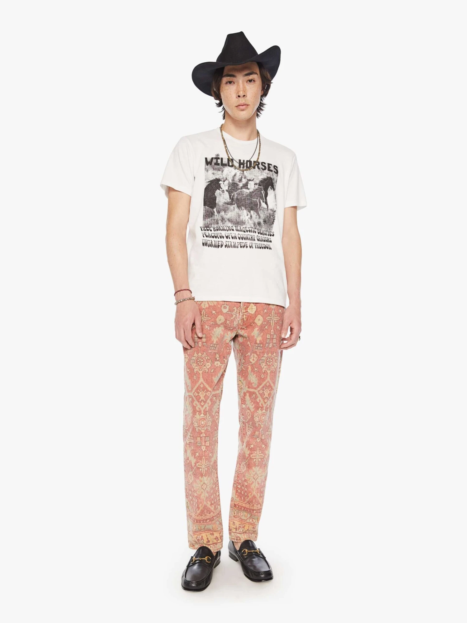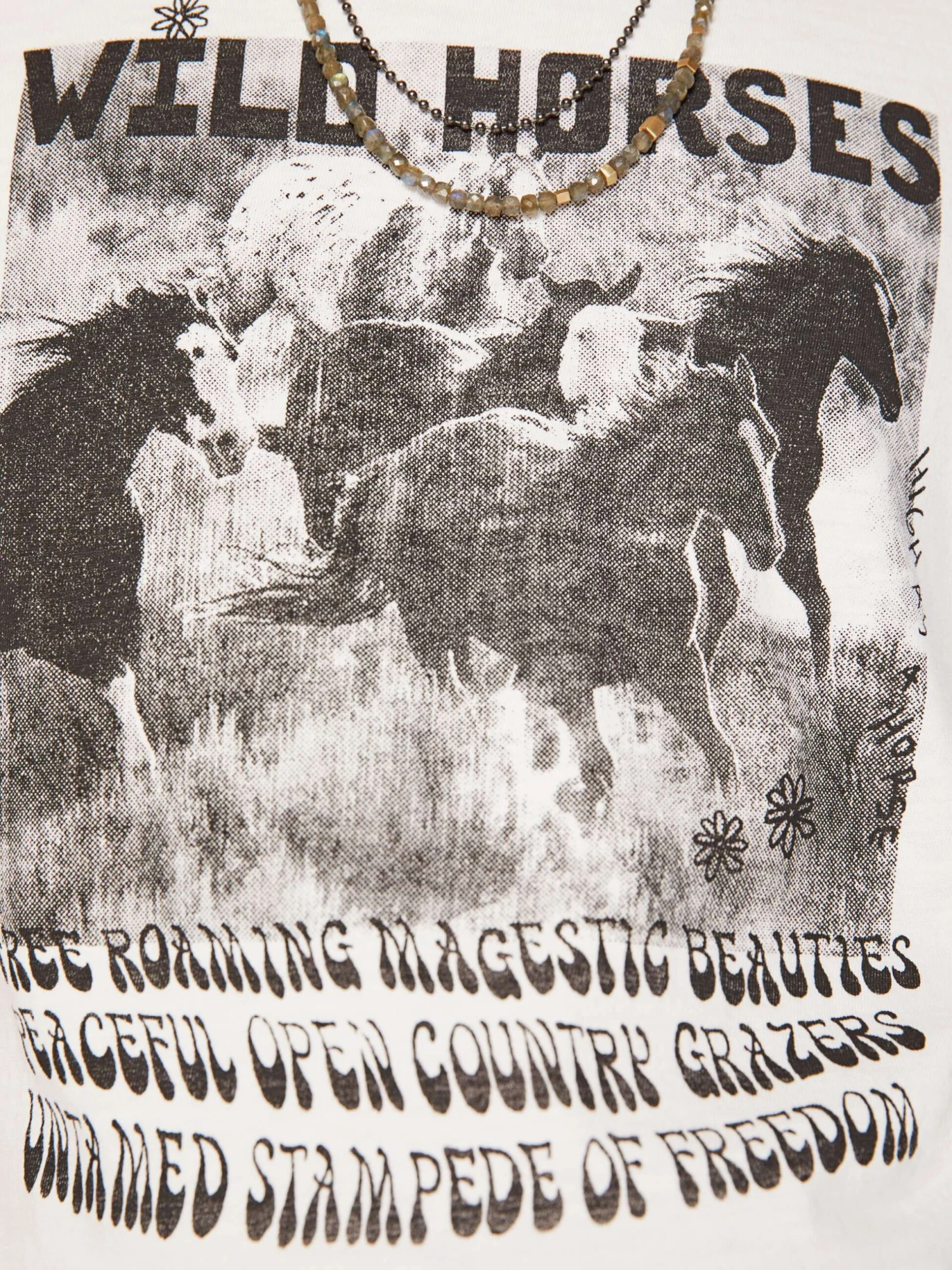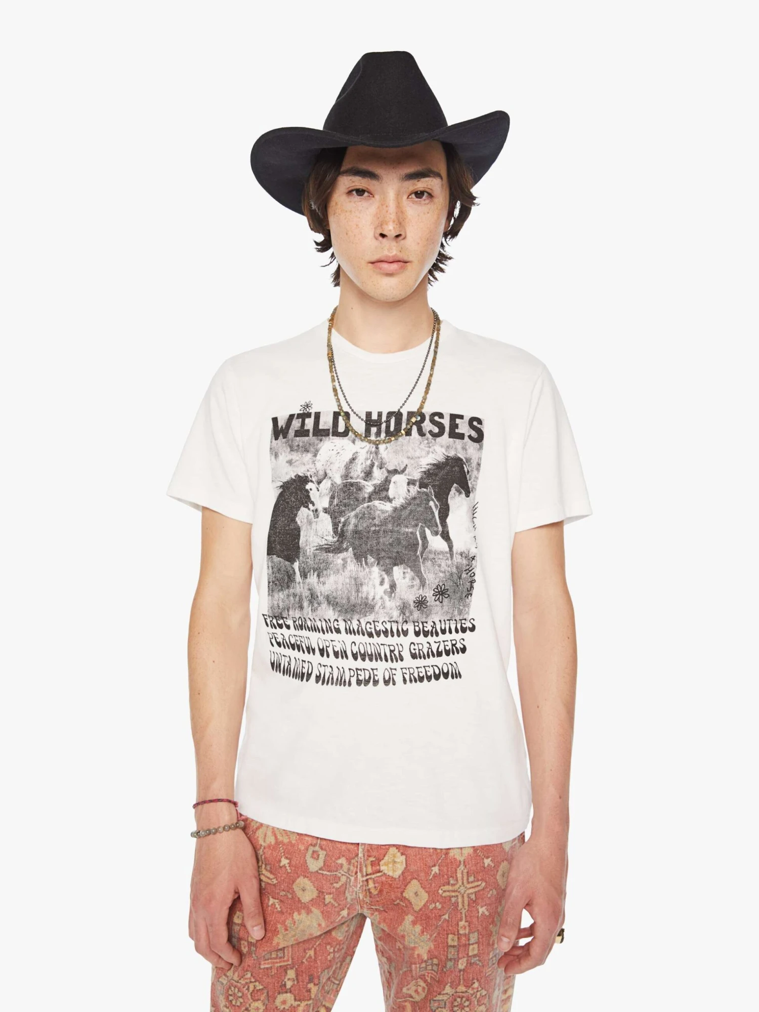 Wild horses. A classic crewneck tee with short sleeves and a boxy fit. Made from 100% cotton in white, The Buster in Free Roaming features a faded horse graphic in black on the front.