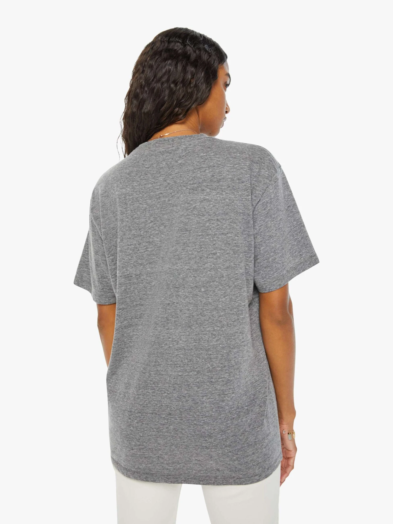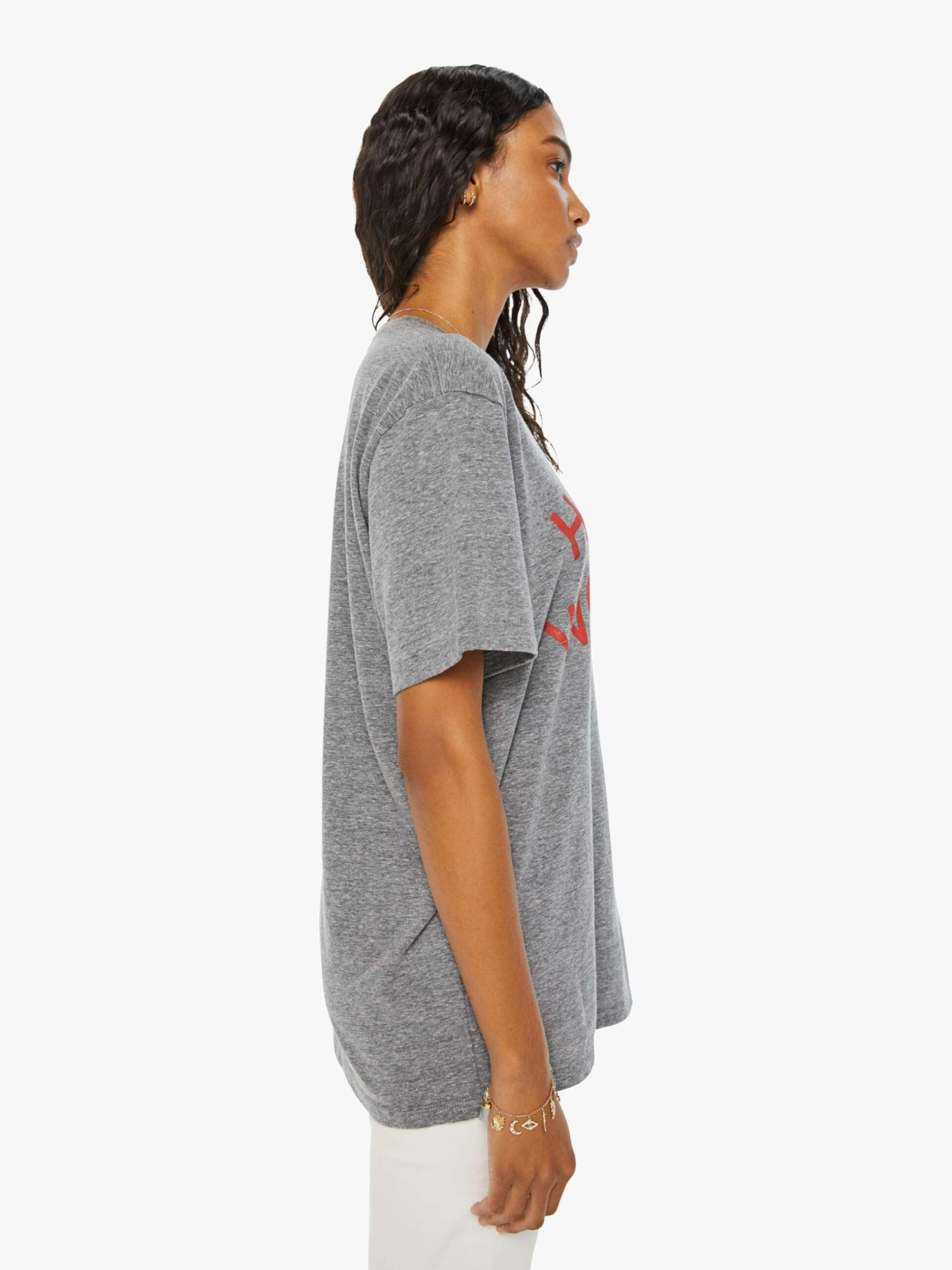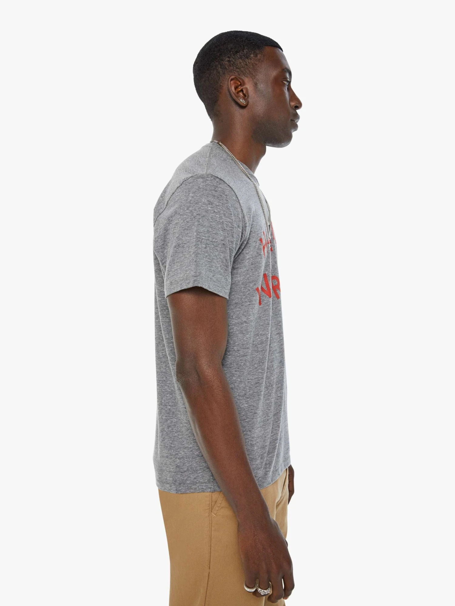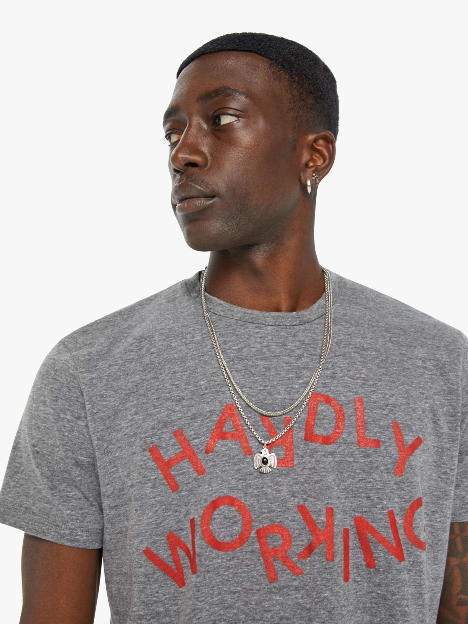 Working hard. A classic crewneck tee with short sleeves and a boxy fit. Made from a cotton blend in a heathered grey, The Buster in Hardly Working features a playful text graphic in red on the front.