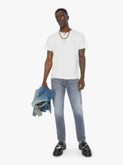 Rough around the edges. The Chaser is a mid-rise straight leg with a 32-inch inseam and a clean hem. Made from denim with a touch of stretch, 5 O’clock Shadow is a dark-grey wash with whiskering and fading at the knees.