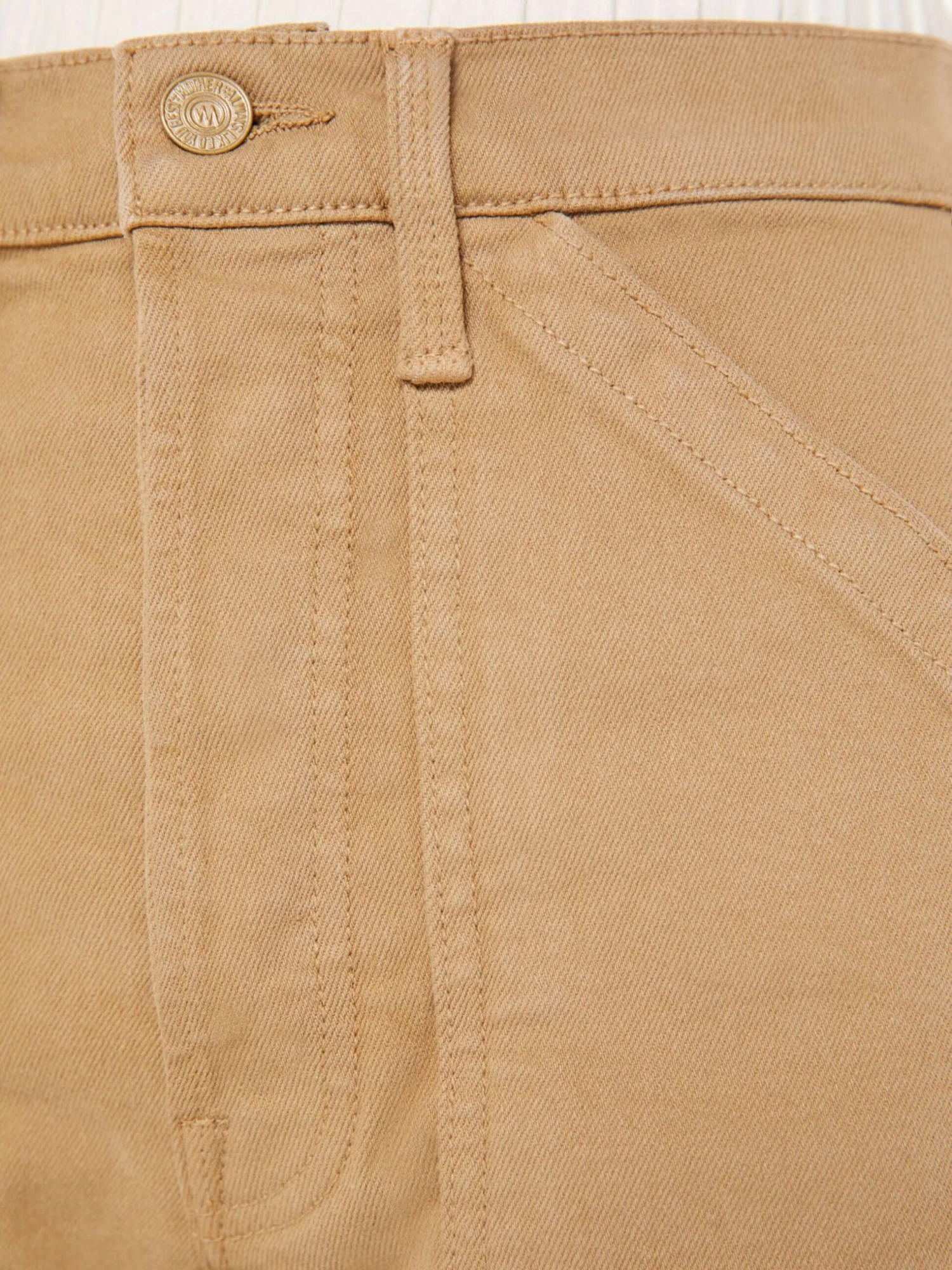 Kicking up dust. A super high waisted cargo pant with a barrel leg, patch pockets and a long inseam with snaps at the hem. Made from a cotton blend with a touch of stretch, Prairie Sand is a light khaki with tonal hardware.