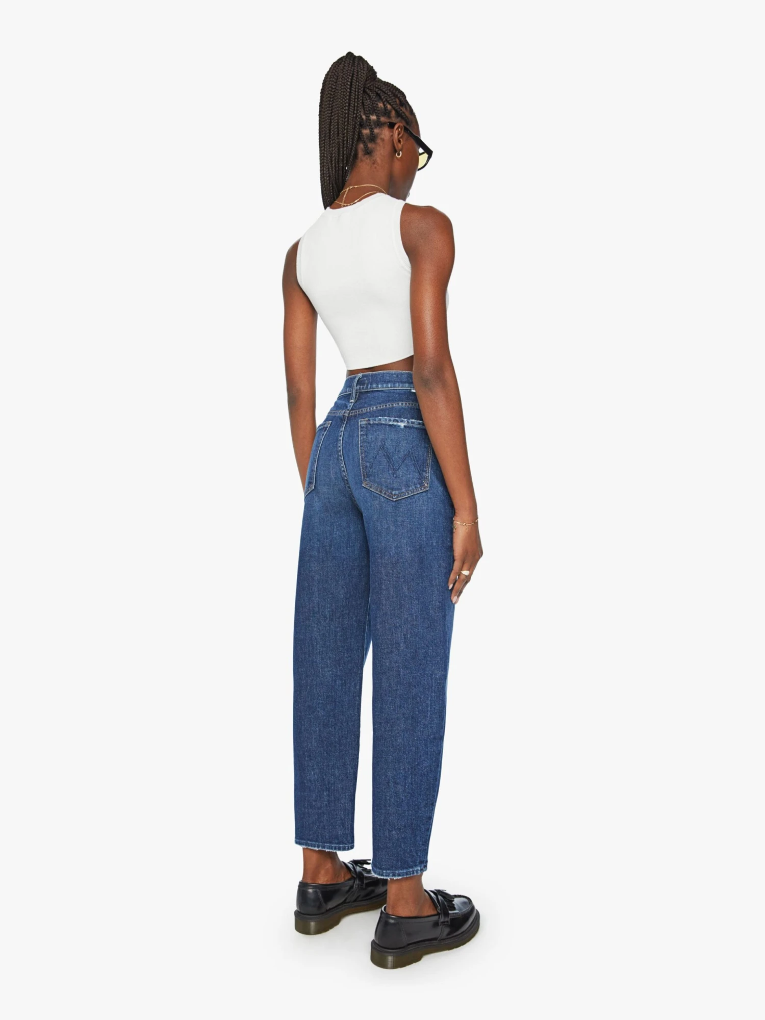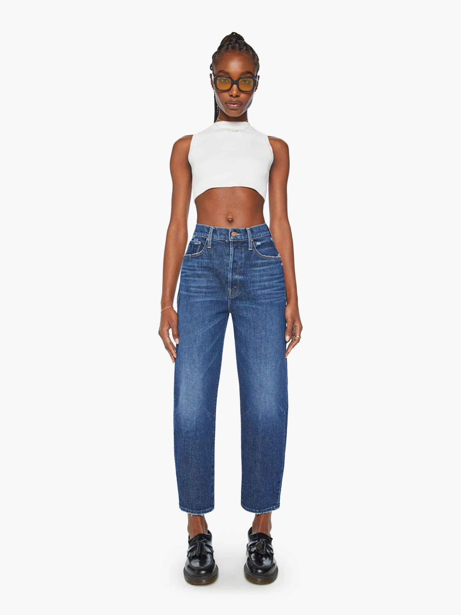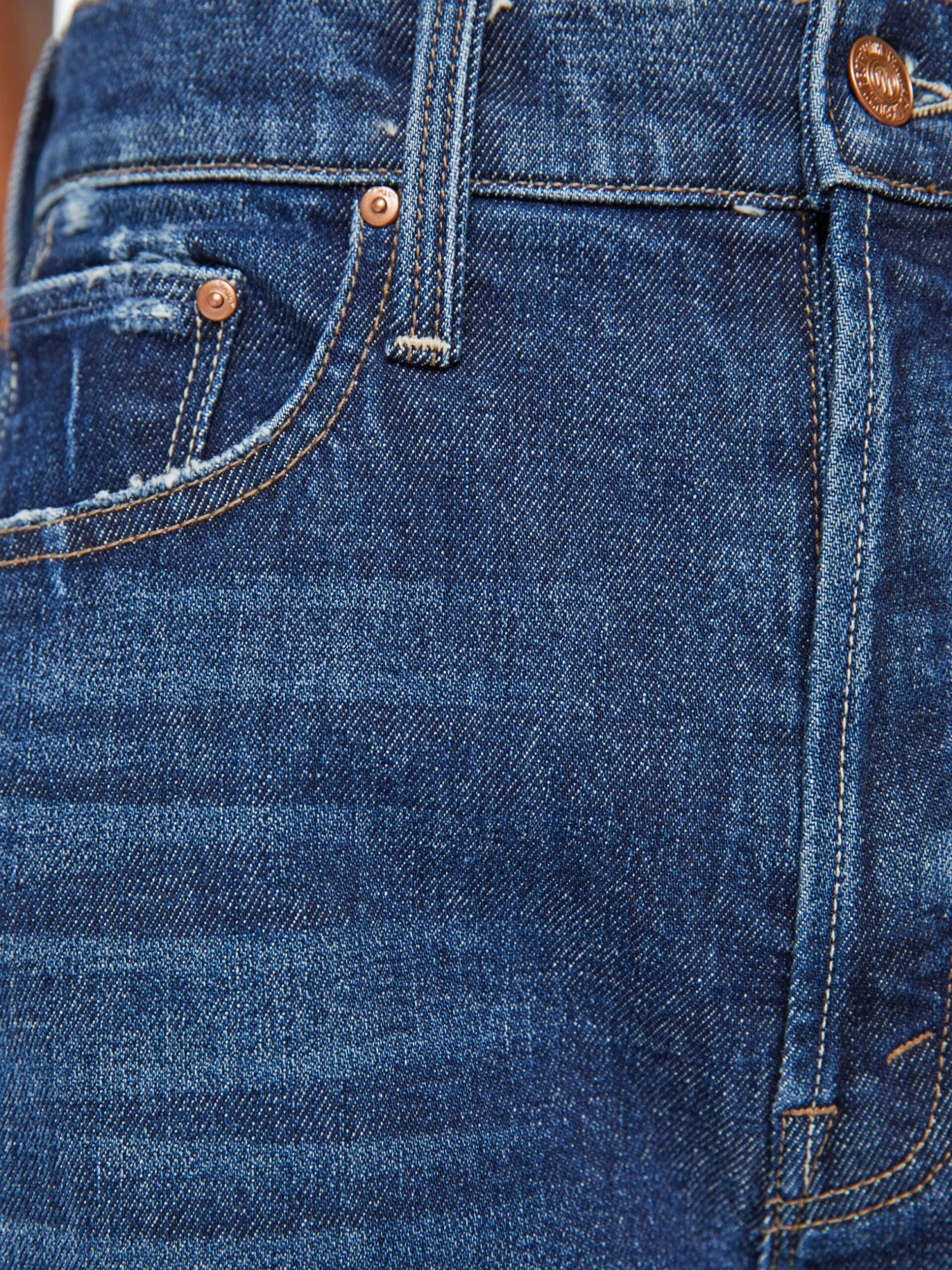 Horsin’ around. Super high-waisted jeans with a straight barrel leg and a cropped inseam with a clean hem. Cut from stretch denim, Yee Haw is a dark blue wash with whiskering and fading at the knee.