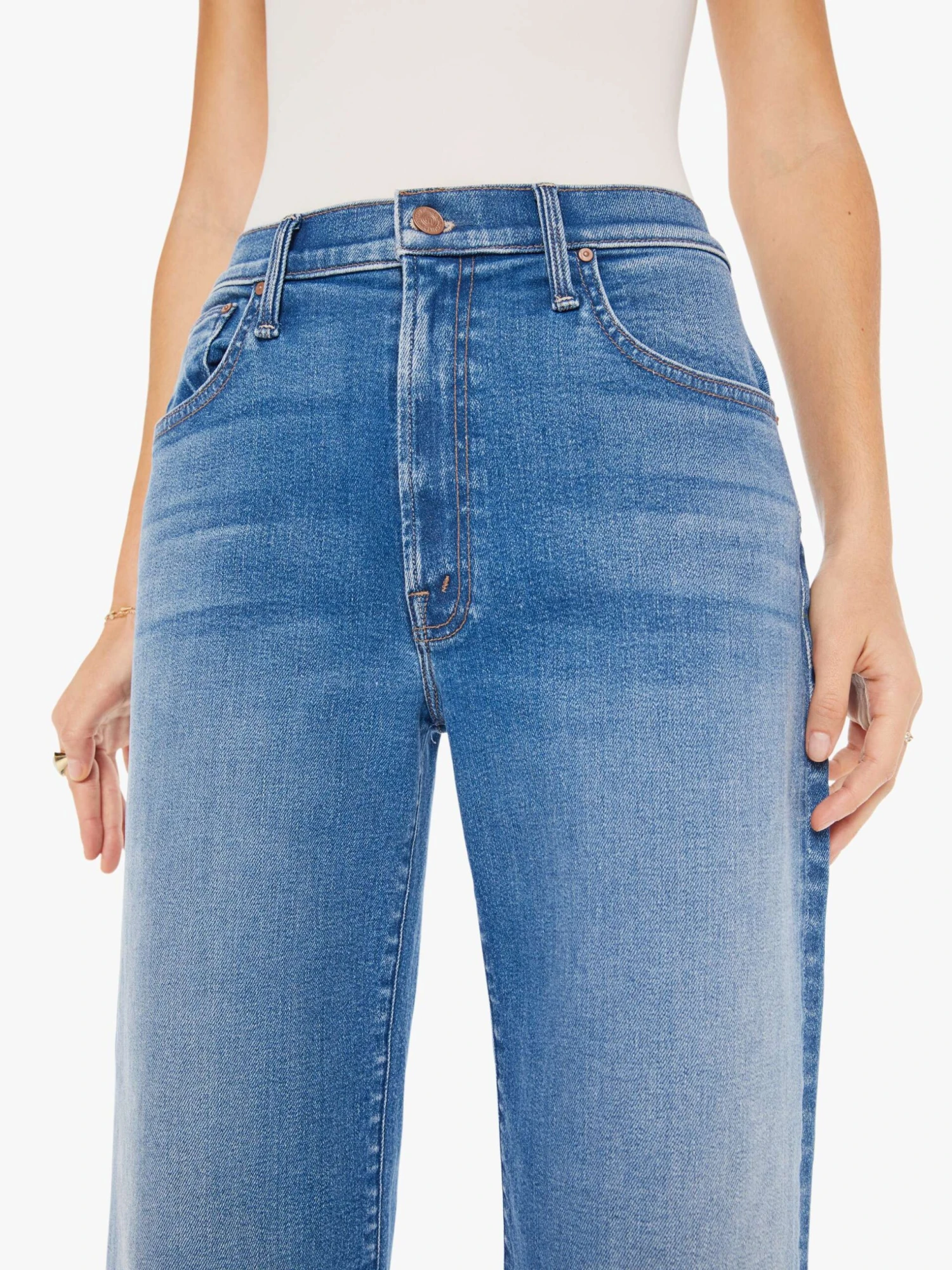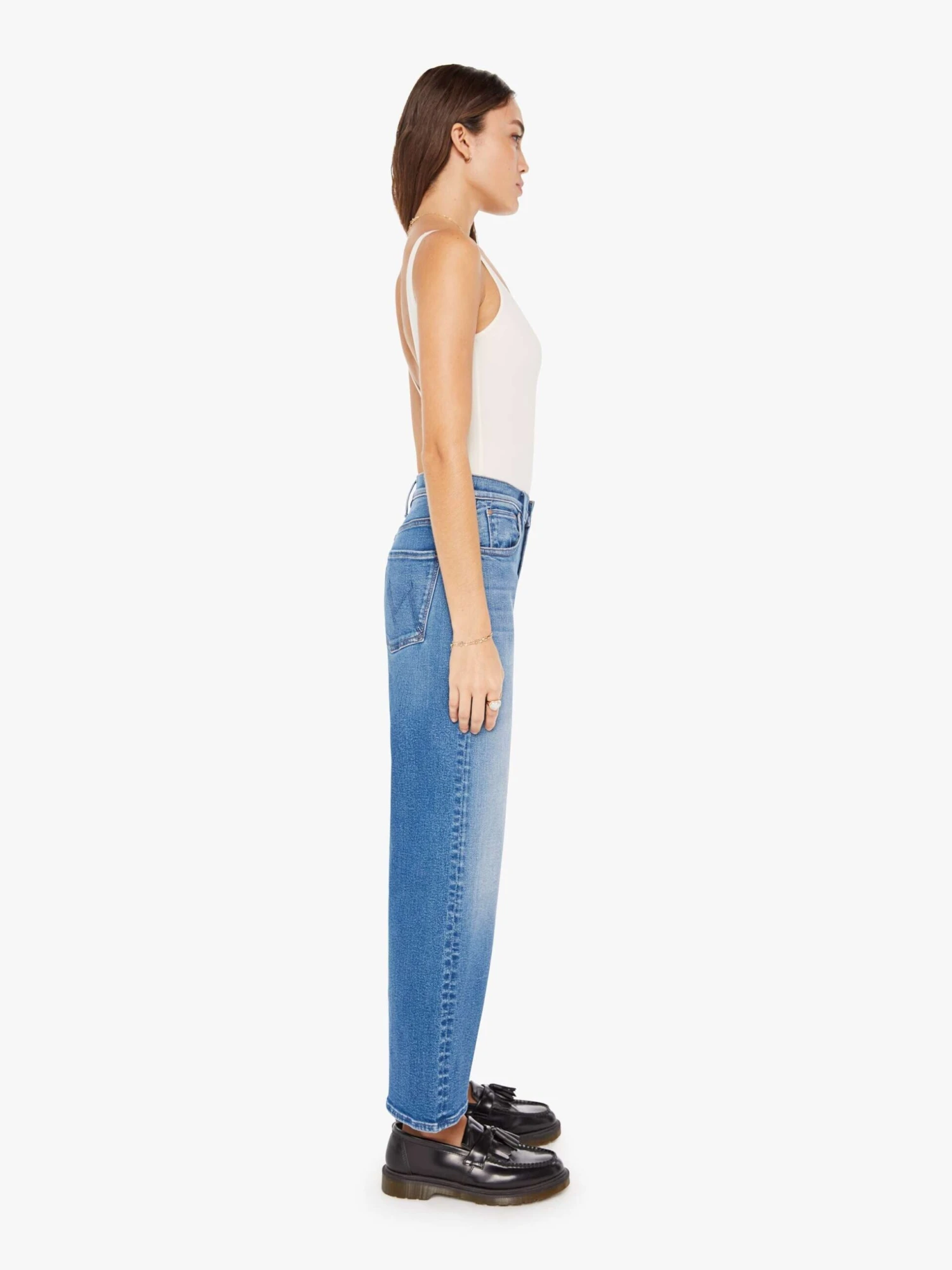 TGIF. Jeans designed to sit lower on the hips with a loose wide leg and an ankle-length inseam. Cut from stretch denim, Work Hard Play Hard is a mid-blue wash with subtle whiskering and fading at the knees.