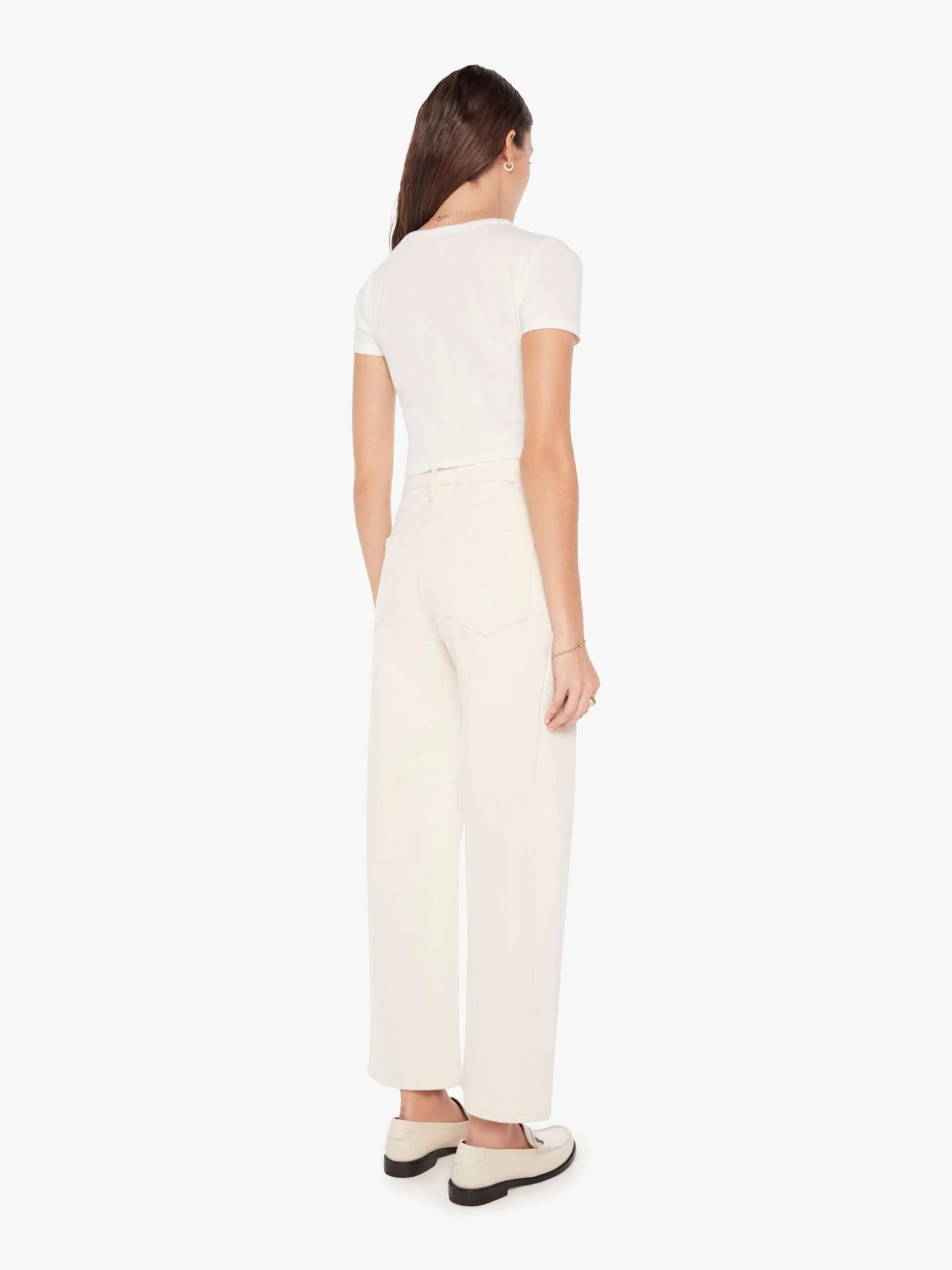 Au naturel. A super high-waisted jean with a wide, curved leg, an ankle-length inseam and a clean hem. Cut from a SUPERIOR cotton blend with a touch of stretch, Act Natural is a creamy white hue with tonal hardware.