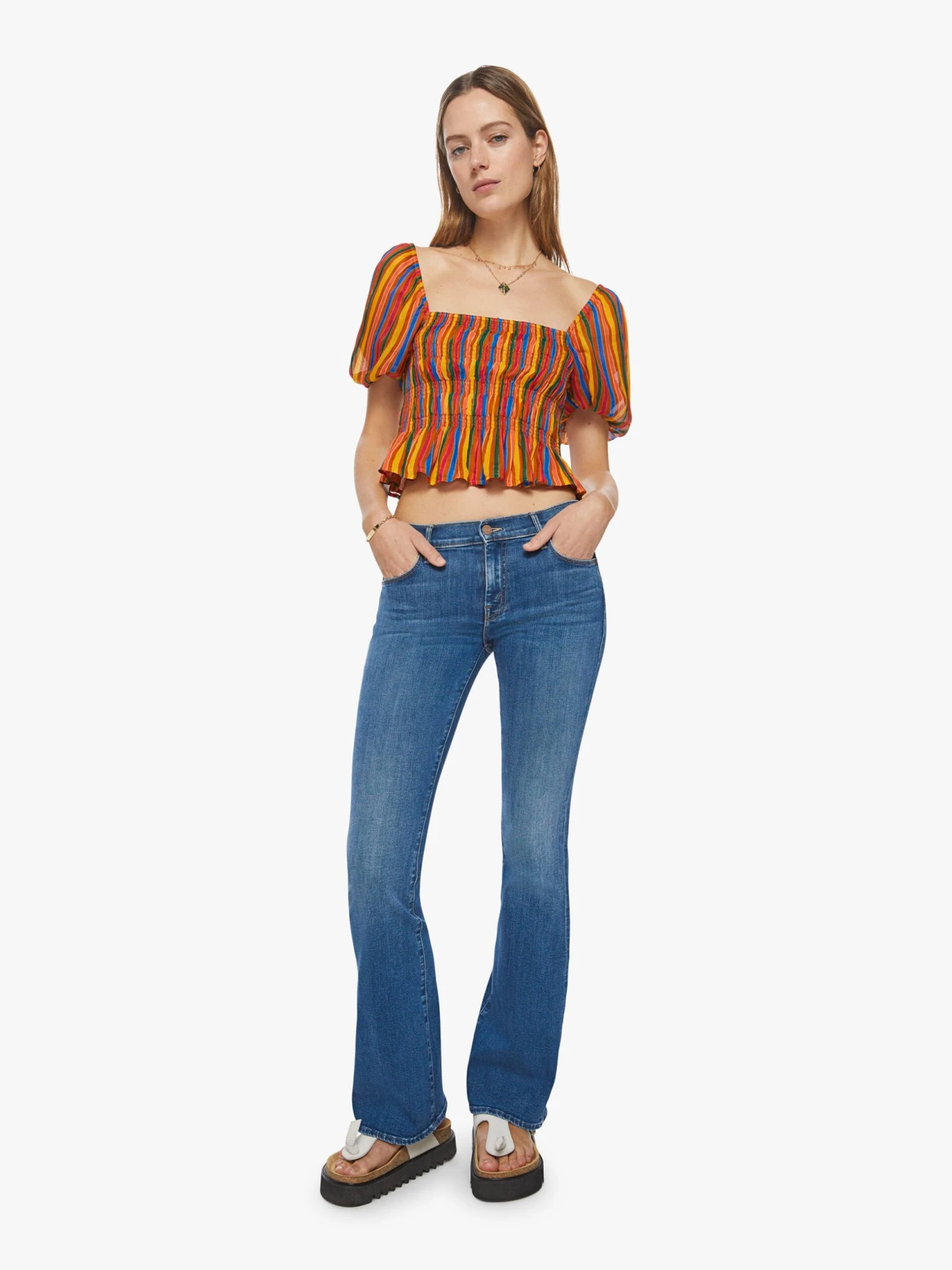 Only at MOTHER. A colorful, lightweight blouse with a square neck, short balloon sleeves, a smocked bodice and a cropped, ruffled hem. The top is designed in vertical rainbow stripes.