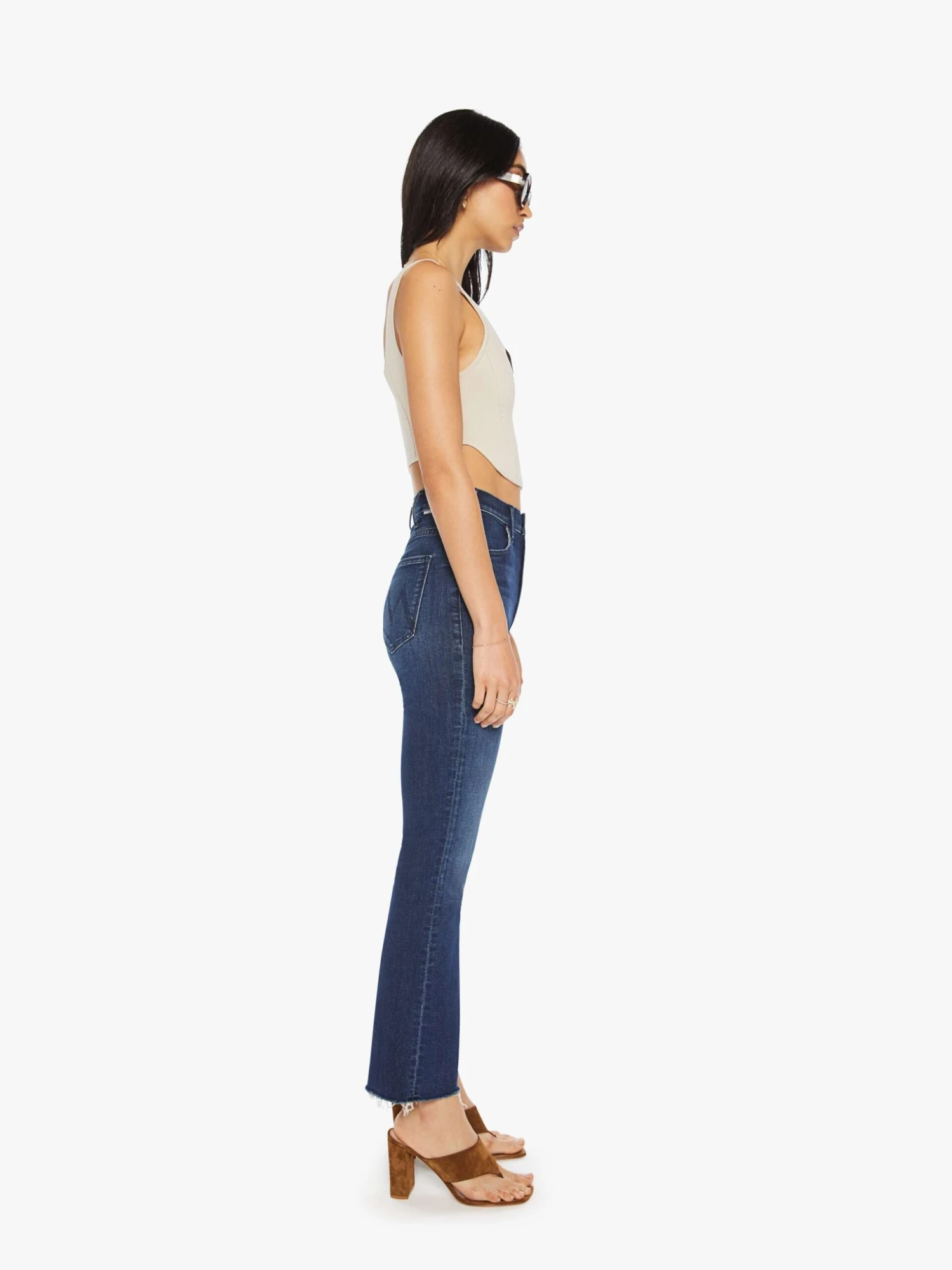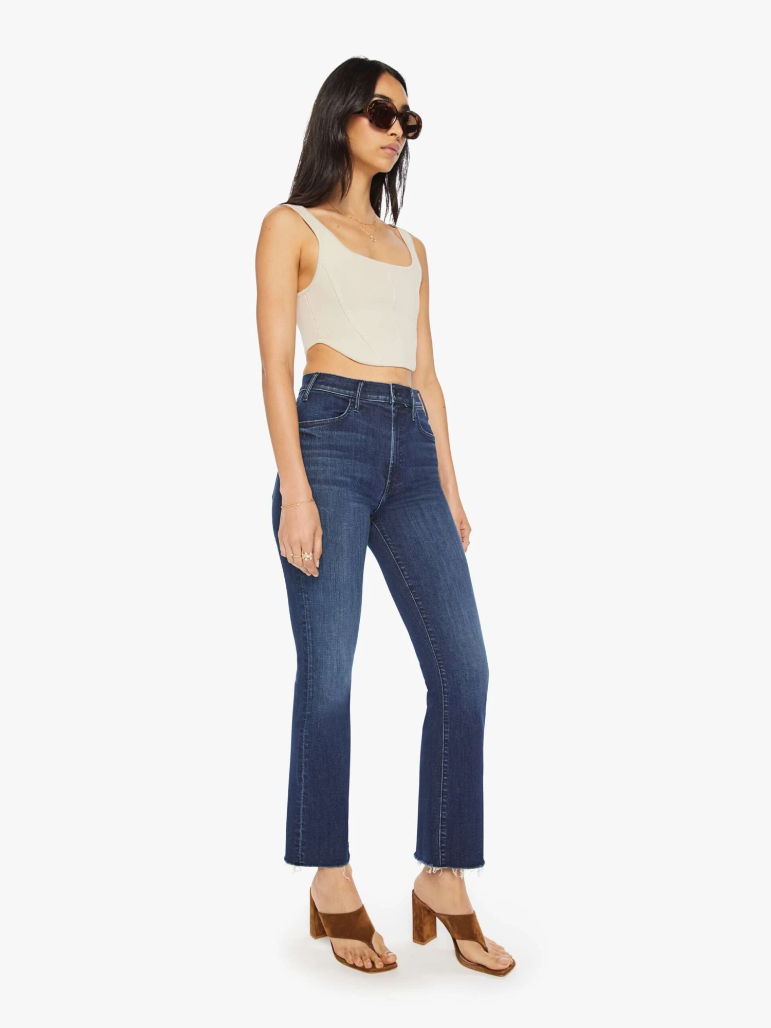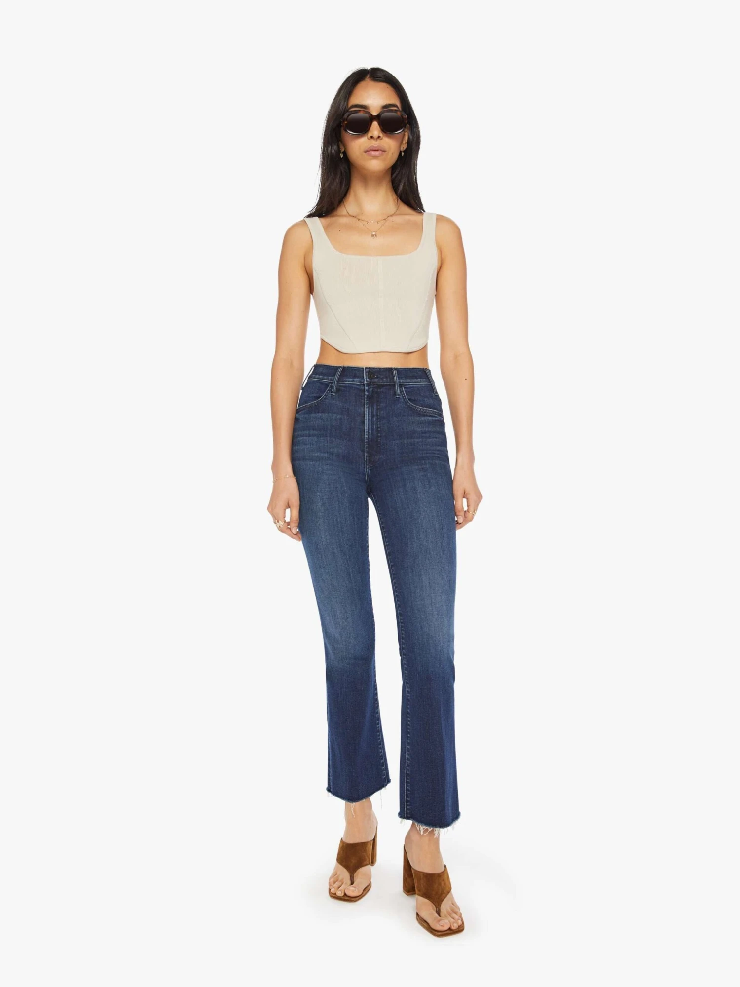 This bestselling high-rise flare has an ankle-length inseam and a raw hem. Cut from denim with a touch of stretch, Mint Condition is a dark blue wash with super subtle fading and whiskering.