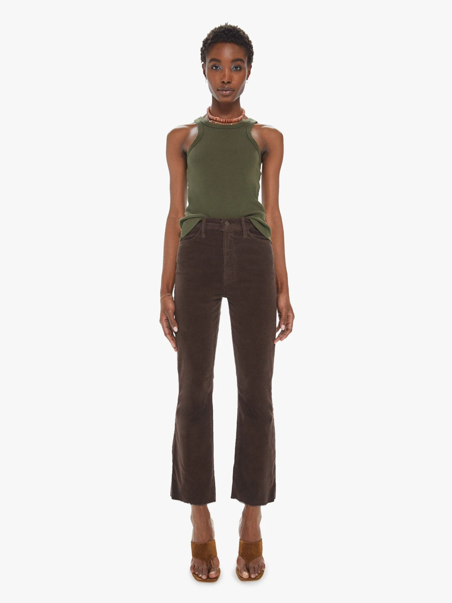 This bestselling high-rise flare has an ankle-length inseam and a raw hem. Cut from soft corduroy in a chocolate brown hue with tonal hardware.