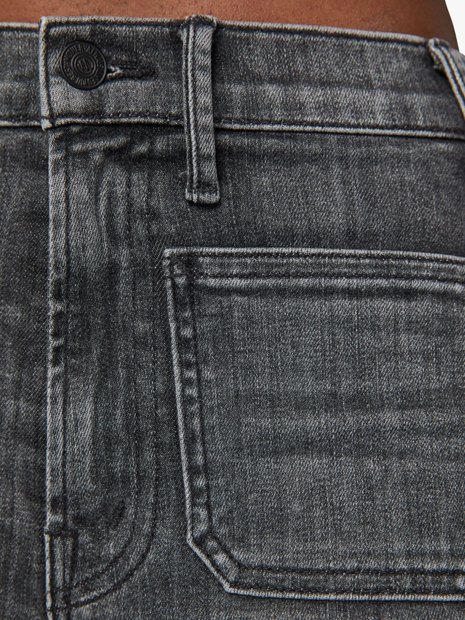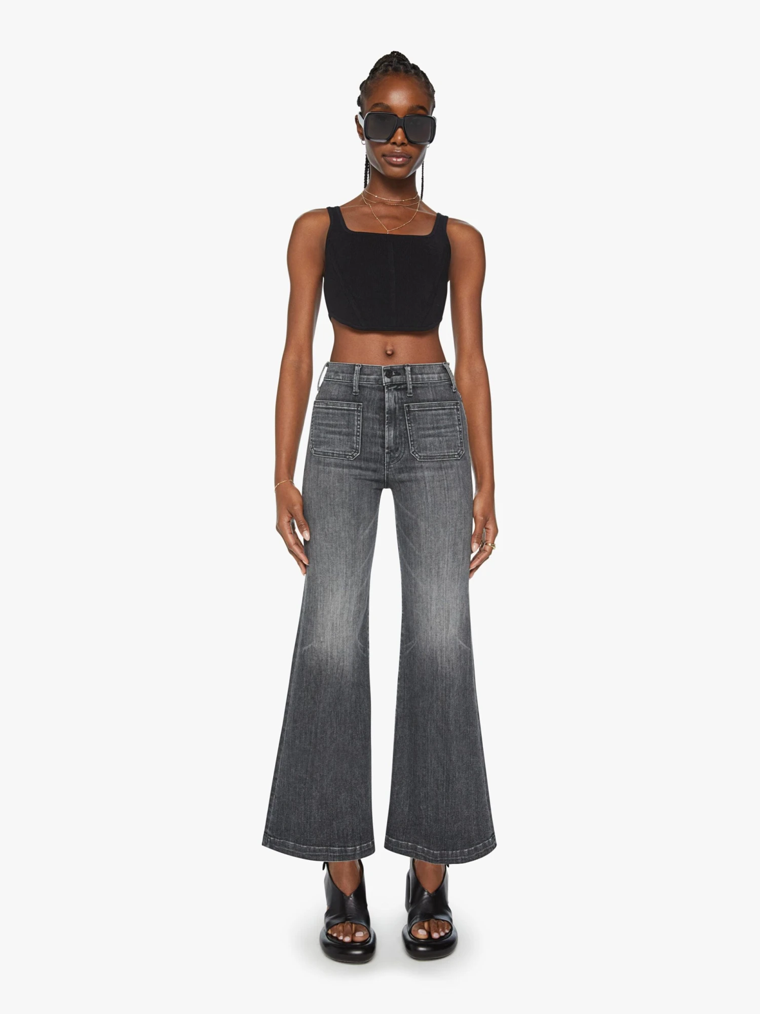 Soul searching. 70s-inspired wide leg jeans with a high rise, patch pockets, a 31-inch inseam and a clean hem. Crafted from denim with a touch of stretch, Save Your Soul is a faded black wash with whiskering and fading at the knee.