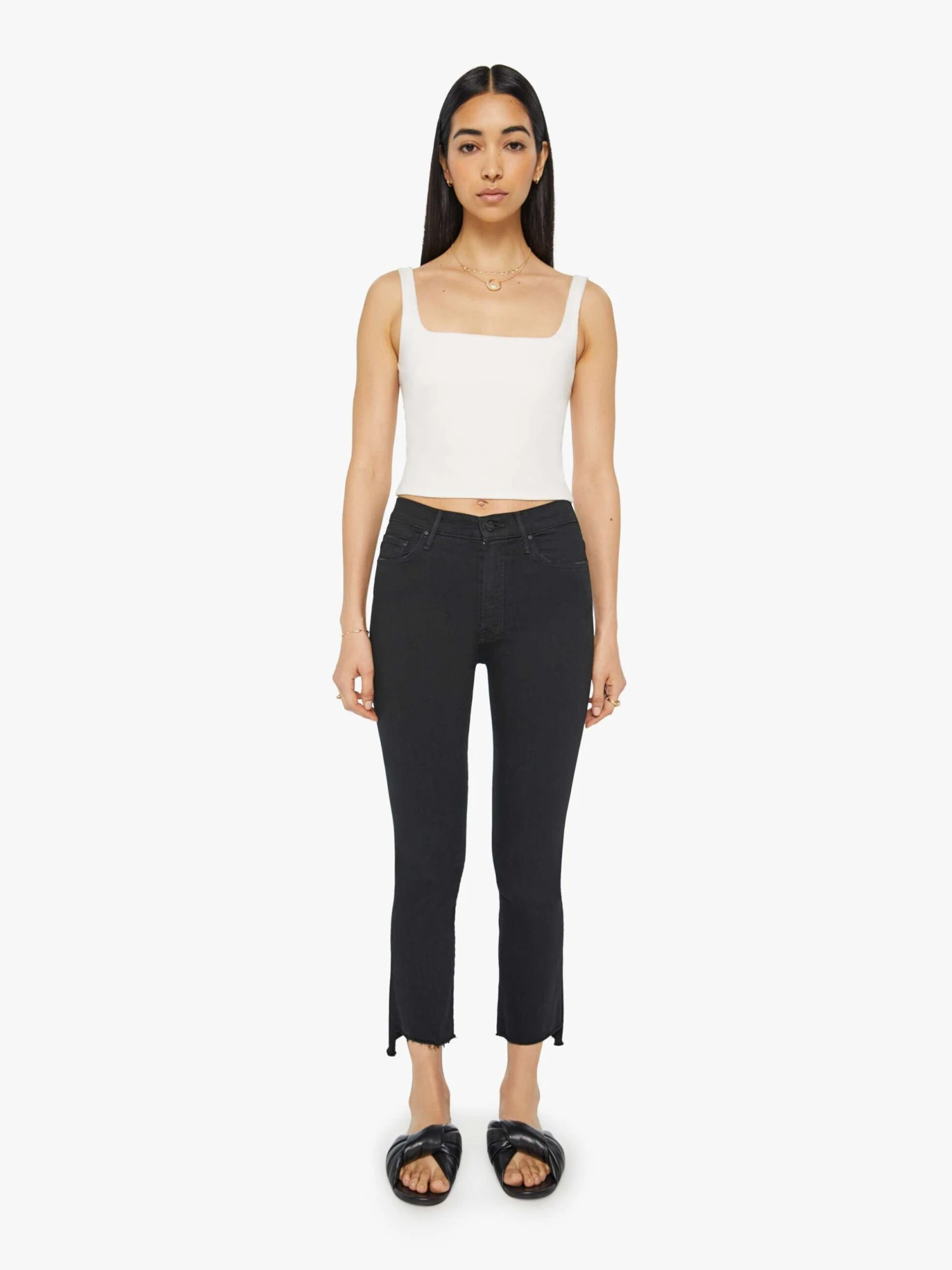 Plead the fifth. This iconic high-waisted bootcut hits at the ankle with a frayed step-hem. Made from stretch denim, Not Guilty is our bestselling black wash.