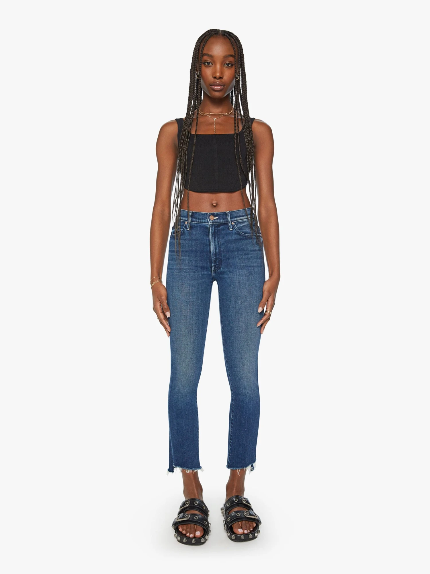 Kanpai. This iconic high-waisted bootcut is cropped at the ankle with a frayed step-hem. Cut from denim with a touch of stretch, Sake To Me is a dark blue wash with whiskering and fading at the knee.