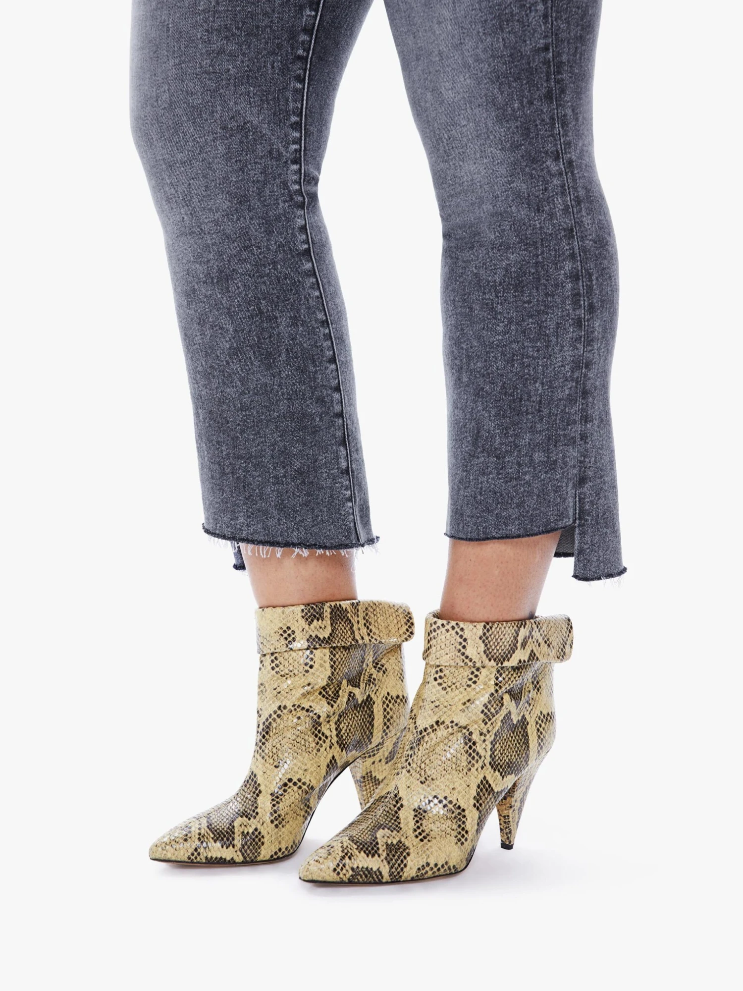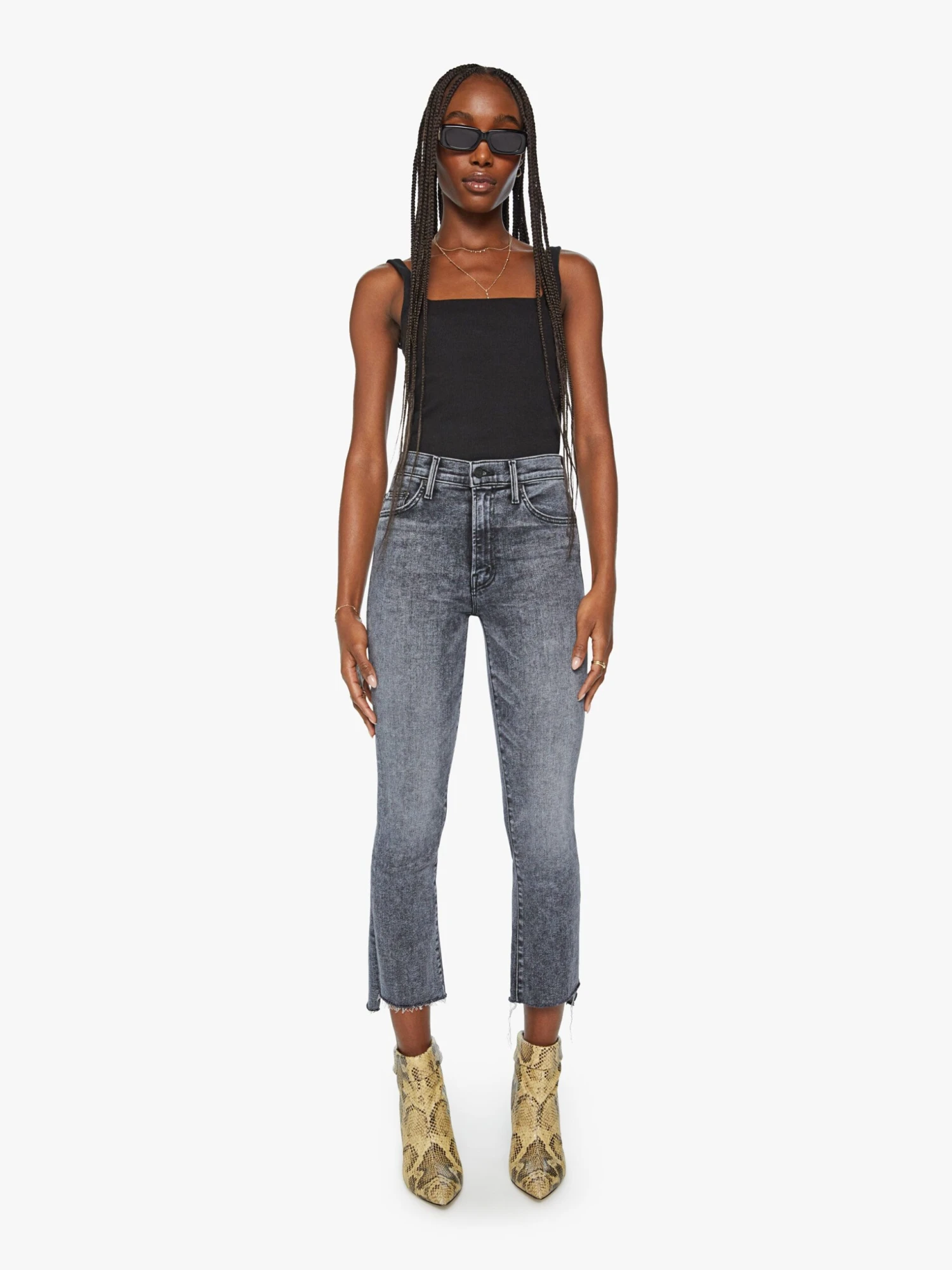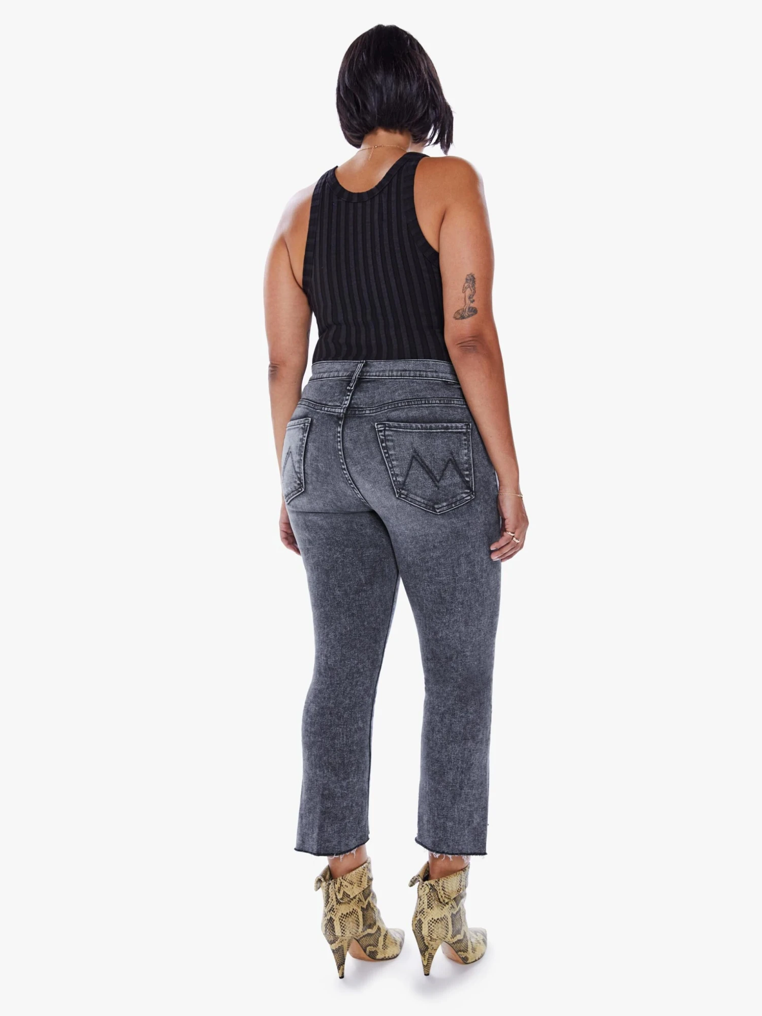 On schedule. This iconic high-waisted bootcut is cropped at the ankle with a frayed step-hem. Cut from soft stretch denim, Train Stops is a black mineral wash with high contrast whiskering and fading.