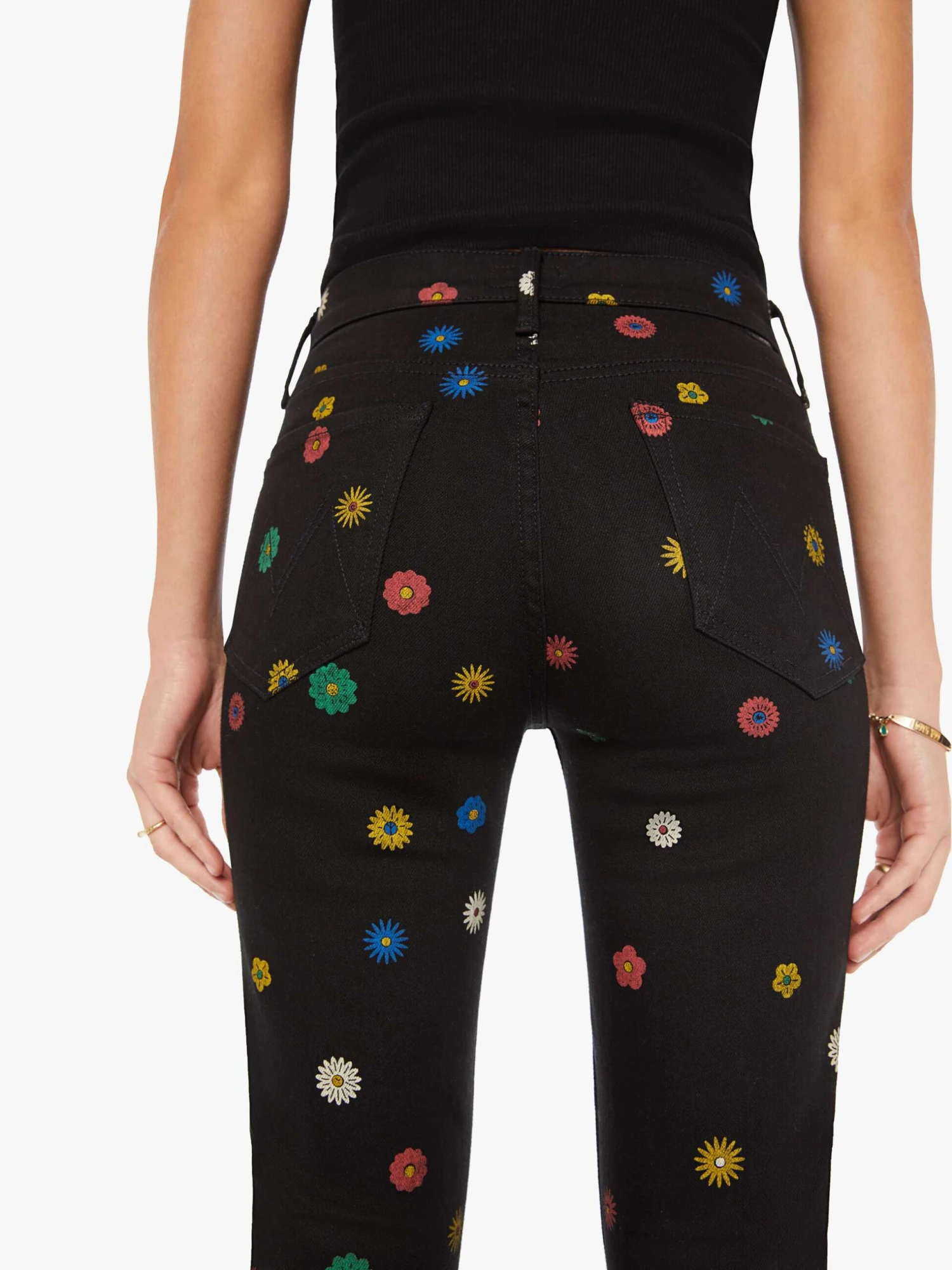 Woke up like this. This iconic high-rise bootcut has a 28.25-inch inseam and a clean hem. Made from a recycled cotton blend with a touch of stretch, Fresh As A Daisy is a black denim with colorful printed daisies throughout.