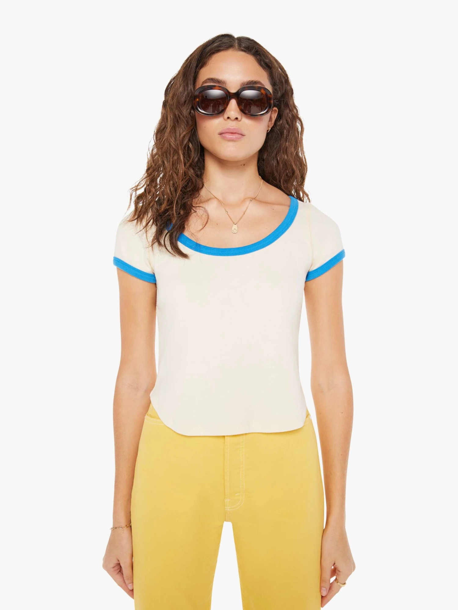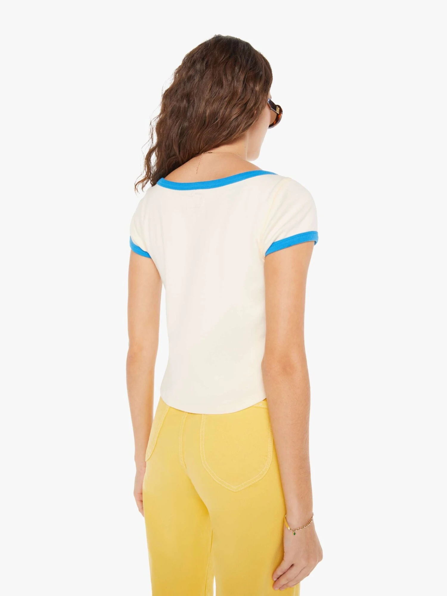 Finders keepers, losers weepers. A scoop neck tee from MOTHER’s Lost & Found capsule, a nostalgic collection that evokes the carefree spirit of a summer vacation in the 80s and feels just like a family road trip in that trusty old station wagon. The baby tee is designed with a deep scoop neck, short sleeves, a slim fit and a cropped, curved hem. It’s made from 100% cotton in cream with bright-blue trim.