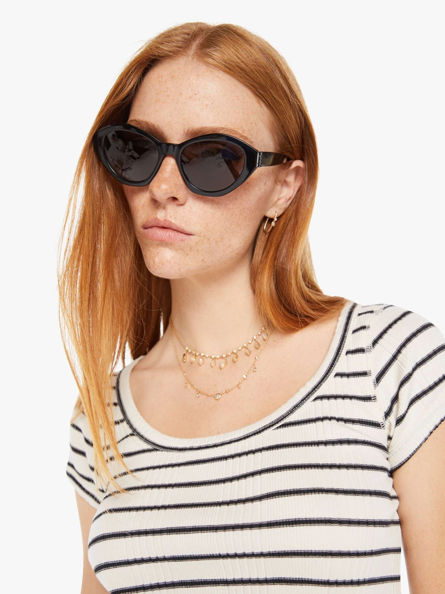 Read between the lines. A scoop neck baby tee with a cropped hem and slim fit. The top is made from a cotton blend in a black and white stripe pattern.