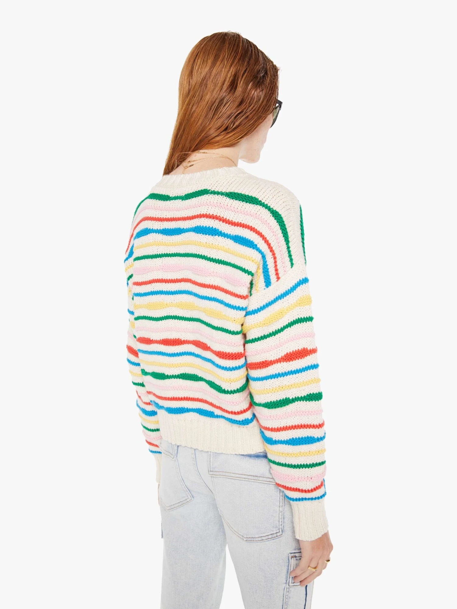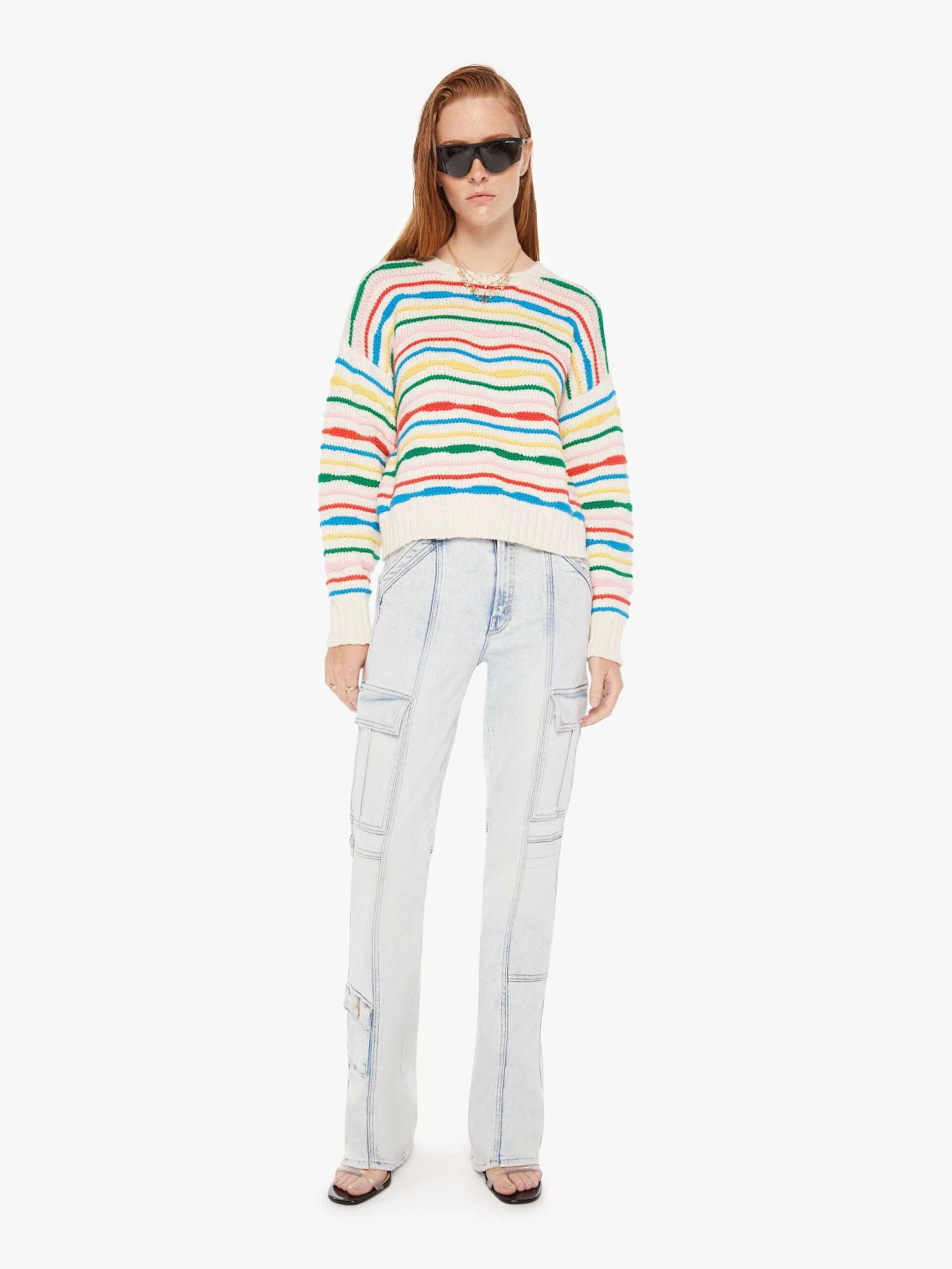 Tubular. A crewneck sweater with drop shoulders and a cropped, boxy fit. Made from 100% cotton in cream, the sweater is designed with soundwave-inspired rainbow stripes.