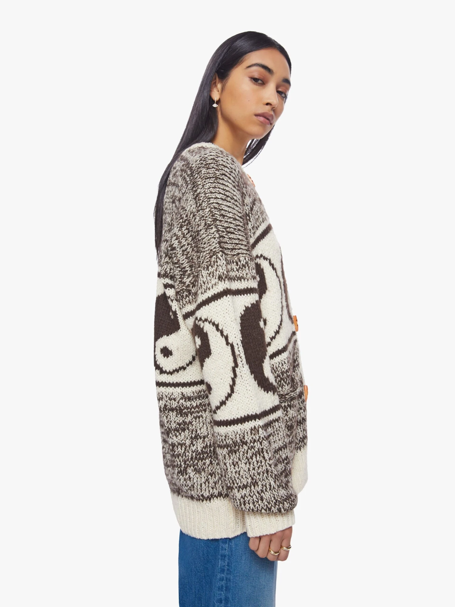 Opposites attract. An oversized crewneck cardigan with drop shoulders, long balloon sleeves and ribbed hems. Made from a chunky blend of cotton and alpaca, The Good And The Bad is a marled brown and white knit with yin-yangs, horizontal stripes and vintage-inspired wooden buttons.