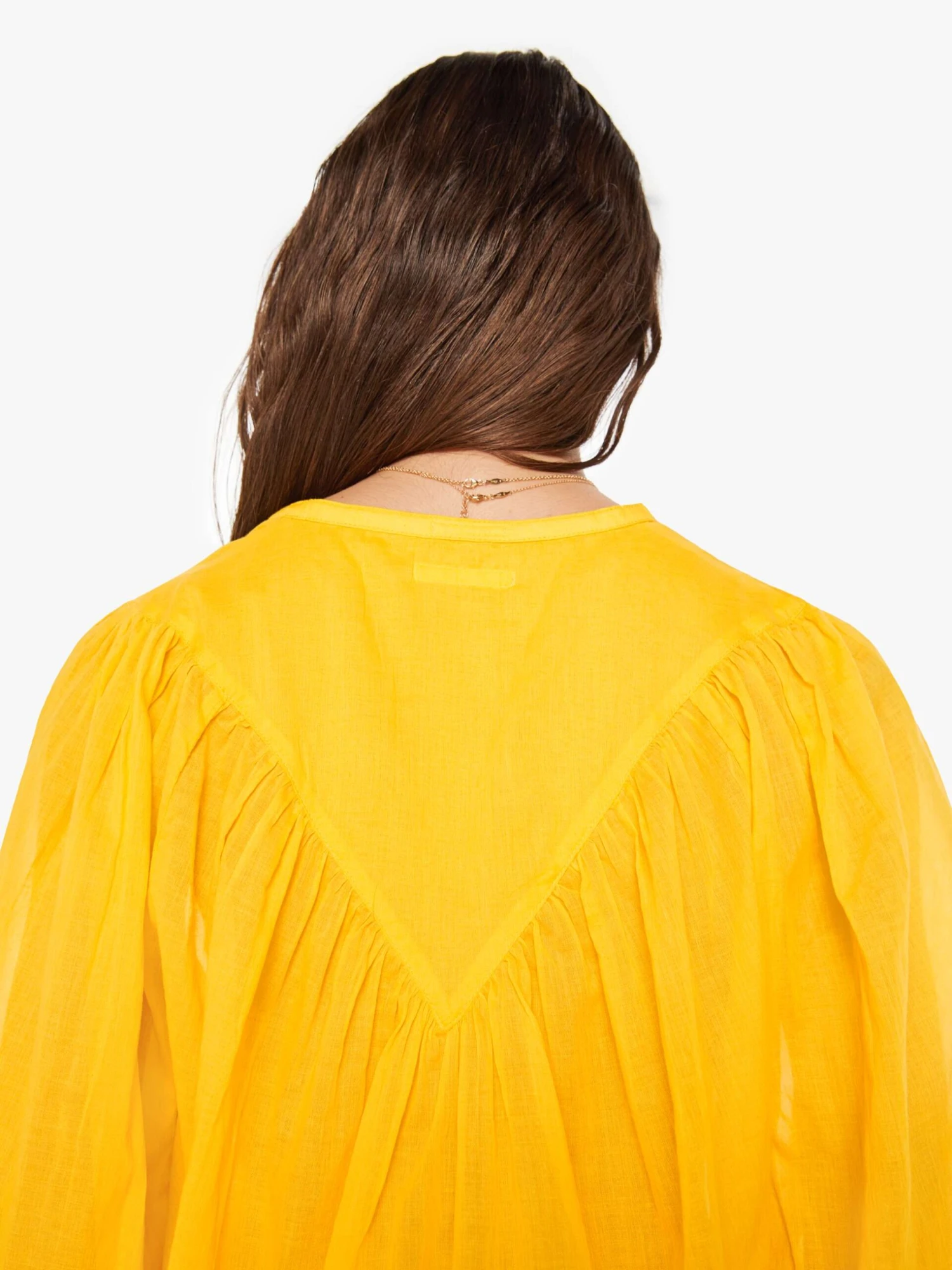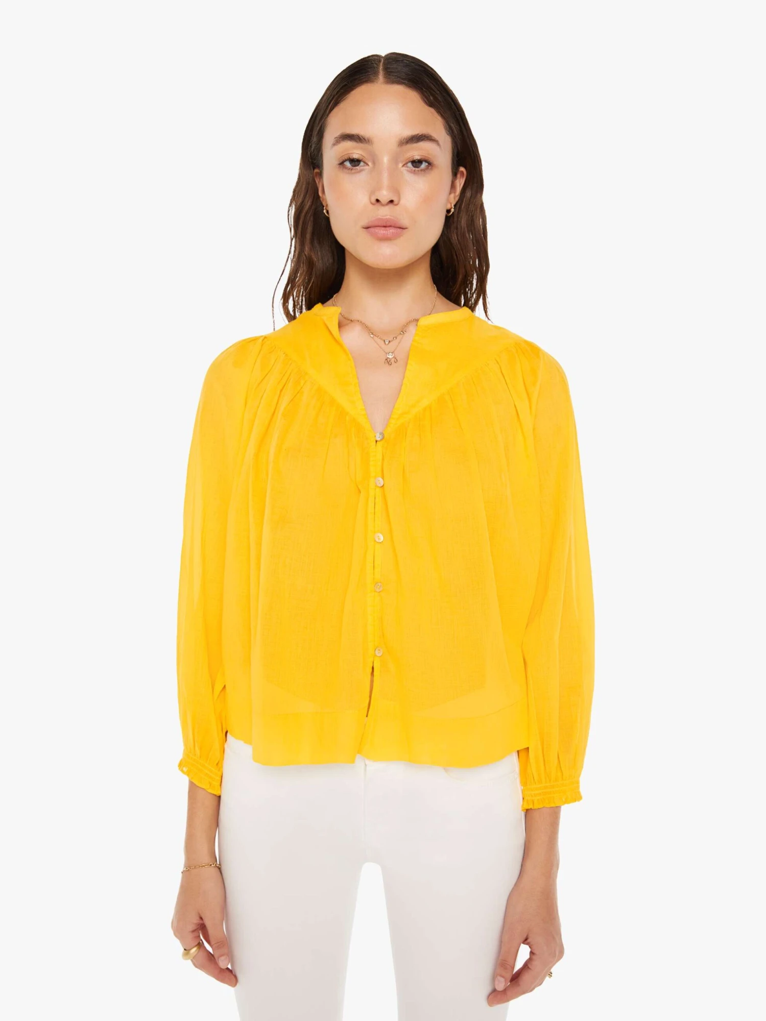 Look on the bright side. A lightweight blouse with a buttoned V-neck, 3/4-sleeves, a slightly cropped hem and ruffles across the chest. The top is made from semi-sheer 100% cotton in bright yellow with shell buttons down the front.
