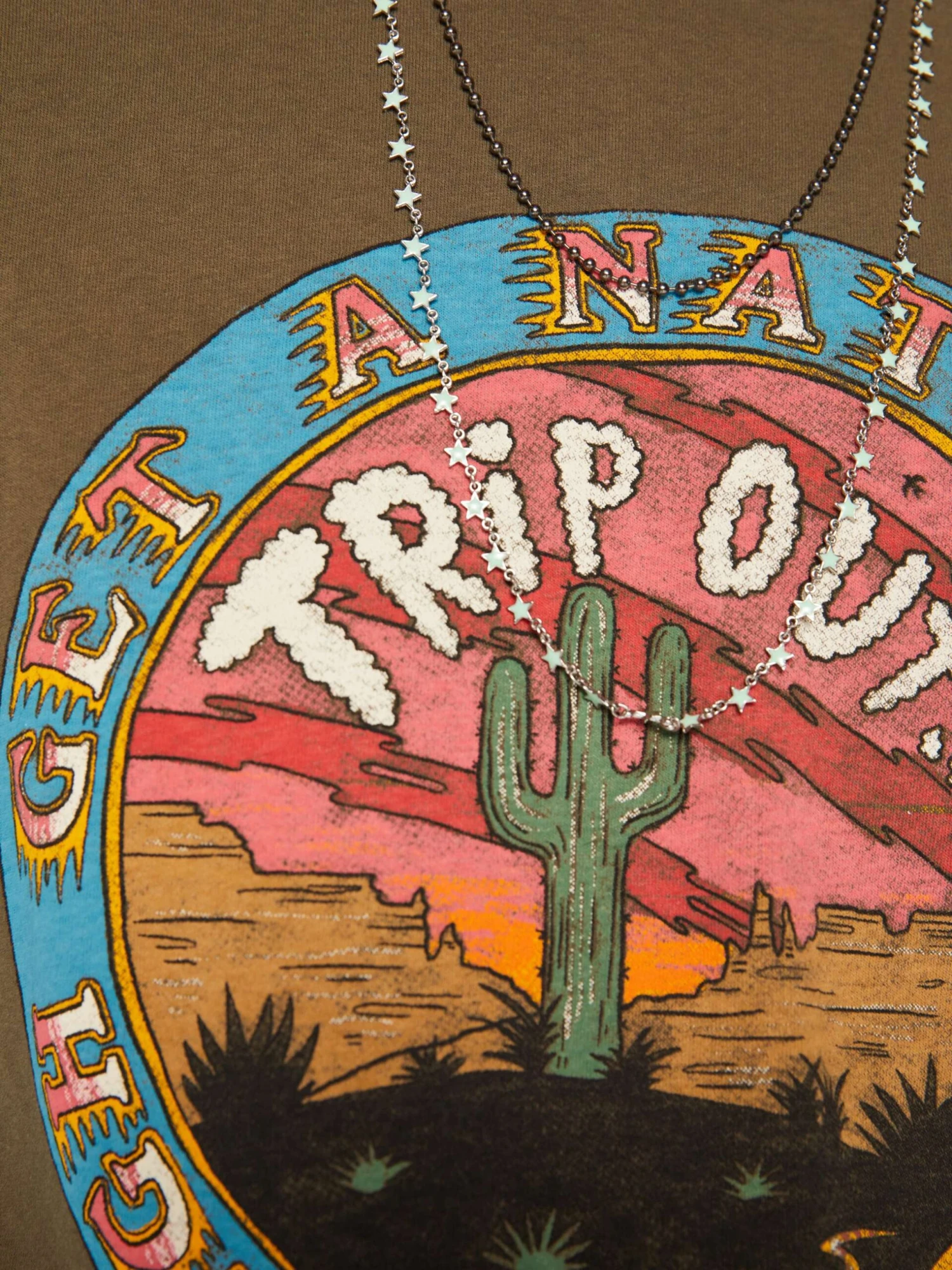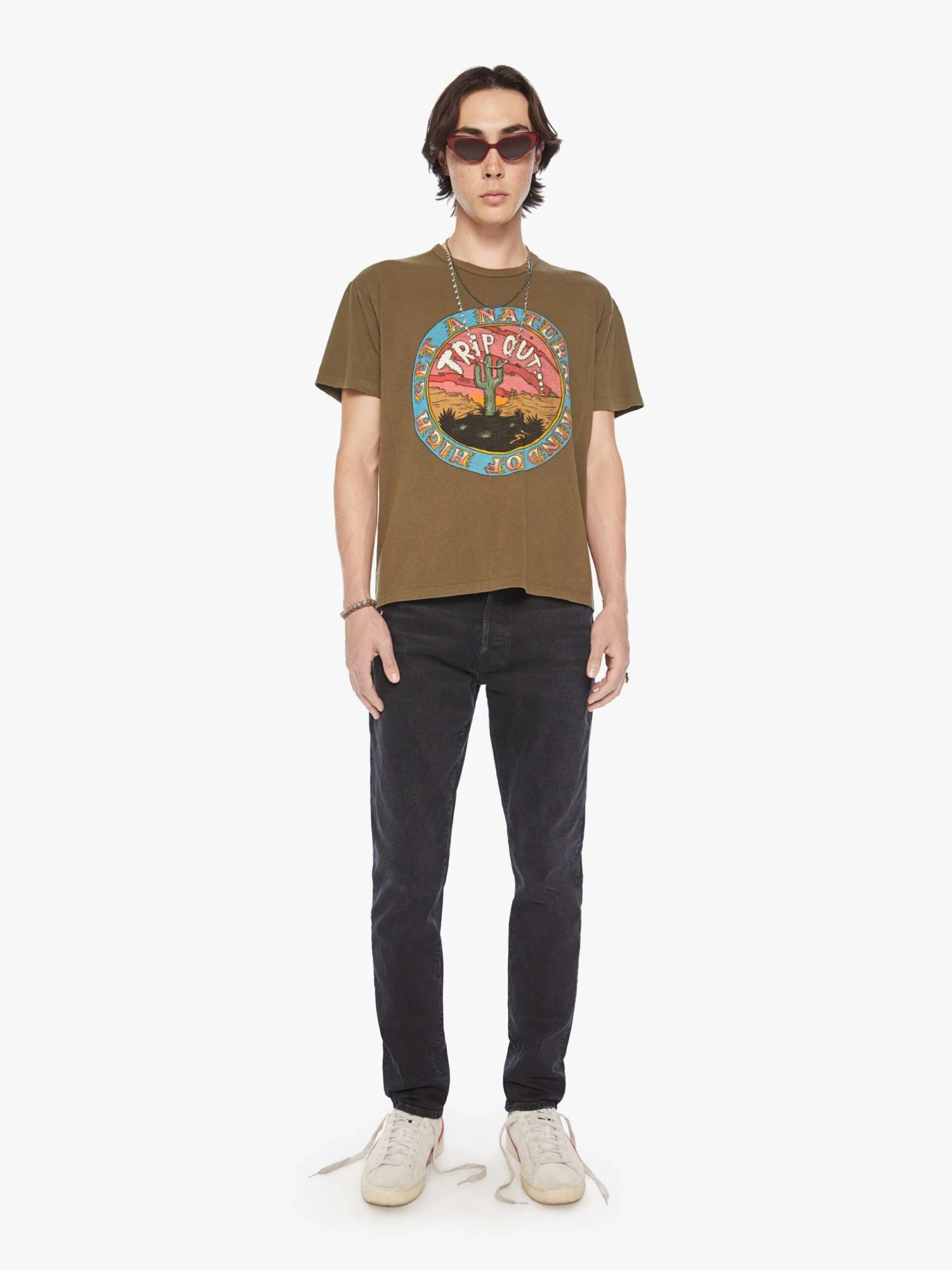 Natural high. An oversized tee with drop shoulders and a loose fit. Made from 100% cotton in an olive-brown hue, the tee features a desert-themed graphic with text on the front.