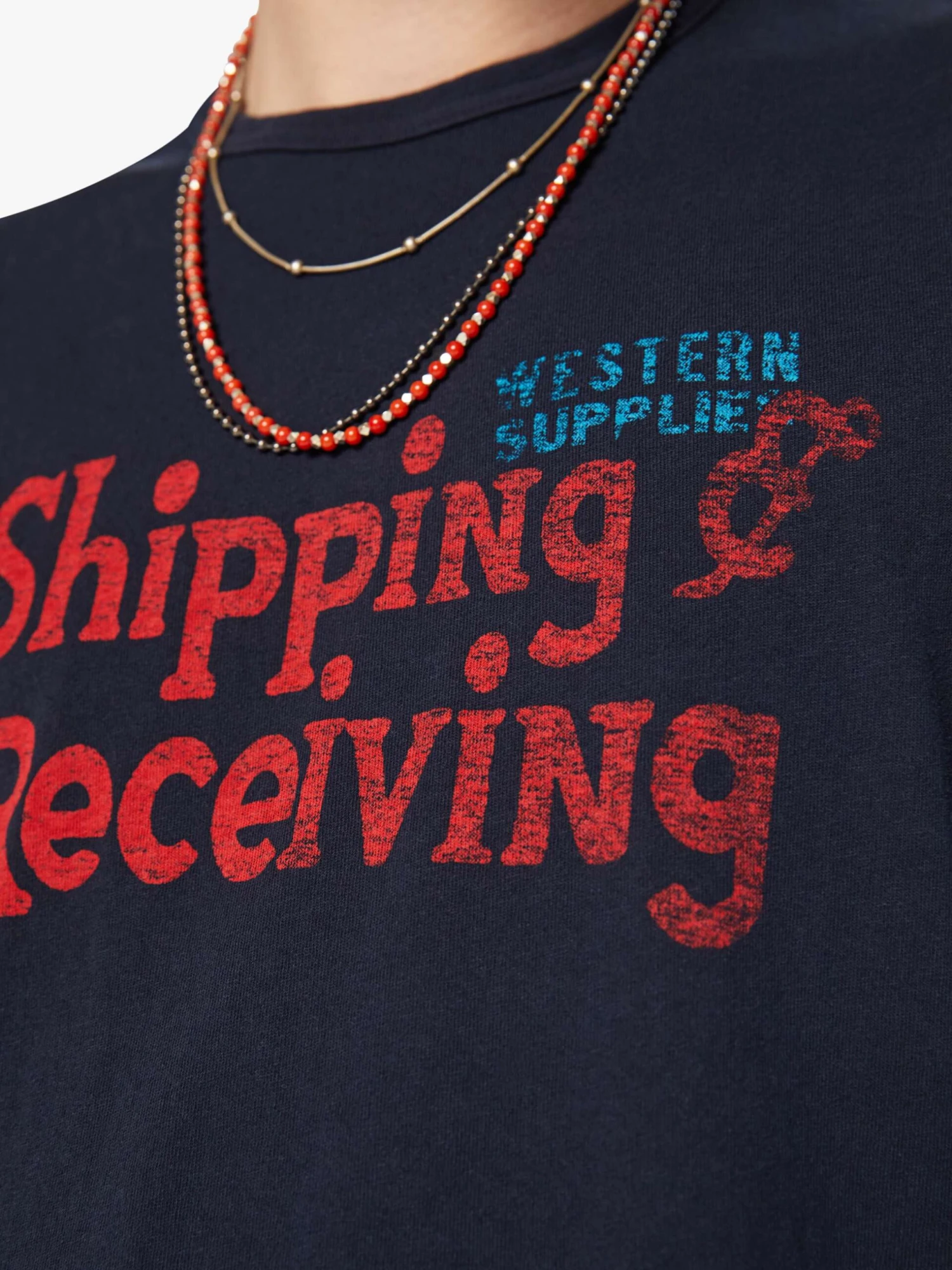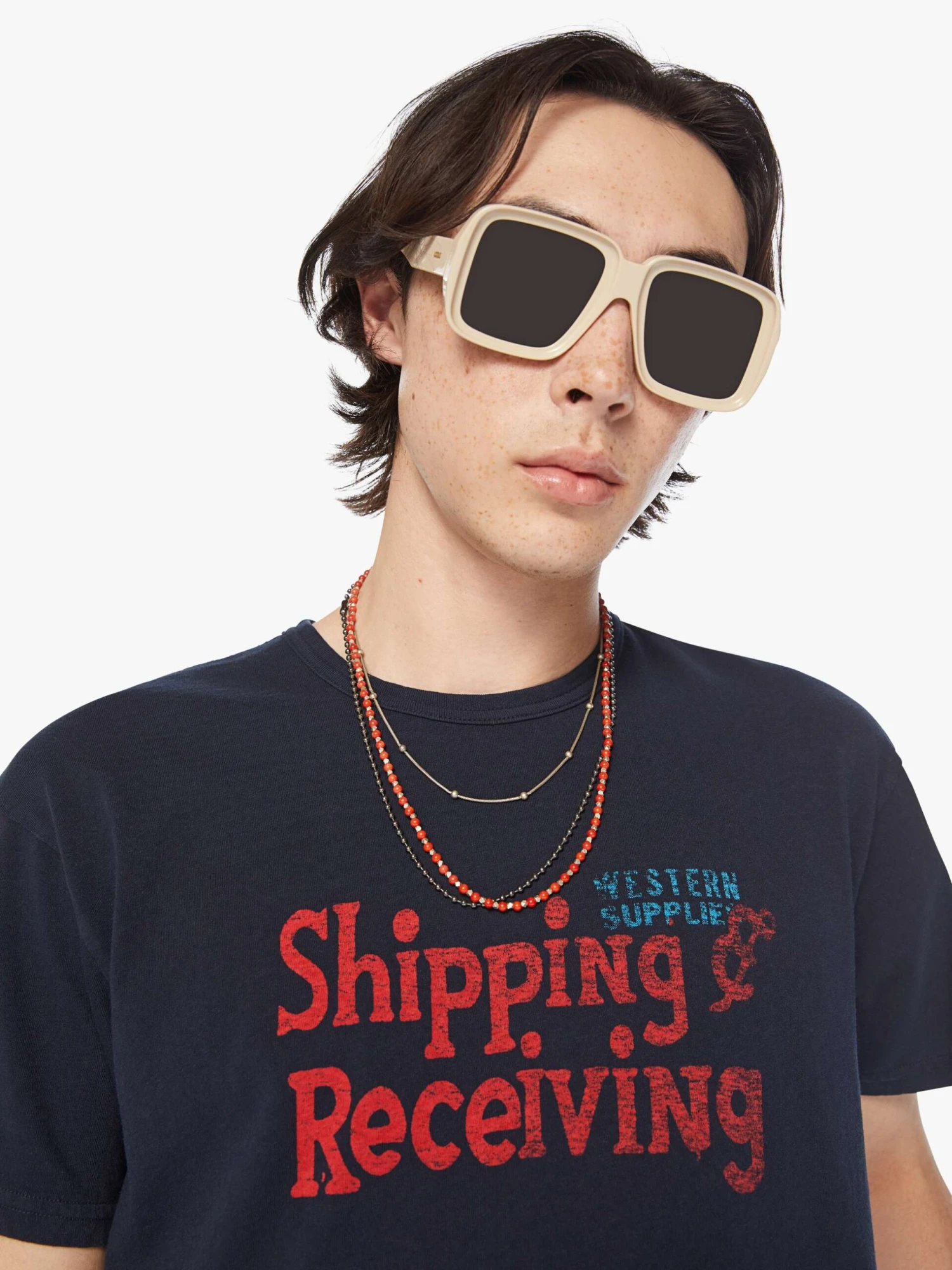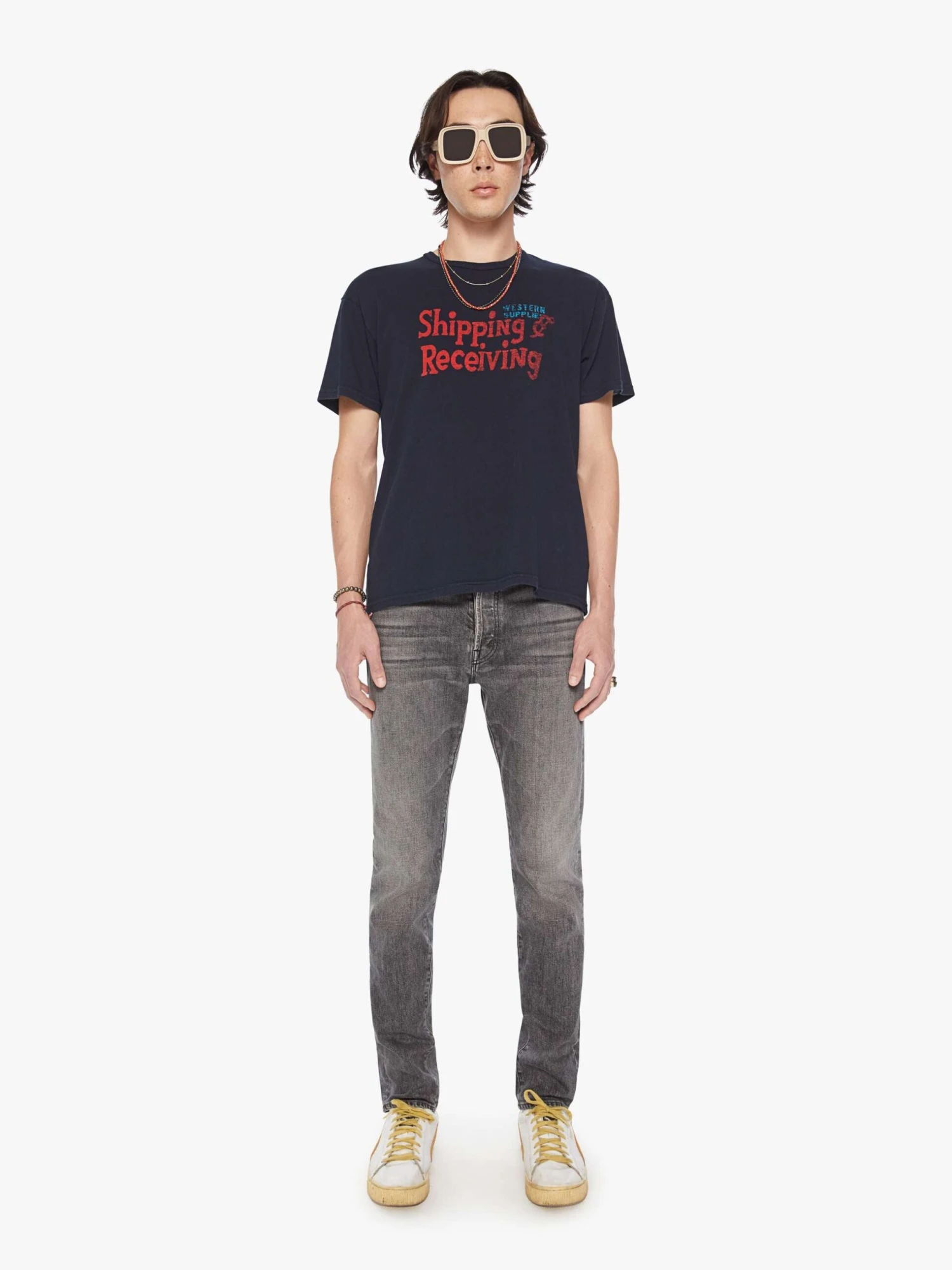 Ship happens. An oversized tee with drop shoulders and a loose fit. Made from 100% cotton in a faded black hue, the tee features a worn-in text graphic inspired by a vintage fulfillment company advertisement.