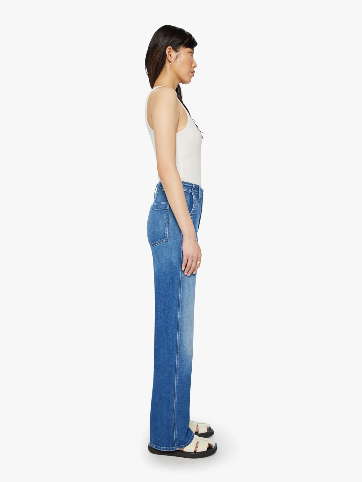 TGIF. A super high-rise straight-leg jean with a zip fly, wide leg, side slit pockets and a clean 31-inch inseam. Cut from stretch denim, Work Hard Play Hard is a mid-blue wash with subtle whiskering and fading at the knees.