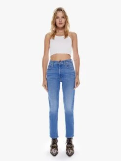 Howdy, partner. Our most popular mid-rise straight leg with an ankle-length inseam and a frayed hem. Crafted from denim with a touch of stretch, New Sheriff In Town is a mid-blue wash with fading and whiskering.