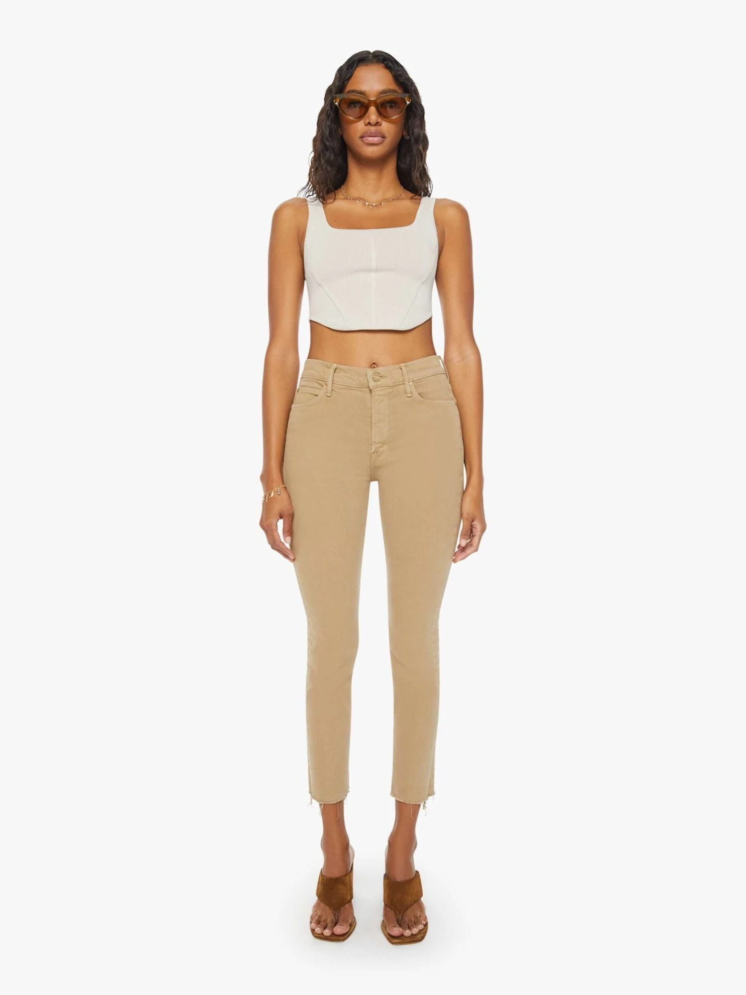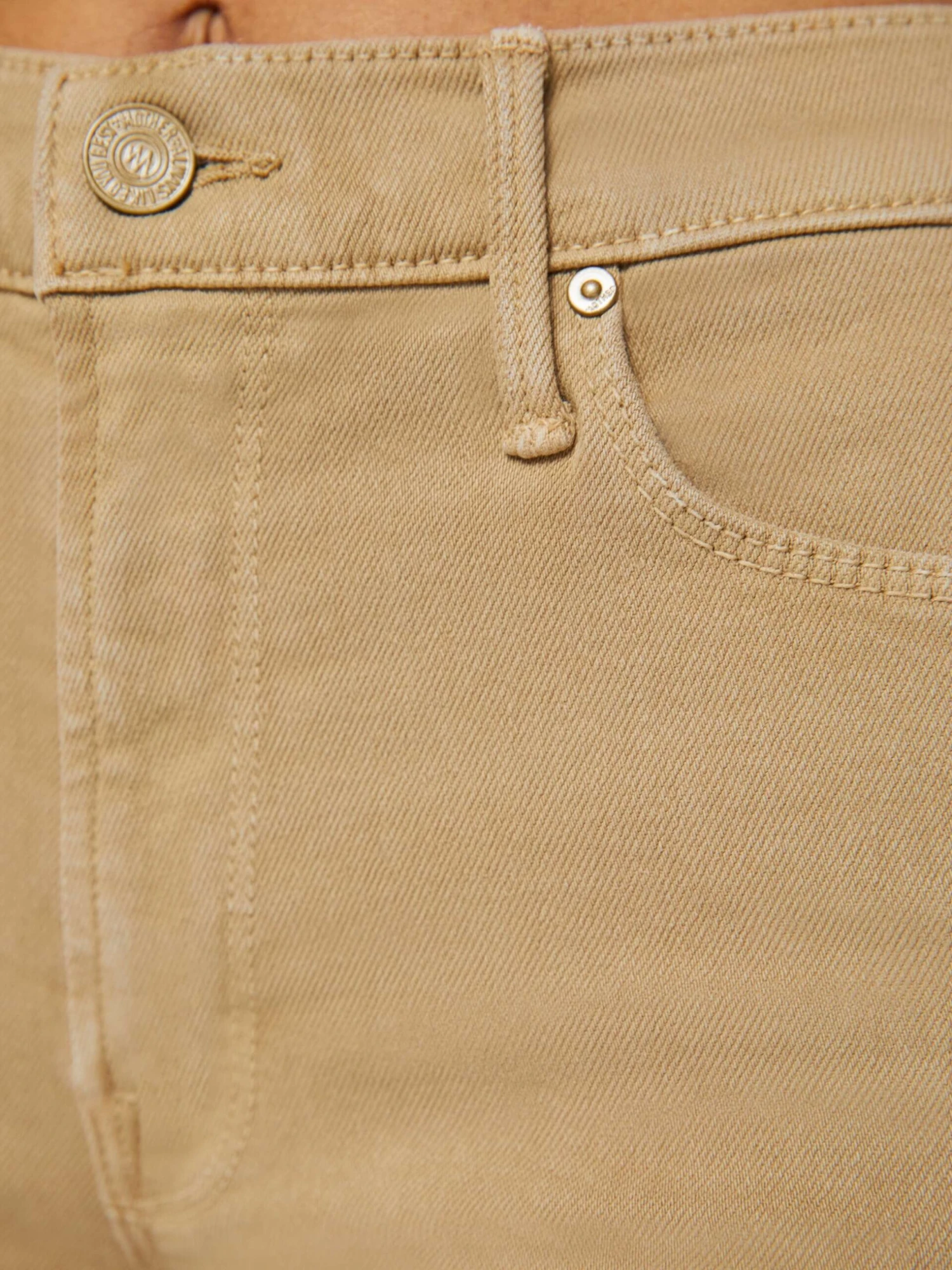 Only at MOTHER. Our most popular mid rise has a straight leg with an ankle-length inseam and a frayed hem. Made from a cotton blend with a touch of stretch, Prairie Sand is a light khaki with tonal hardware.