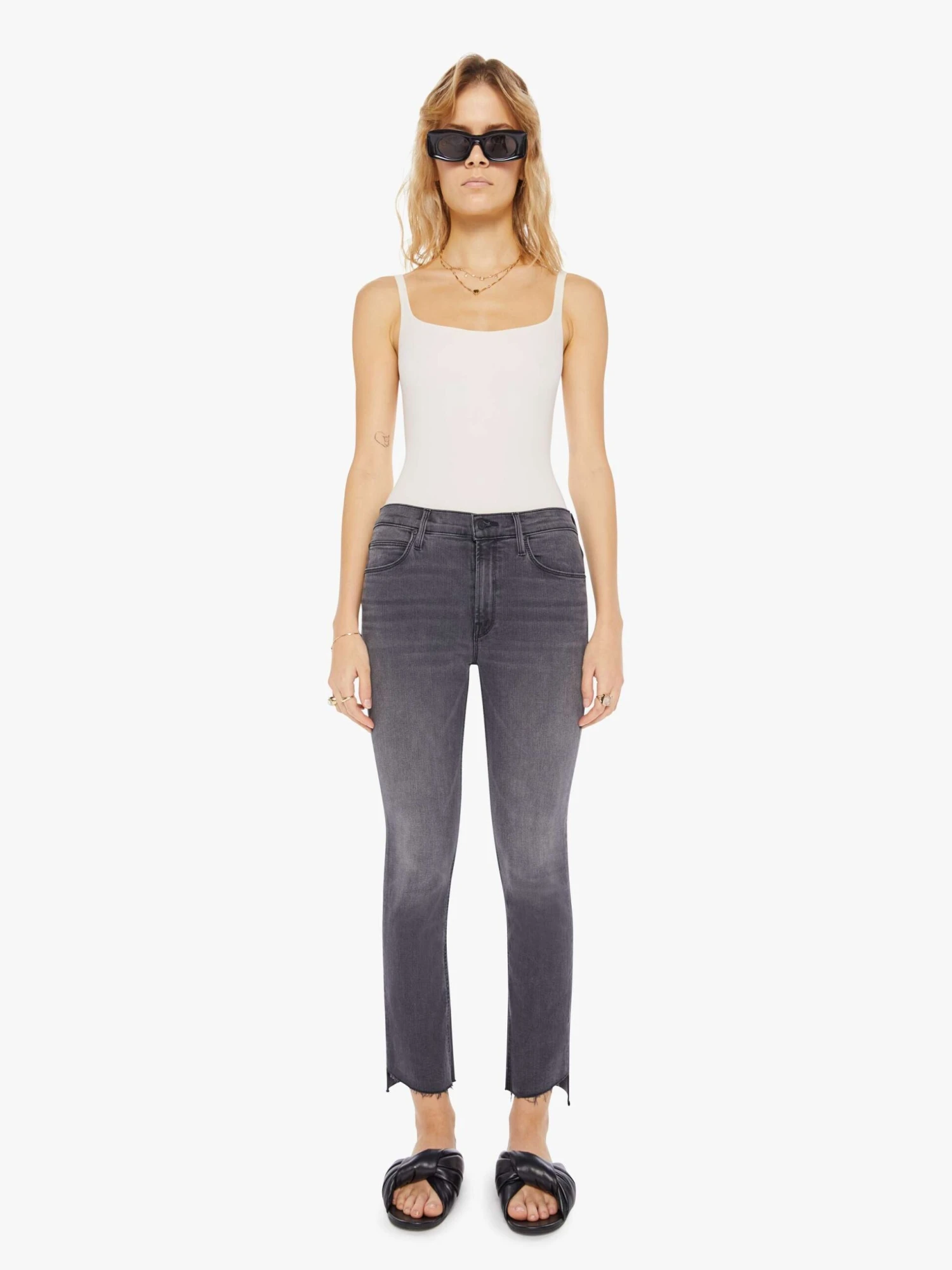 Exclusively here. Our most popular mid-rise jean has a straight leg with an ankle-length inseam and a frayed step hem. Made from stretch denim, Lighting Up Lanterns is a faded black wash. Only at MOTHER.