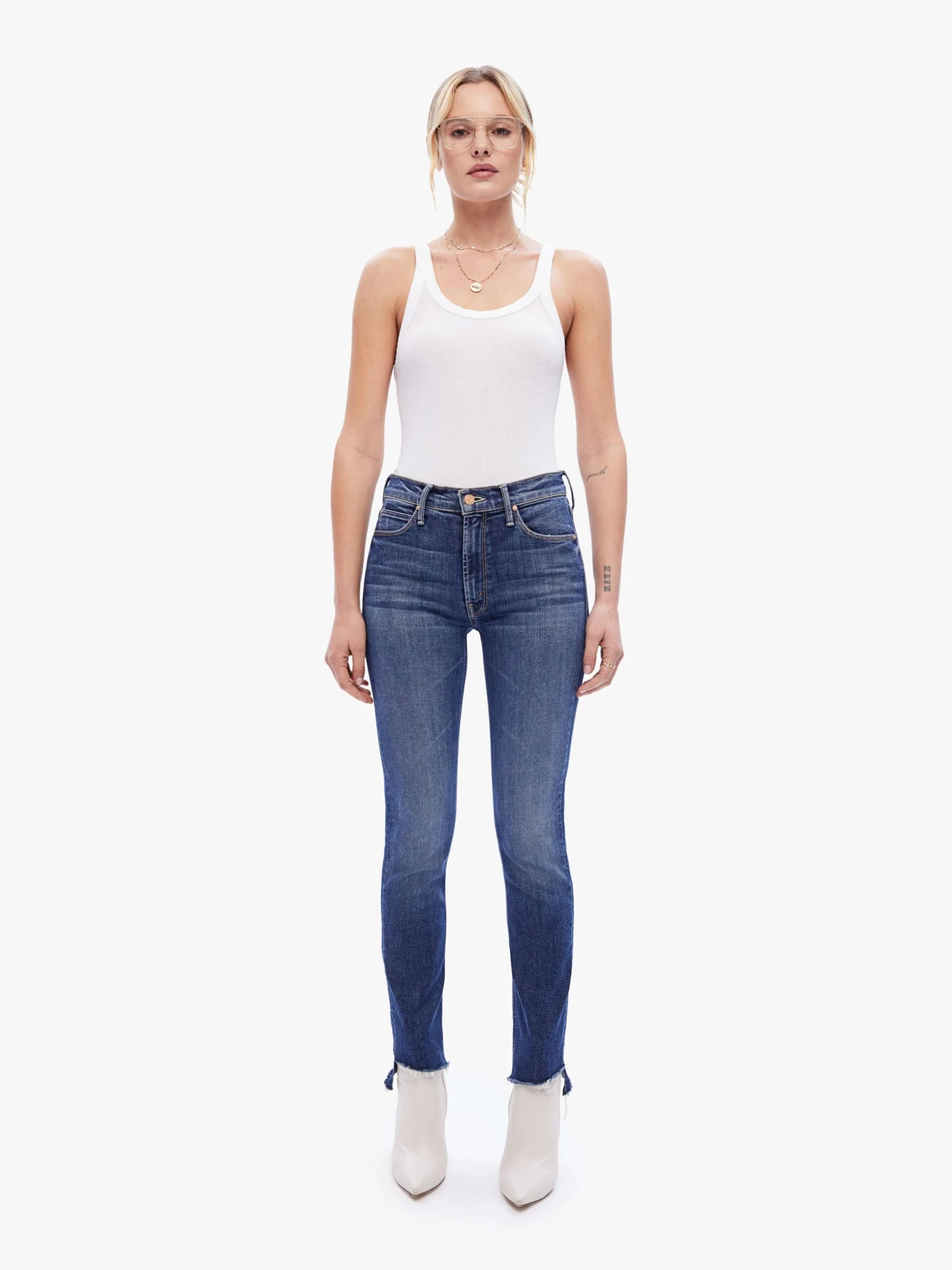 Only at MOTHER. most popular mid-rise jean has a straight leg with an ankle-length inseam and a frayed step hem. Made from stretch denim, On The Edge is a dark blue wash with subtle fading.
