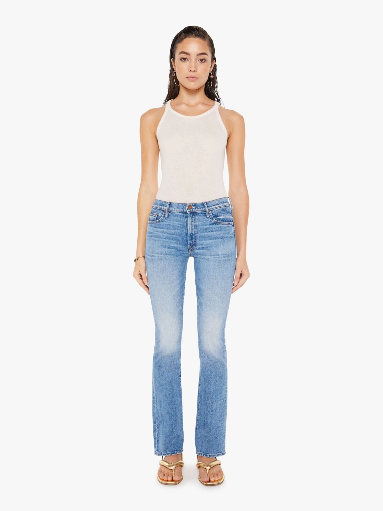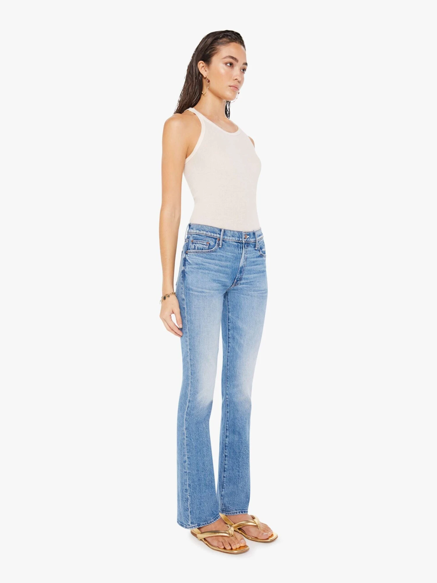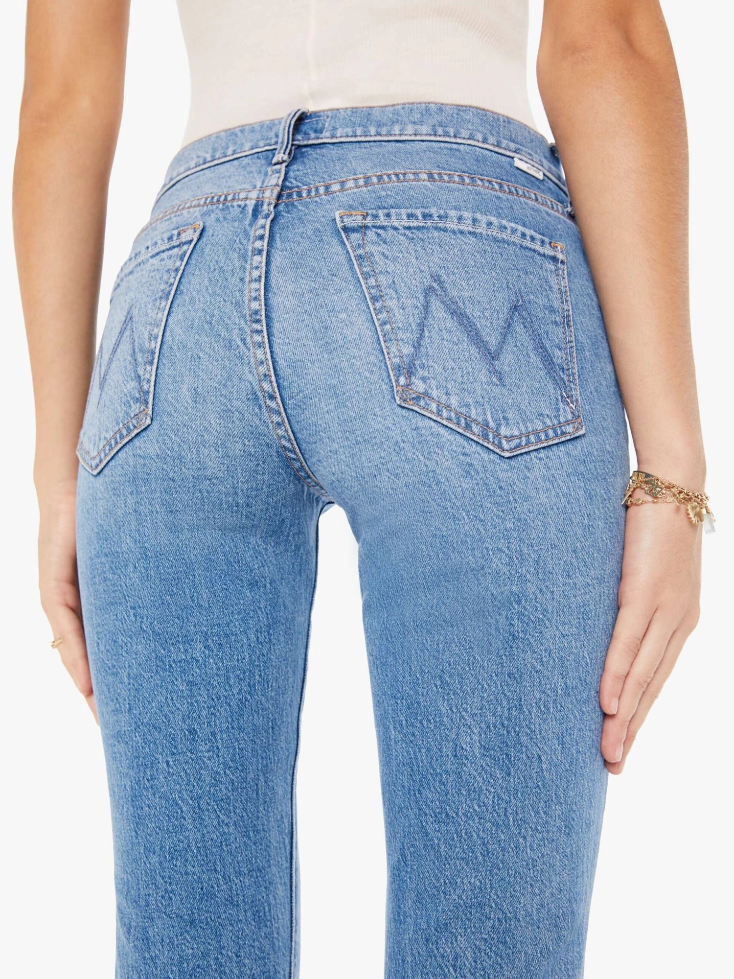 I kid you not. Narrow flare jeans with a mid rise and a long 32-inch inseam with a clean hem. Made from denim with a touch of stretch, For Sure is a mid-blue wash with whiskering and fading at the knee.