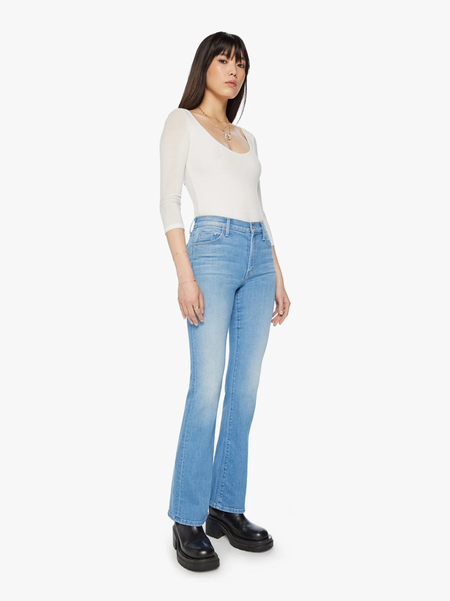 Halfsies. Narrow flare jeans with a mid-rise and a long 32-inch inseam with a clean hem. Crafted from denim with a touch of stretch, Going Dutch is a bright light-blue wash with fading and whiskering.