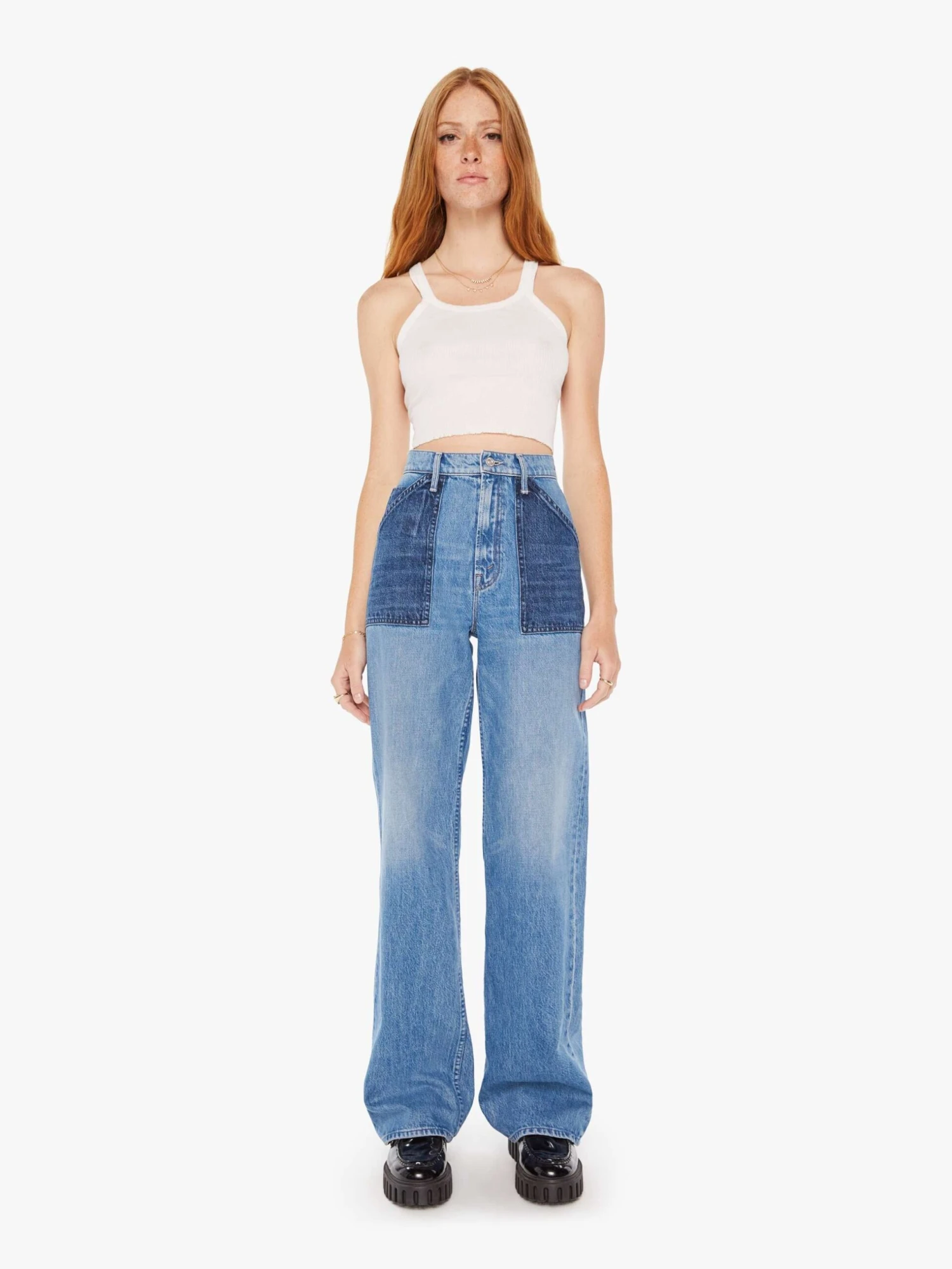 Three’s a crowd. Super high-waisted jeans with a loose fit, wide leg, contrasting patch pockets and 34-inch inseam with a clean hem. Made from SUPERIOR 100% cotton, Love Triangle is a mid-blue wash with subtle whiskering, fading and darker denim pockets.