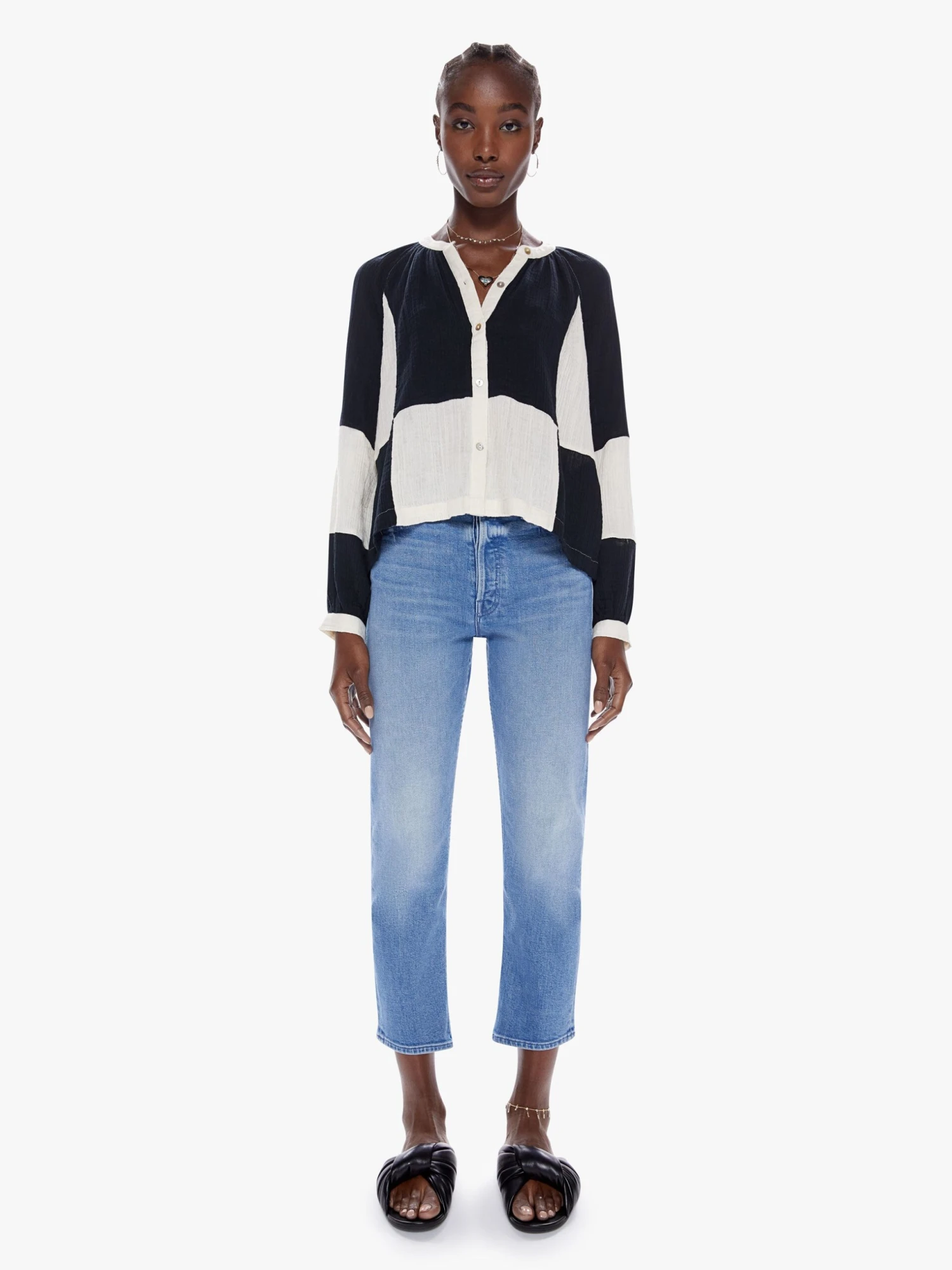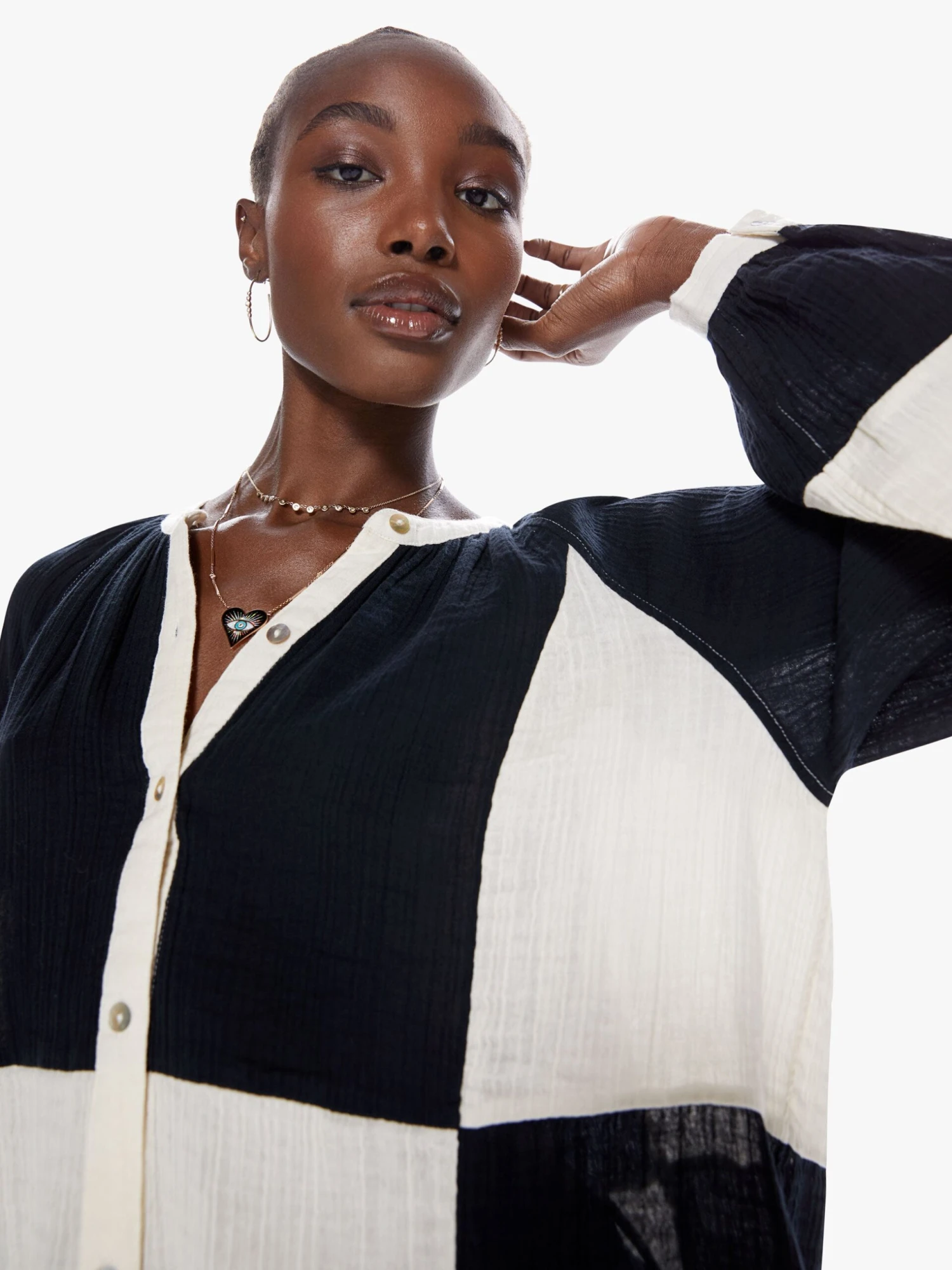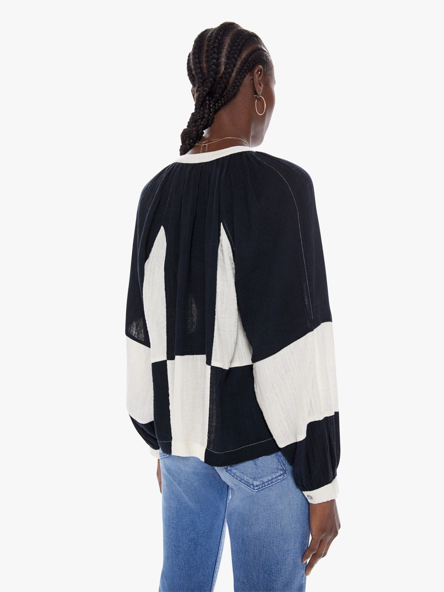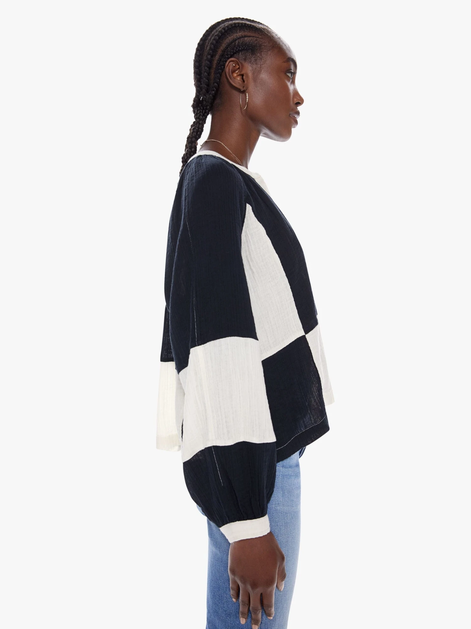 Be fast or be last. A patchwork blouse with buttons down the front, long gathered sleeves and soft ruffles around the neckline for a flowy fit. Made from lightweight 100% cotton, Homestretch is an oversized black and white checkered design reminiscent of the flags at a raceway’s finish line.