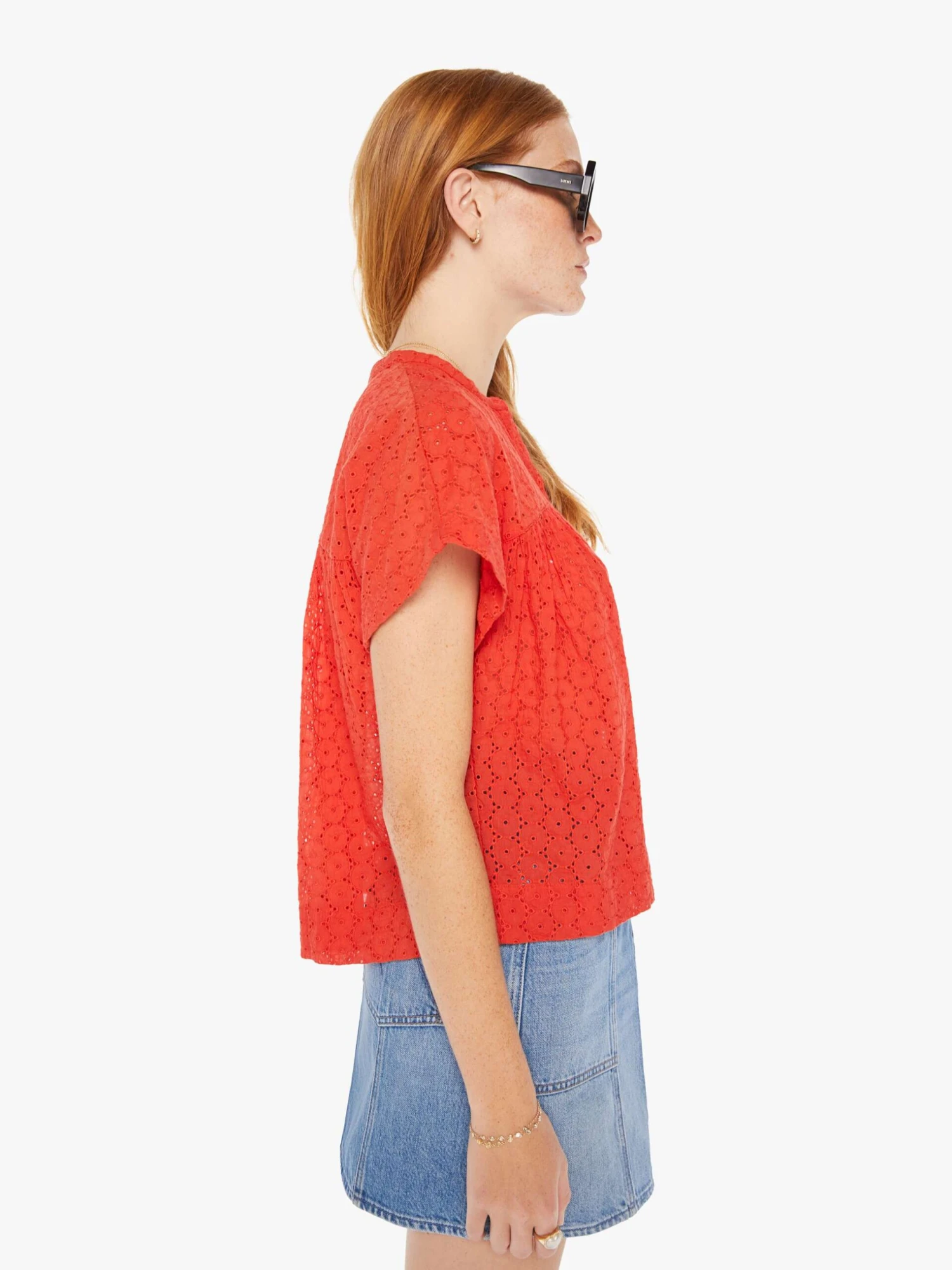 Red flag. A lightweight blouse with a buttoned V-neck, short boxy sleeves and ruffles across the chest for a loose, flowy fit. The top is made from 100% cotton in red with eyelet details and shell buttons.