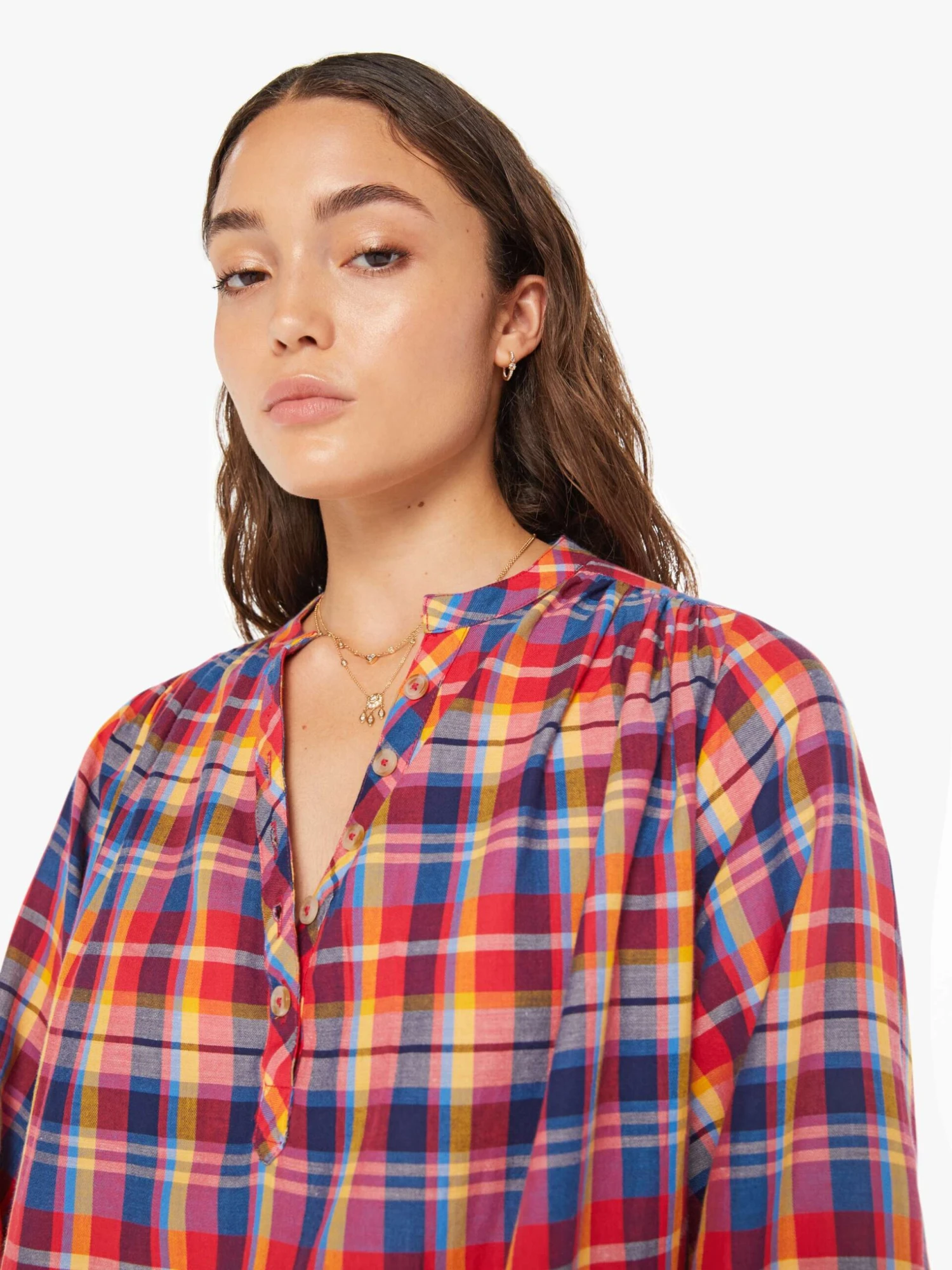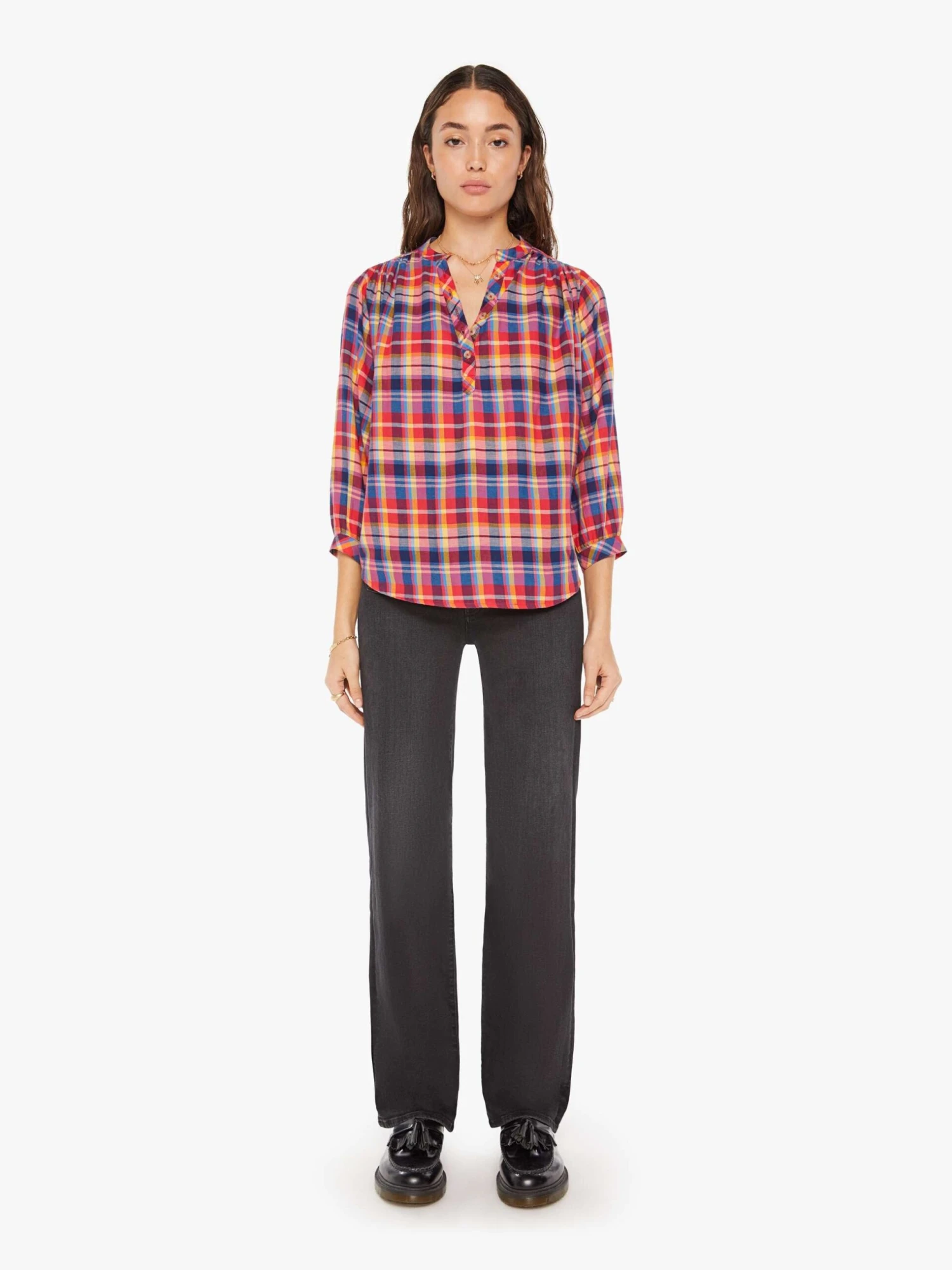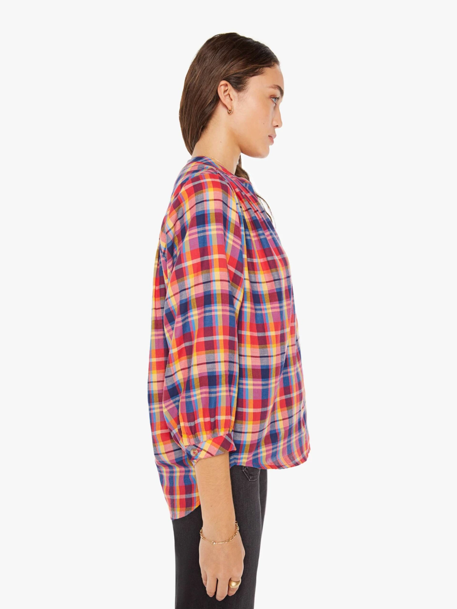Plaid you’re here. A lightweight blouse with a buttoned V-neck, 3/4-length balloon sleeves, a curved hem and ruffles throughout for a loose, flowy fit. The top is made from 100% cotton in a hot pink, yellow, and blue plaid with horn-inspired buttons.