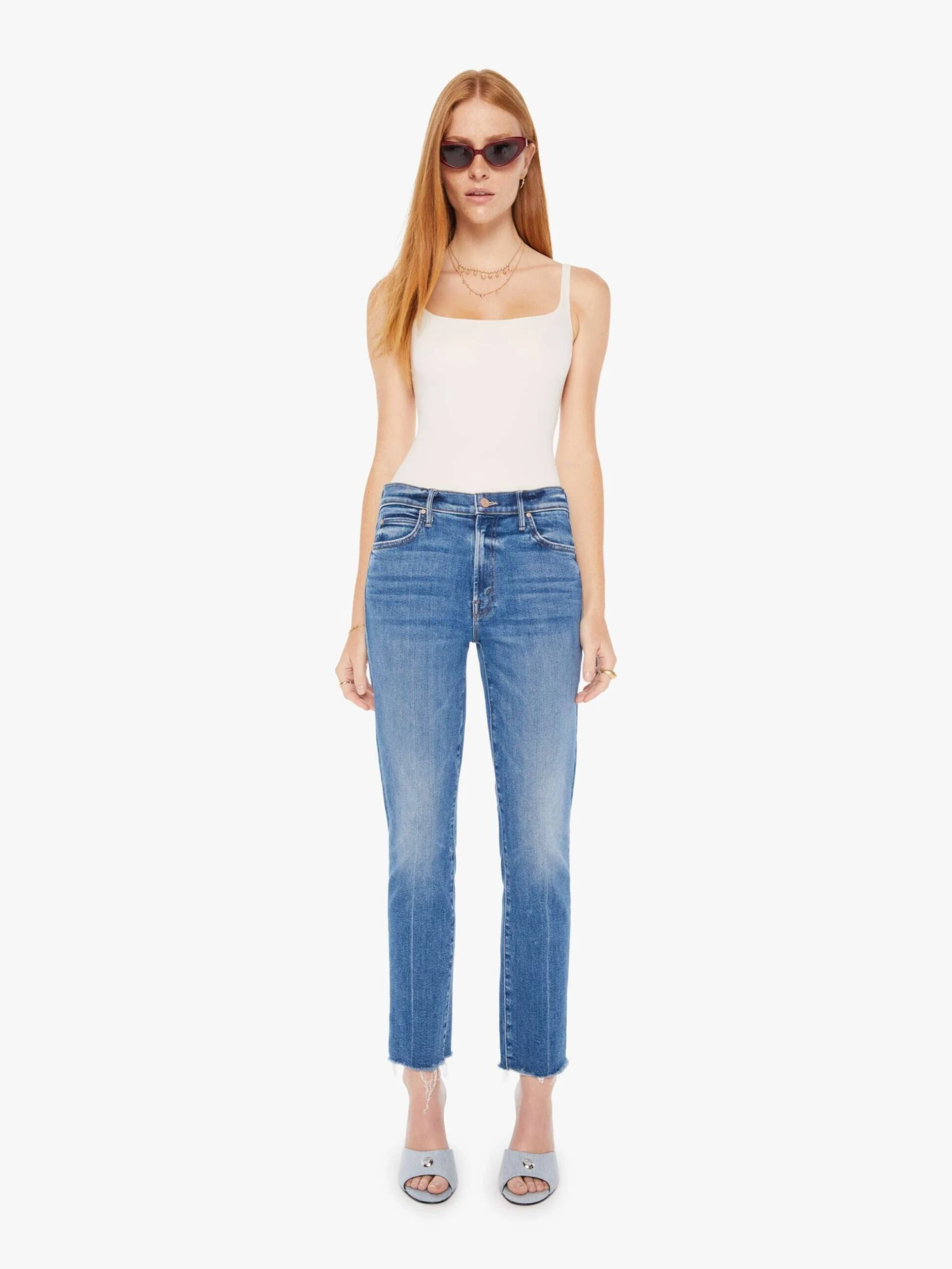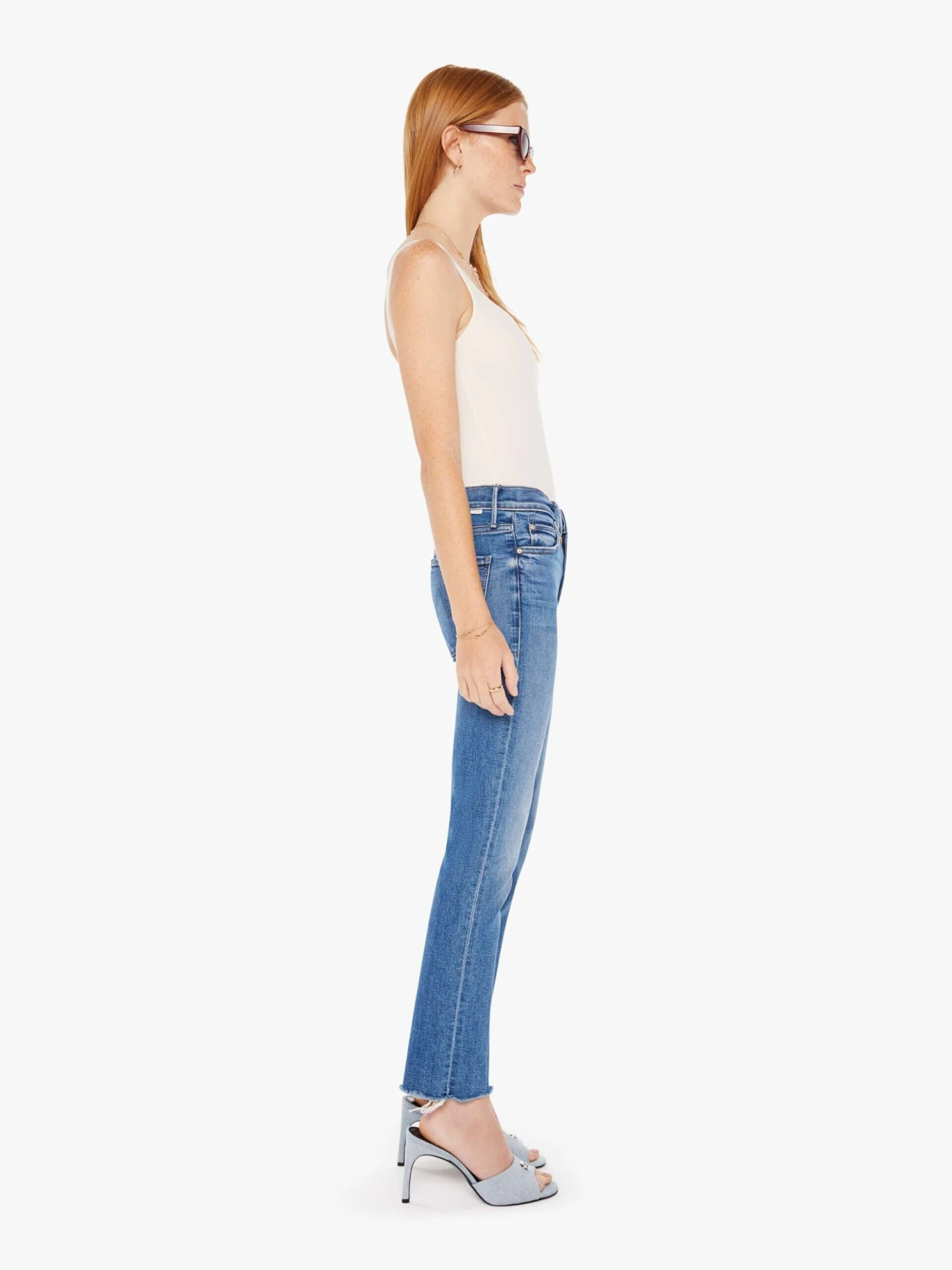 Drawn together. A mid-rise straight leg with an ankle-length inseam and a frayed hem. Cut from denim with a touch of stretch, Opposites Attract is a mid-blue wash with whiskering and fading at the knee.