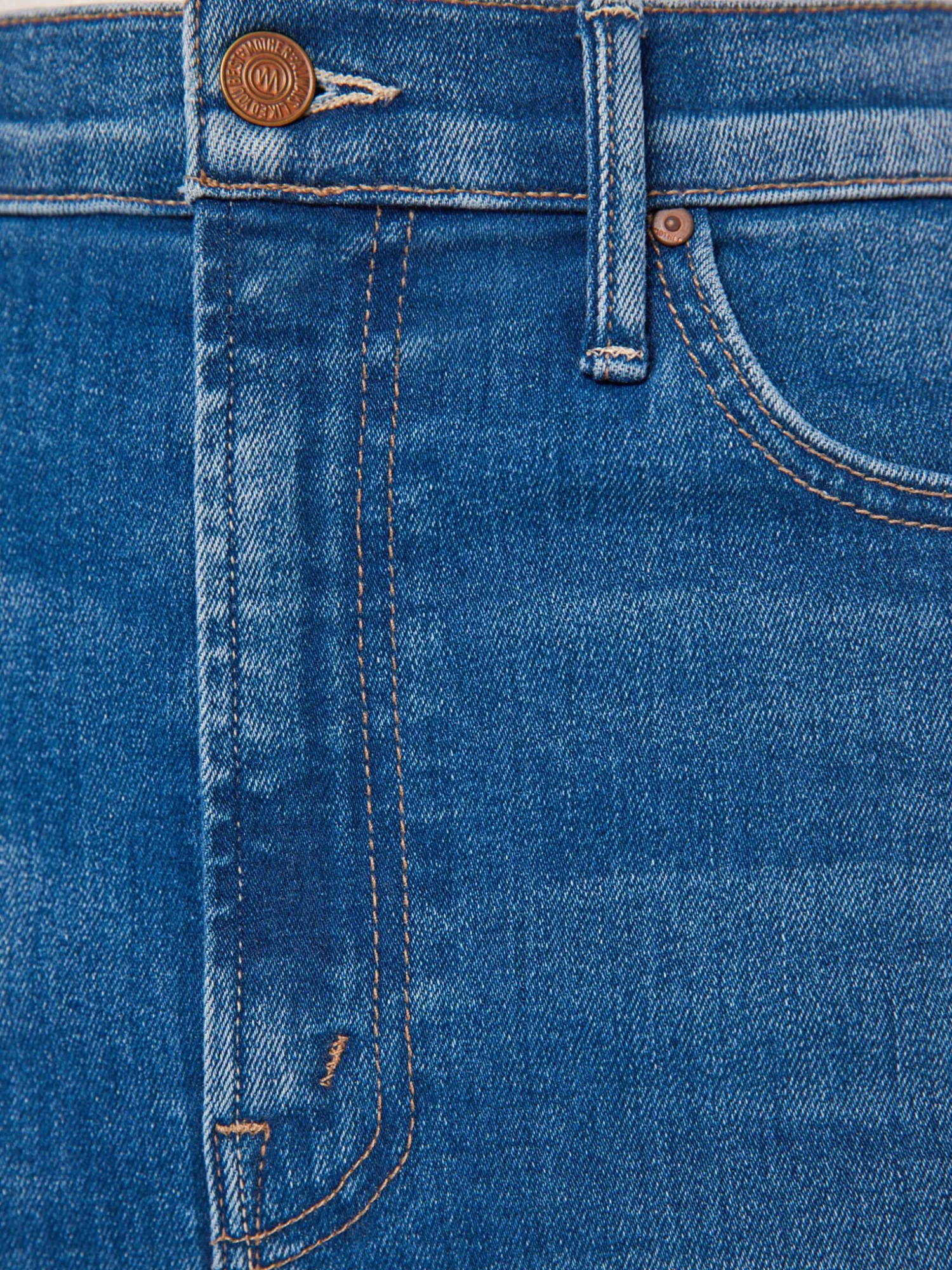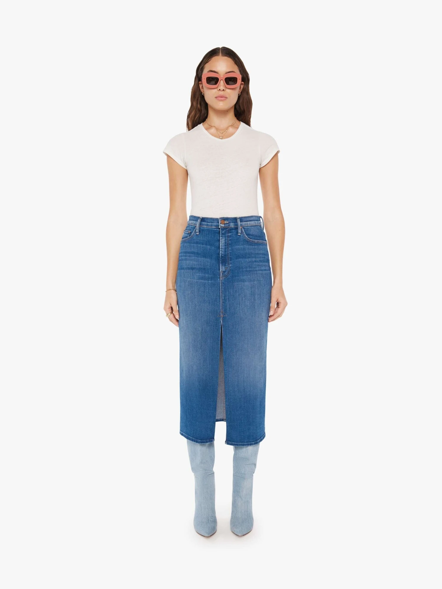 You know hue. A denim pencil skirt with a high rise, narrow fit and a thigh-high front slit. Cut from stretch denim, Hue Are You? is a mid-blue wash with whiskering and subtle fading.