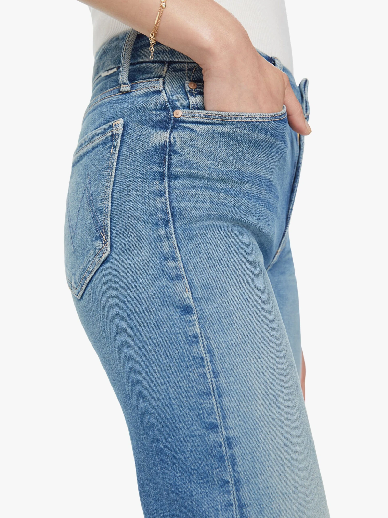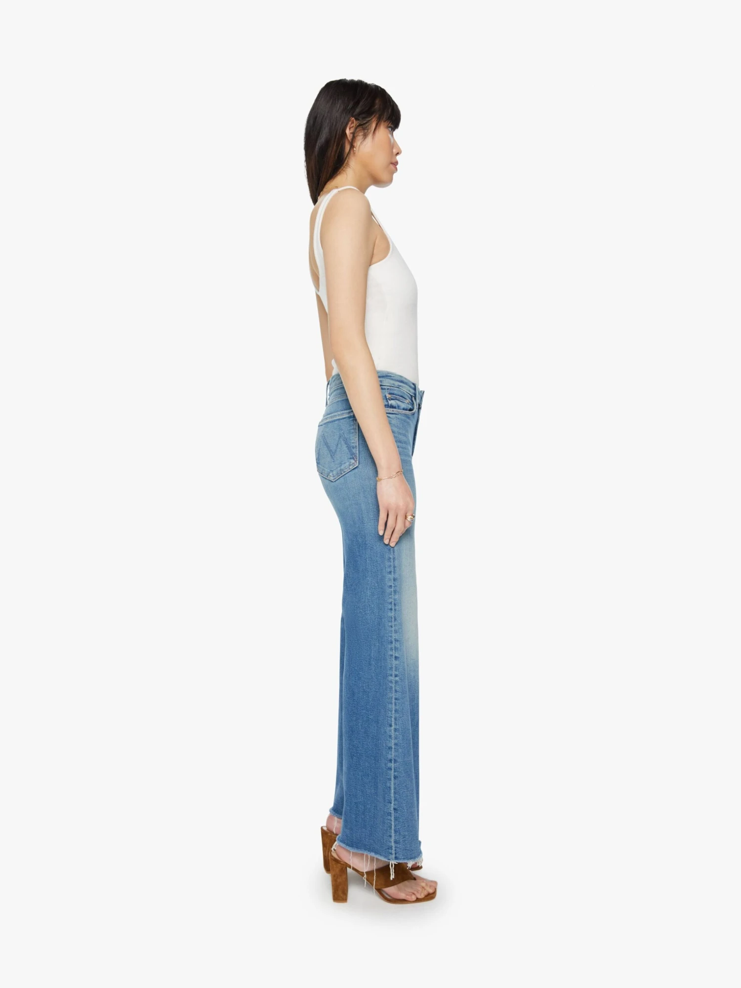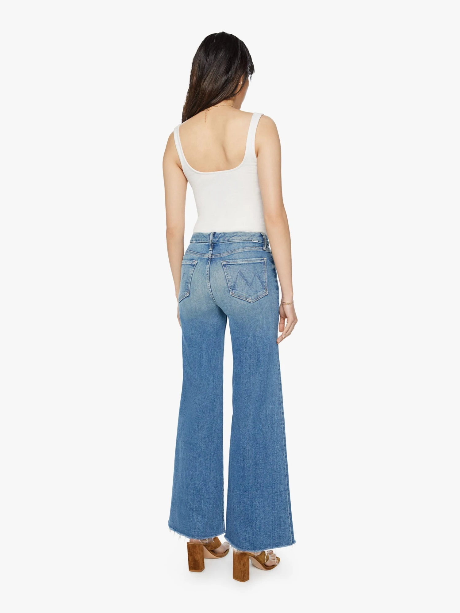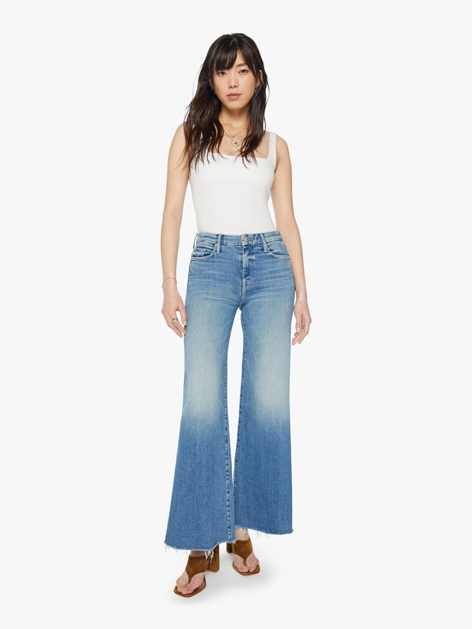 A real cliffhanger. This iconic high-waisted wide leg has a 31-inch inseam and a frayed hem. Cut from stretch denim, Riding The Cliffside is a mid-blue wash with whiskering and fading.